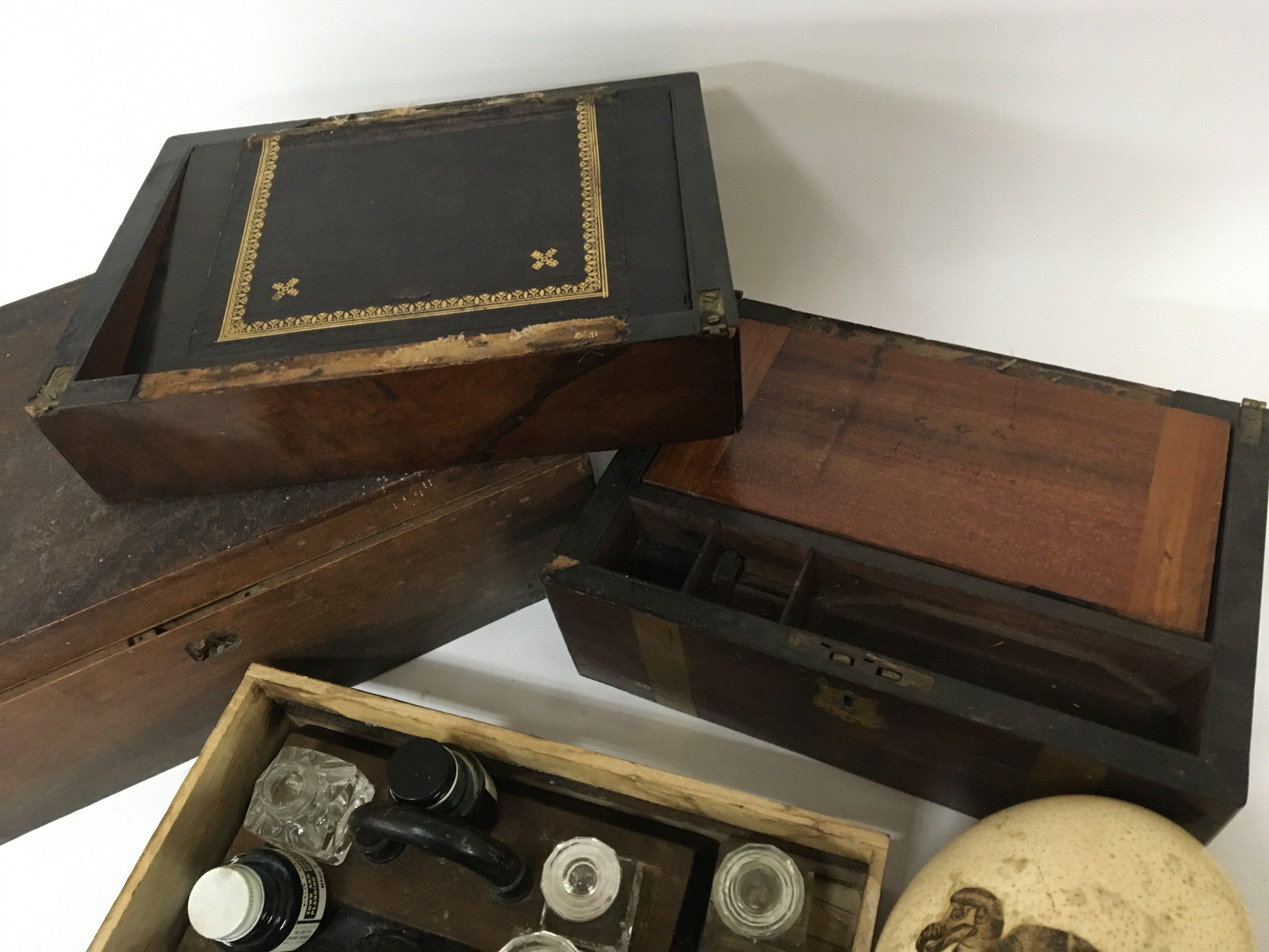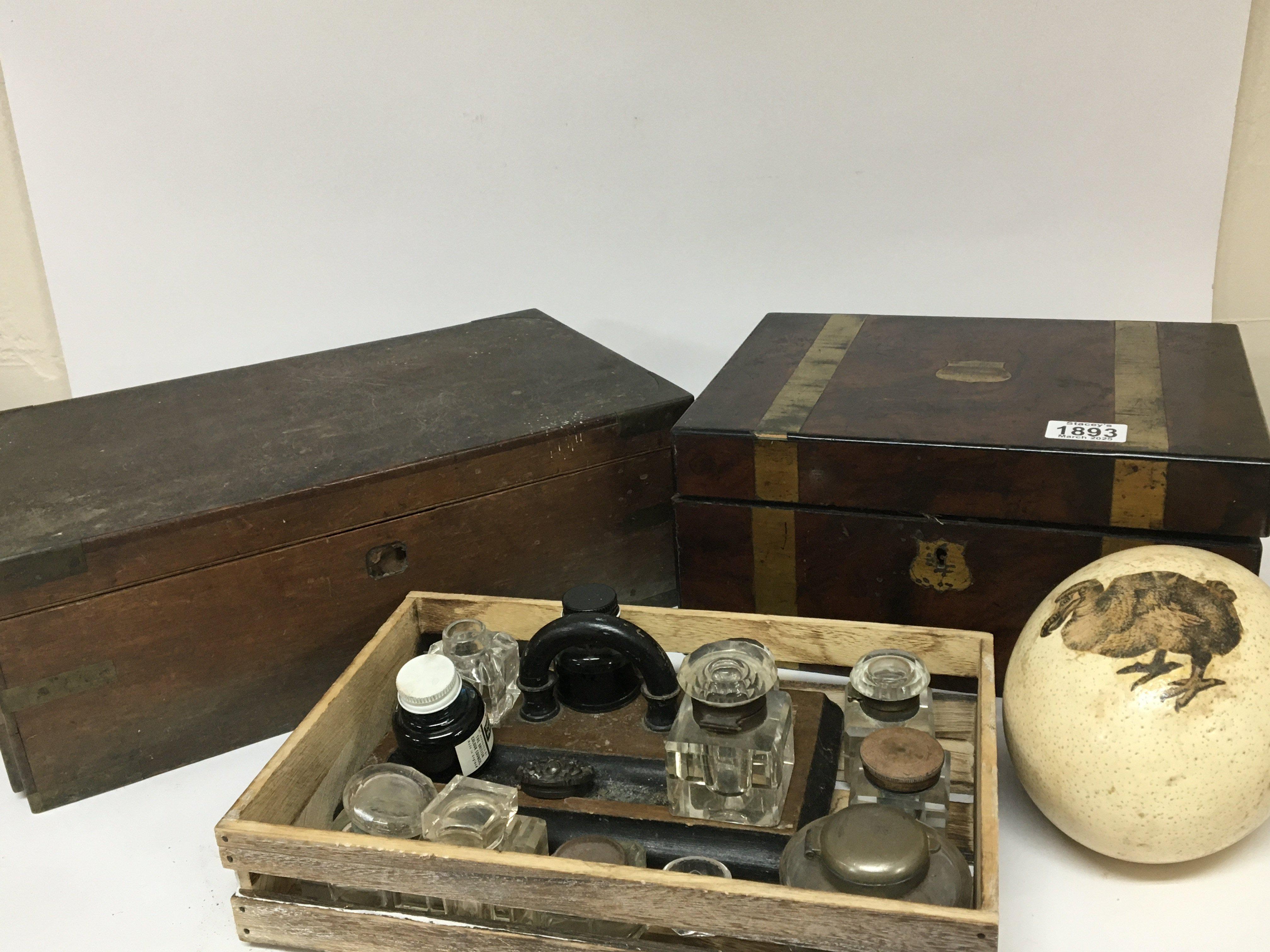 A walnut late Victorian brass bound writing box and a George III mahogany writing box both for restoration a collection of ink well bottles and an ostrich egg.