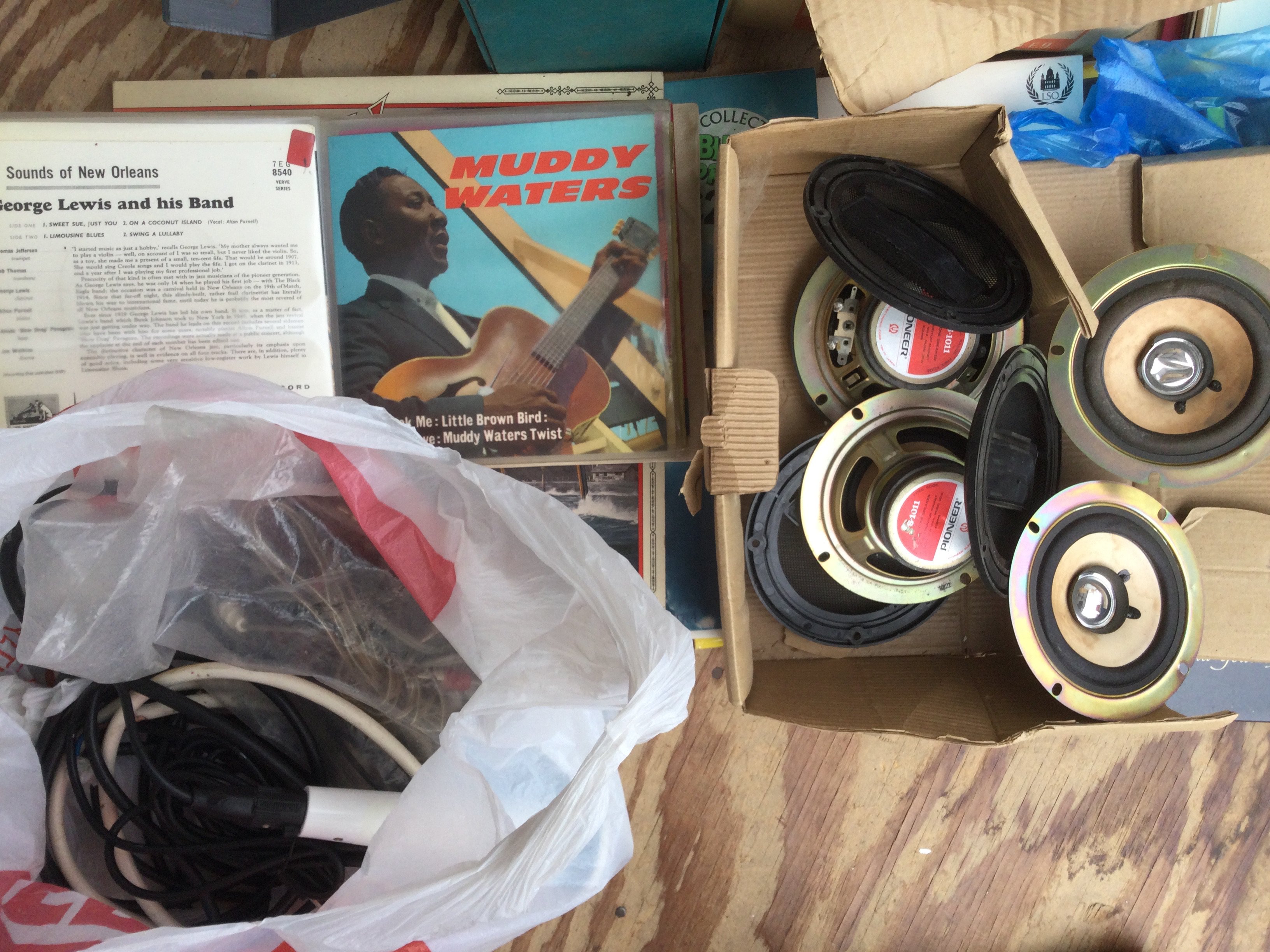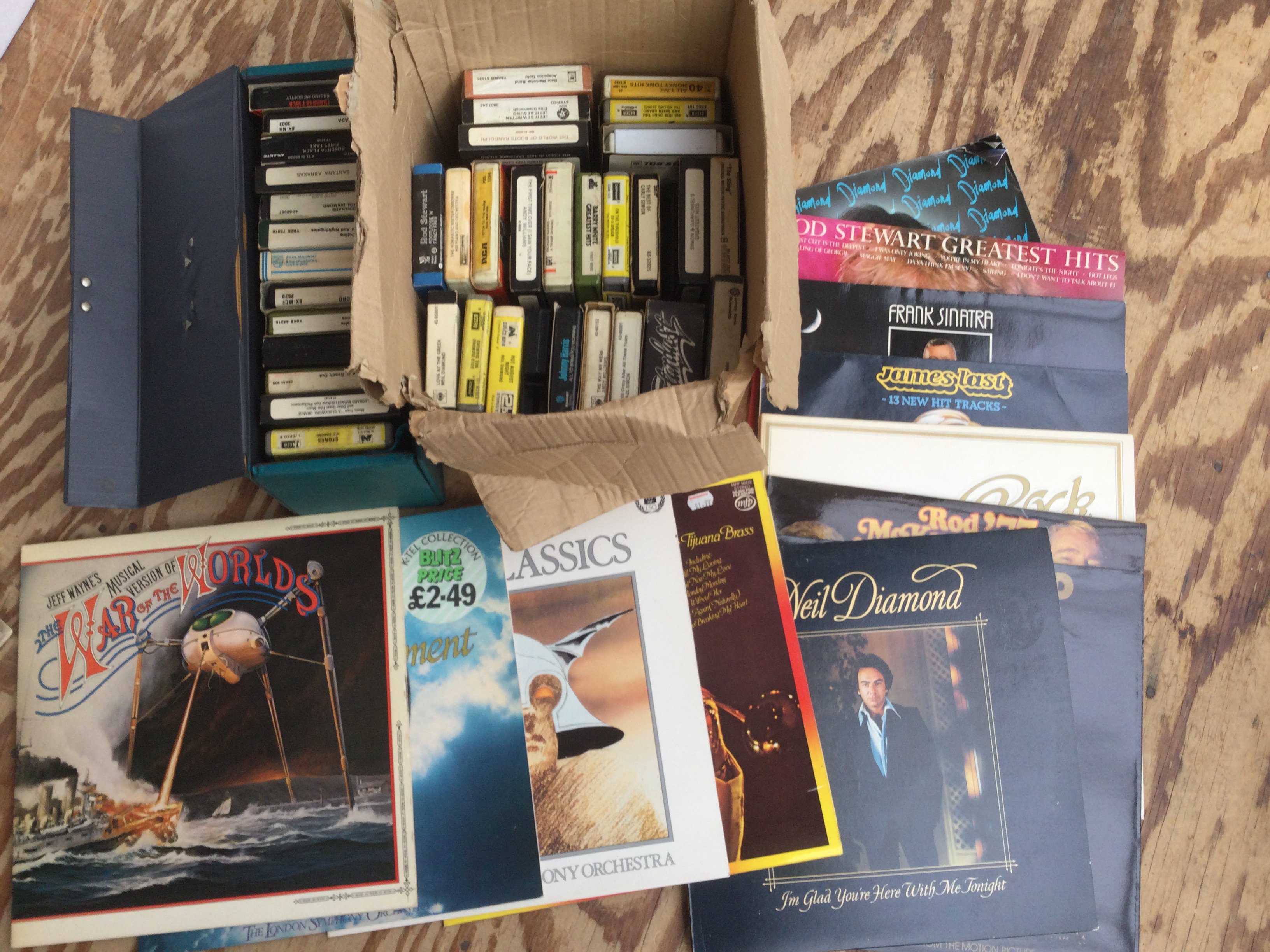 An assortment of vintage HiFi including a Hitachi 8 track player with cartridges, an in car 8 track player with speakers, a Trio KR-7400 stereo receiver, Kenwood turntable plus some LPs, EPs and 7" singles by various artists.