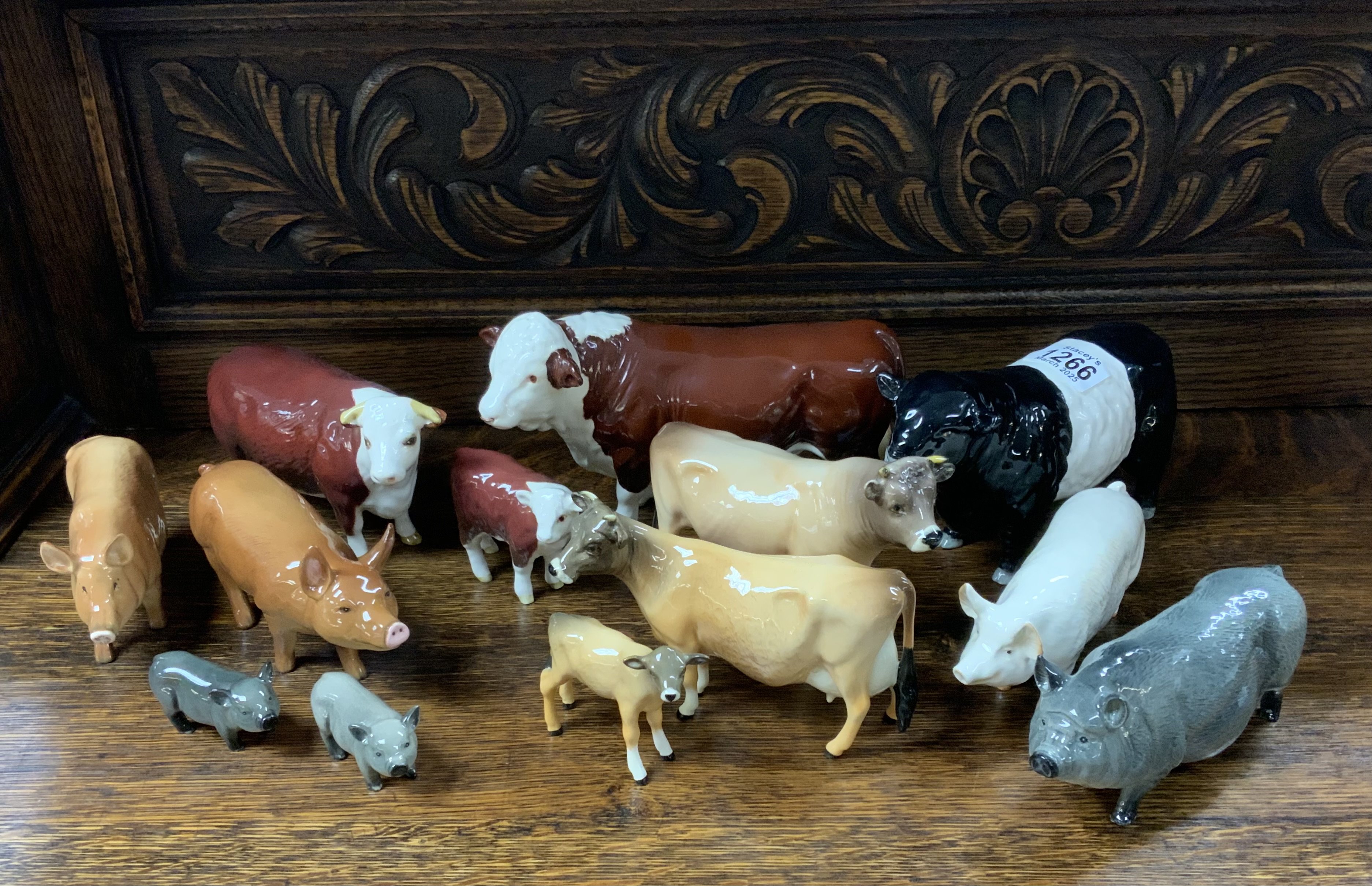 A collection of Beswick and Royal Doulton ceramic pigs and cows.