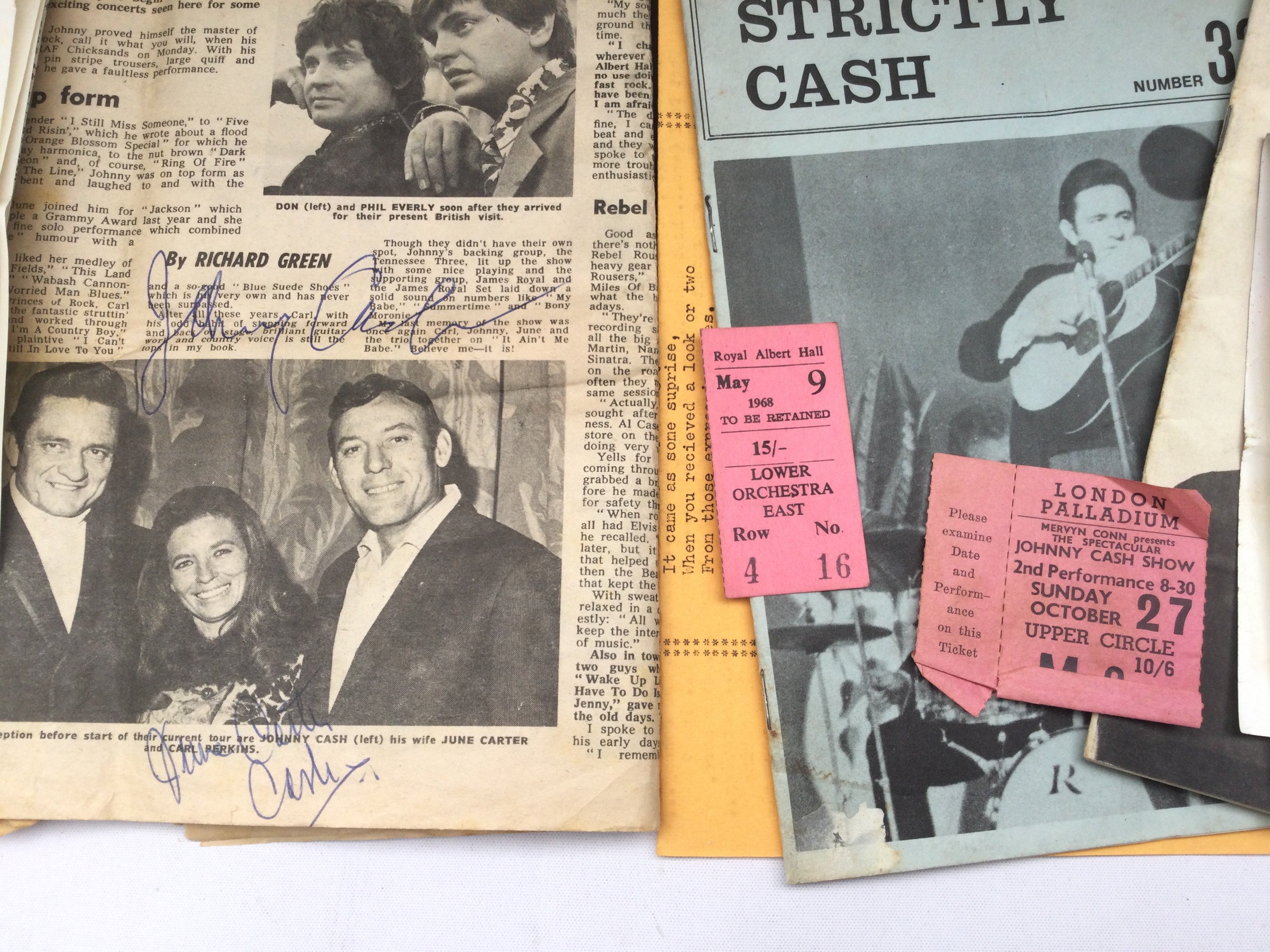 A newspaper page signed by Johnny Cash and his wife June Carter Cash plus a collection of mainly Johnny Cash memorabilia including two show tickets, fanzines etc.