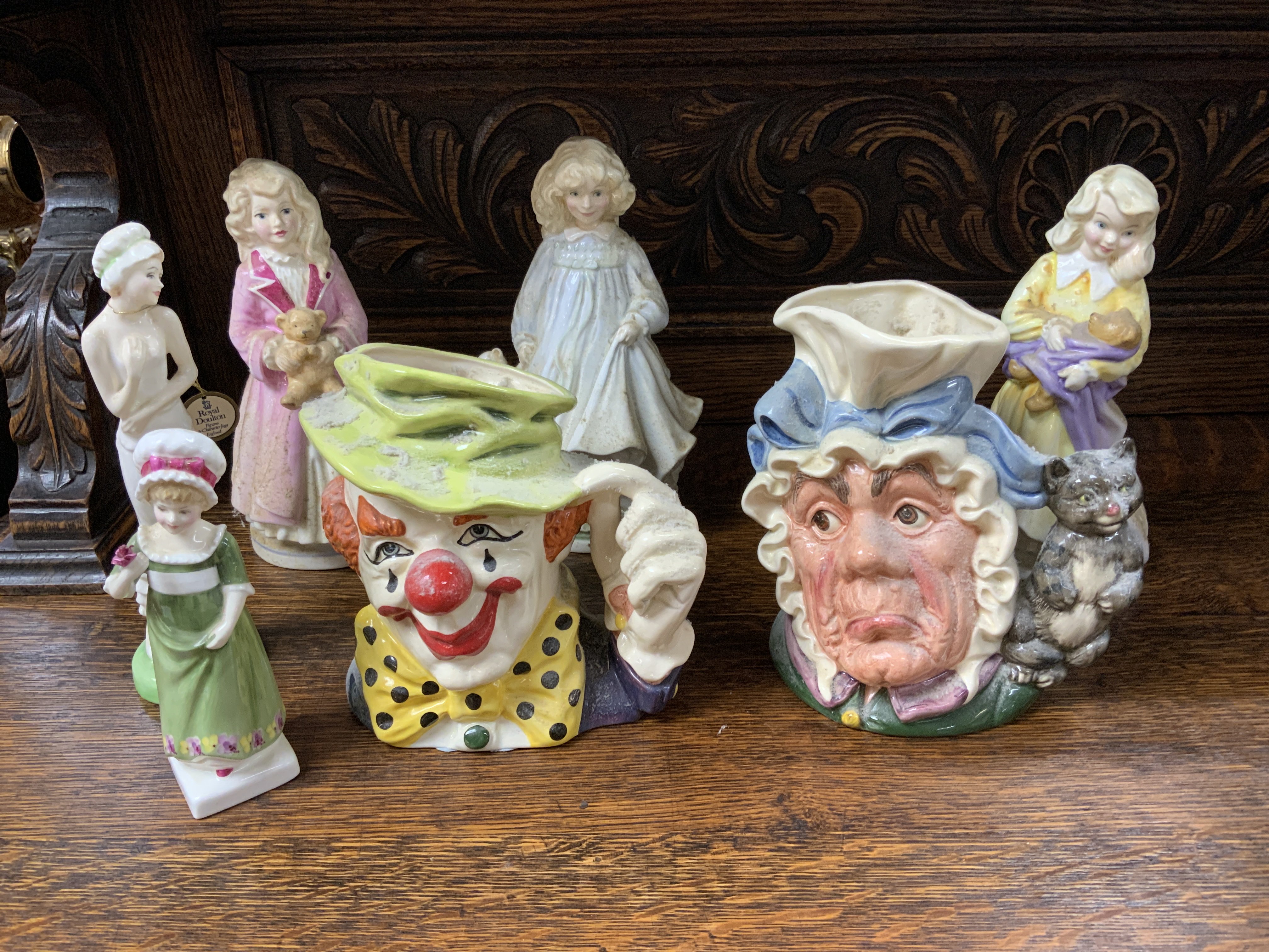 A collection of Royal Doulton ceramics to include figurines, and character jugs, and a large ceramic Magnella design wall plate.