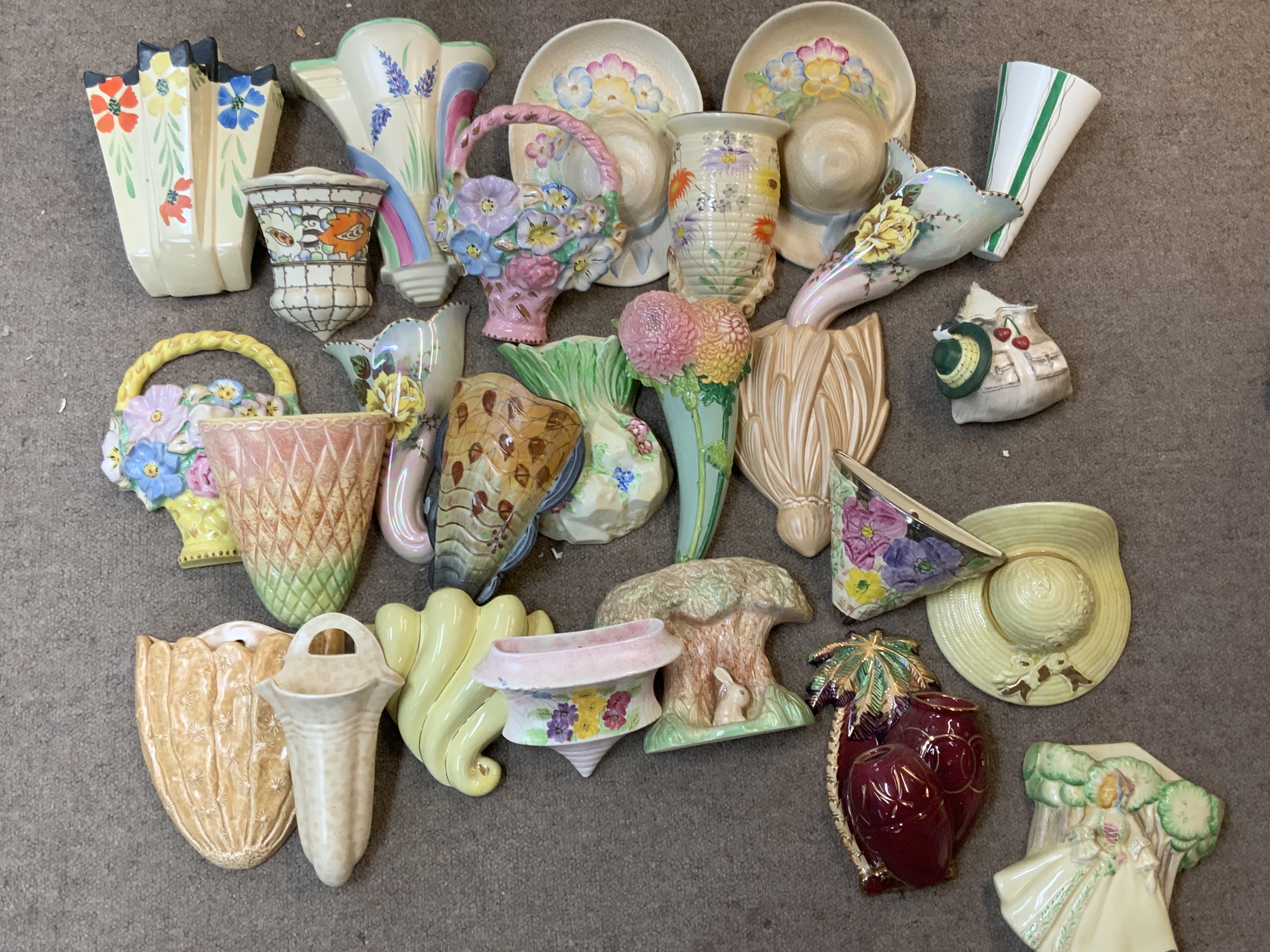 A collection of 1930s ceramic wall pockets. Inc Clarice Cliff, Shorter, Crown Ducal etc.