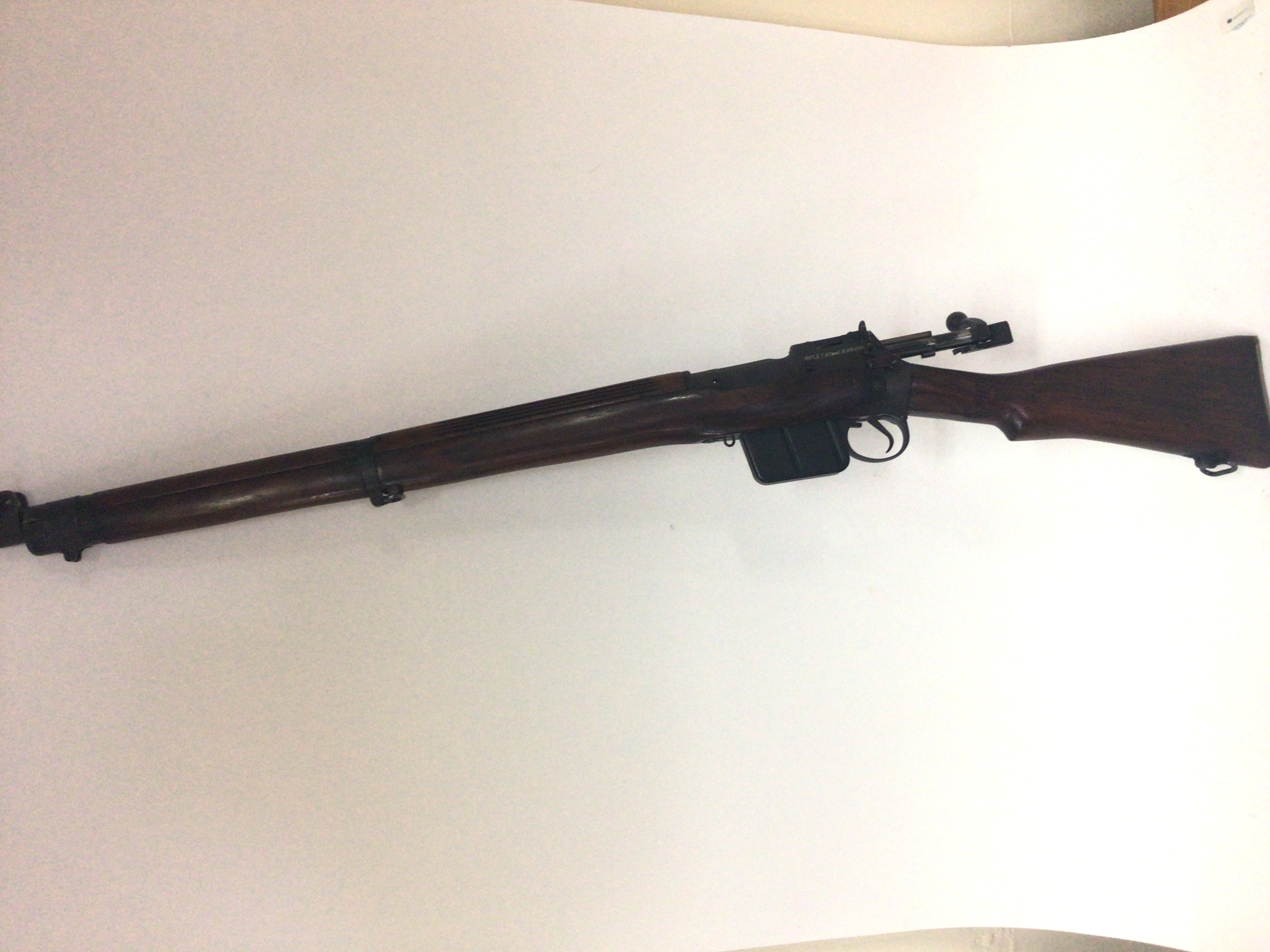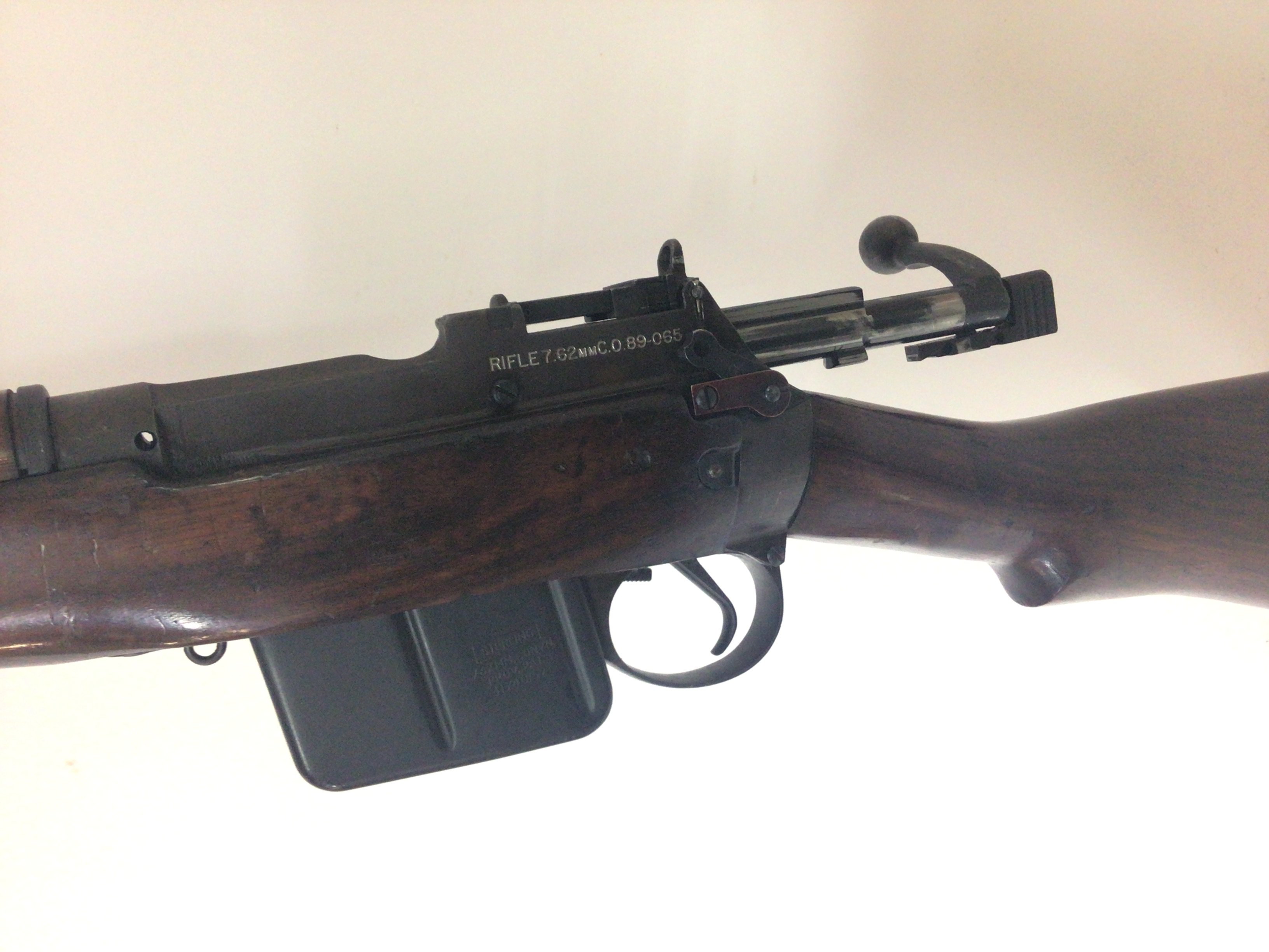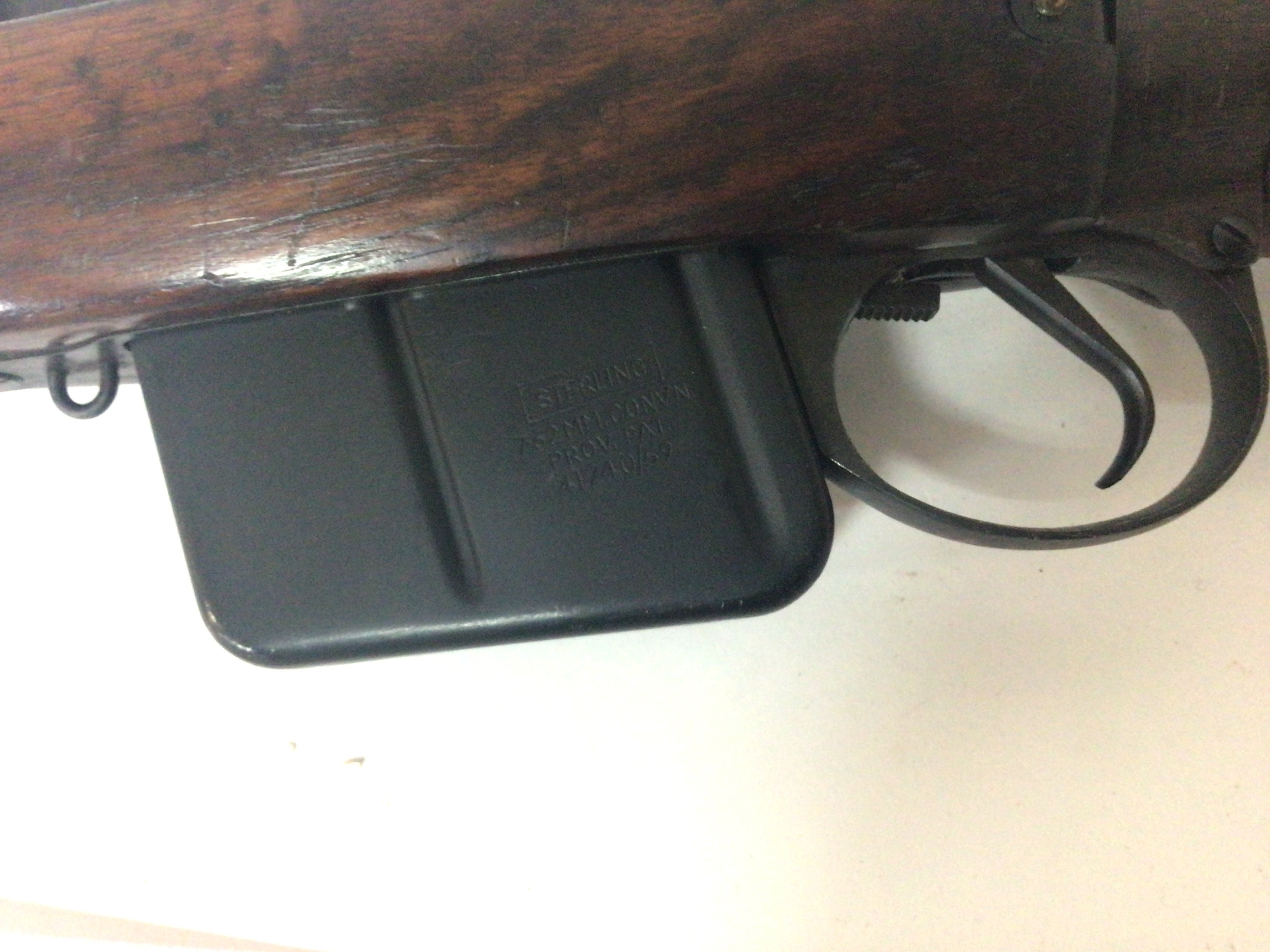 A Vintage Enfield Rifle caliber bolt action with standard Sterling magazine full length stock cal 7.62mm The gun in good functionality condition and maintains original stock patina. Serial number CO 89-065 A FIRE ARMS LICENSE IS REQUIRED TO BID AND BUY THIS LOT.VIEWING AND COLLECTION BY APPOINTMENT ONLY.