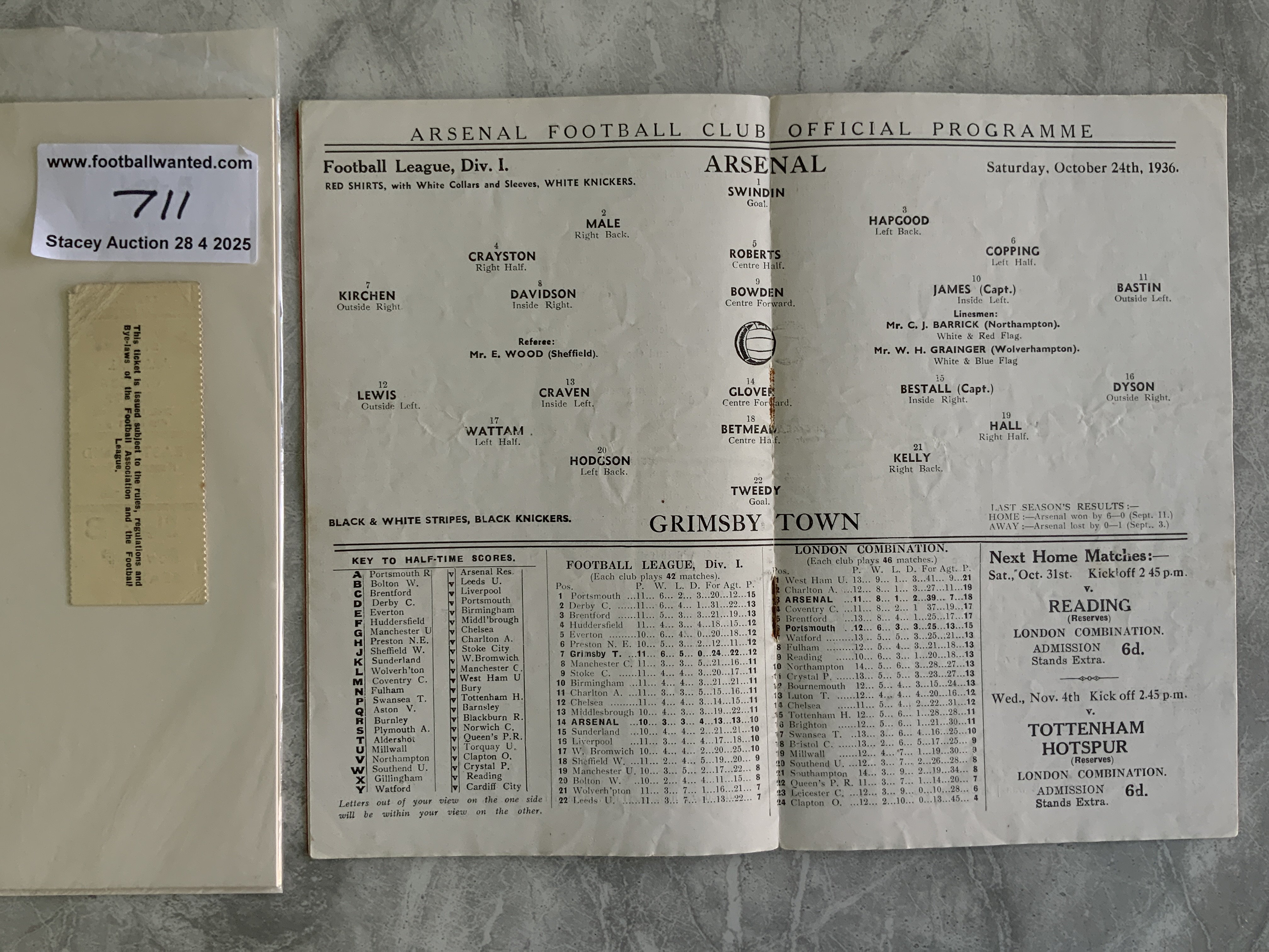 36/37 Arsenal v Grimsby Town Football Programme + Ticket: Inauguration of the East Stand match dated 24 10 1936. Incredibly the ticket is for the East Stand so it will be the first match in the newly built stand. Both good. (2)