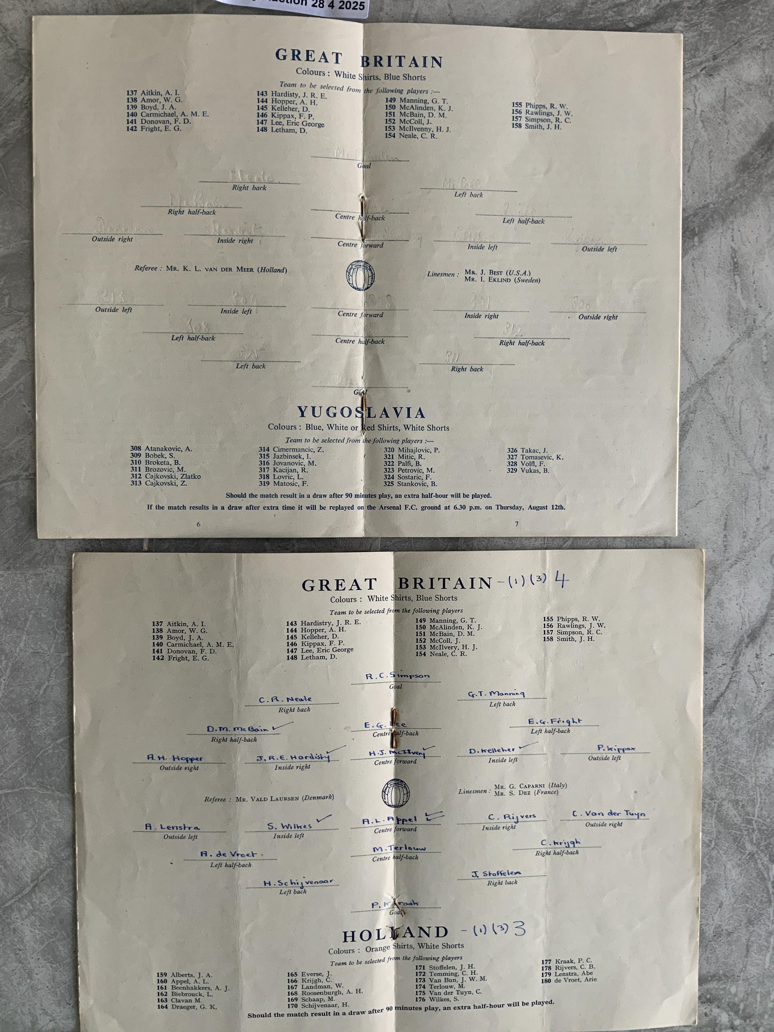 1948 Olympics Football Programmes: Great Britain v Holland at Arsenal with teams filled in and semi final at Wembley between Yugoslavia and Gt Britain. Very good. (2)