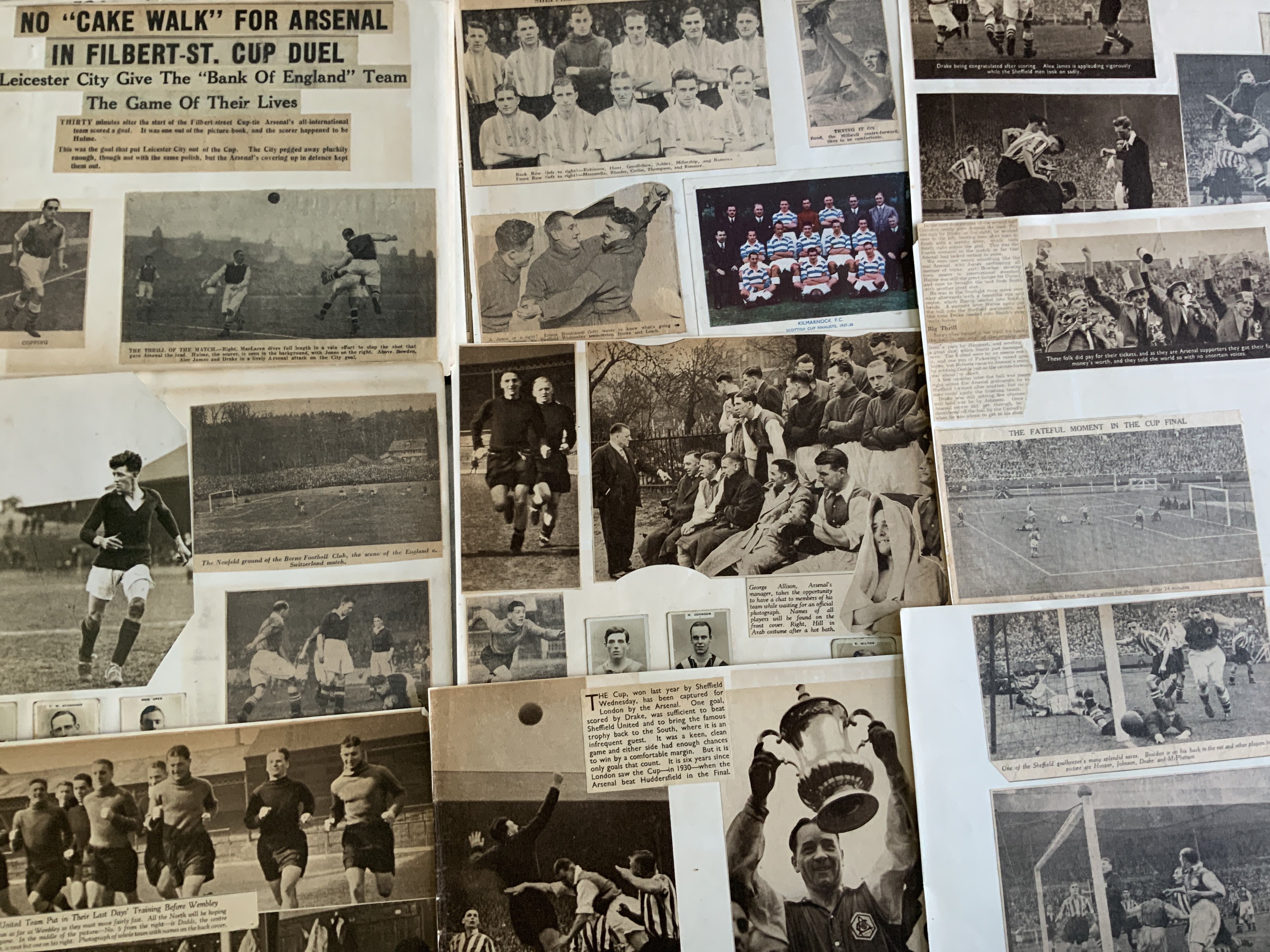 Pre War Arsenal Football Scrapbook: Pages removed from scrapbook with original newspaper reports of famous matches including 1927 + 1936 FA Cup Final, 1933 defeat to Walsall, 1935 Leicester FA Cup and more. 17 pages mostly relating to Arsenal with some pages having more to rear.