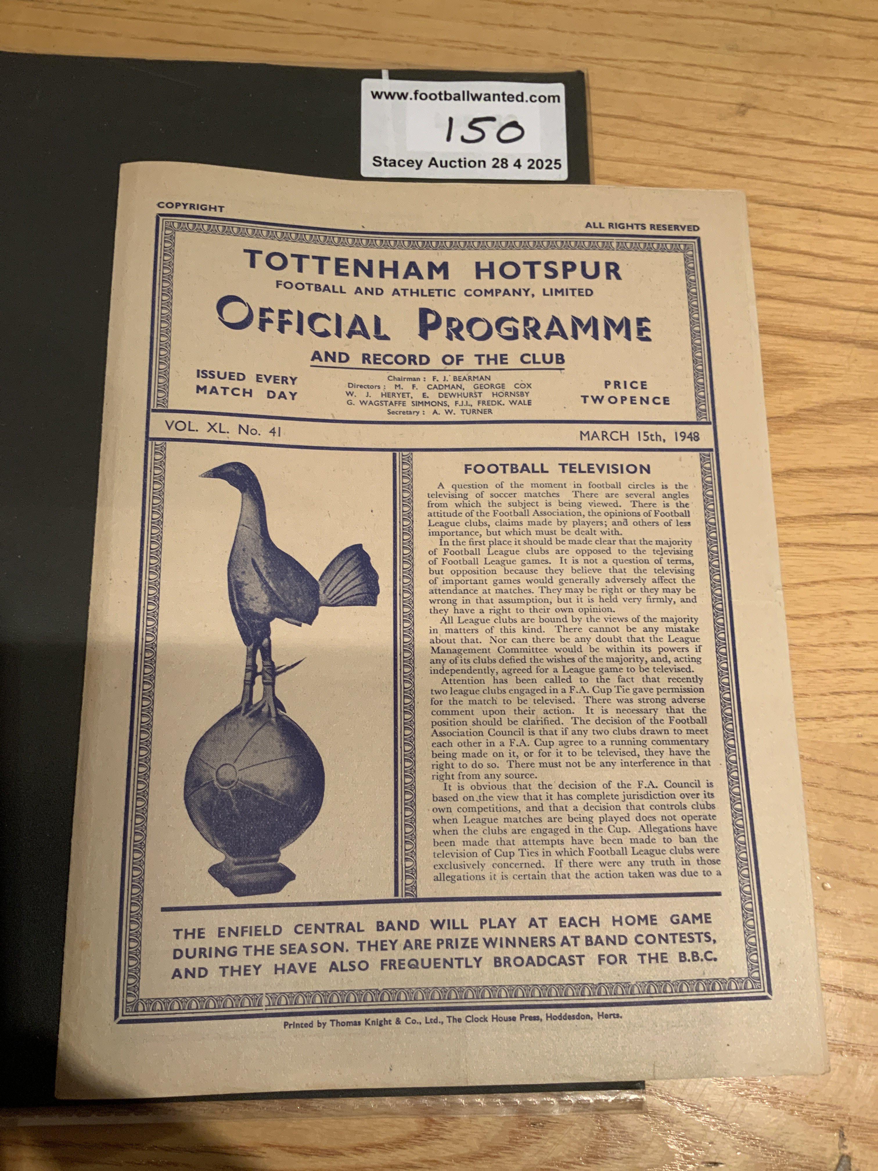 47/48 Tottenham Fully Signed Football Programme: Excellent condition home programme v Barnsley fully signed to team page by the whole Spurs line up including Bill Nicholson.