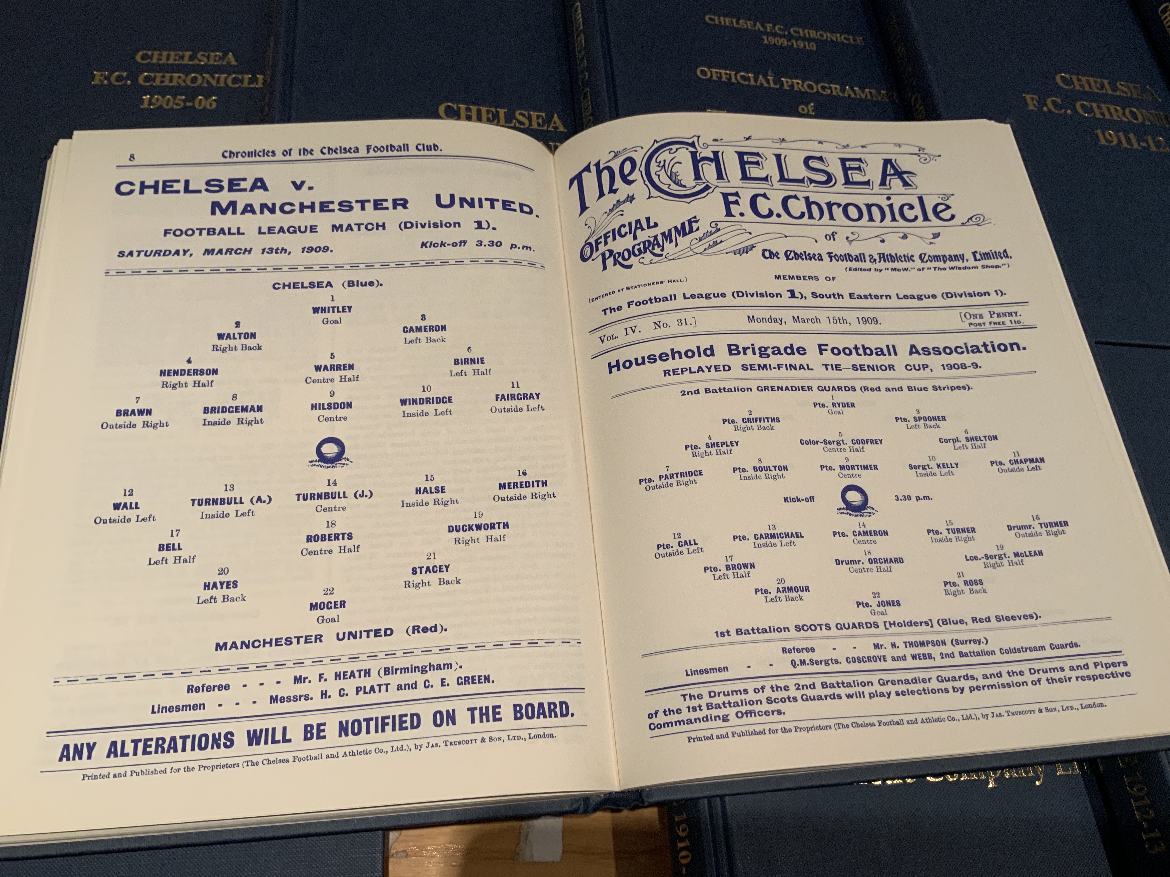 Chelsea Pre 1st World War Replica Bound Football Programmes: Chelsea Chronicles from 1905/06 to 1914/15 plus the volume of 2nd World War programmes from 1939 to 1946. (11 volumes)