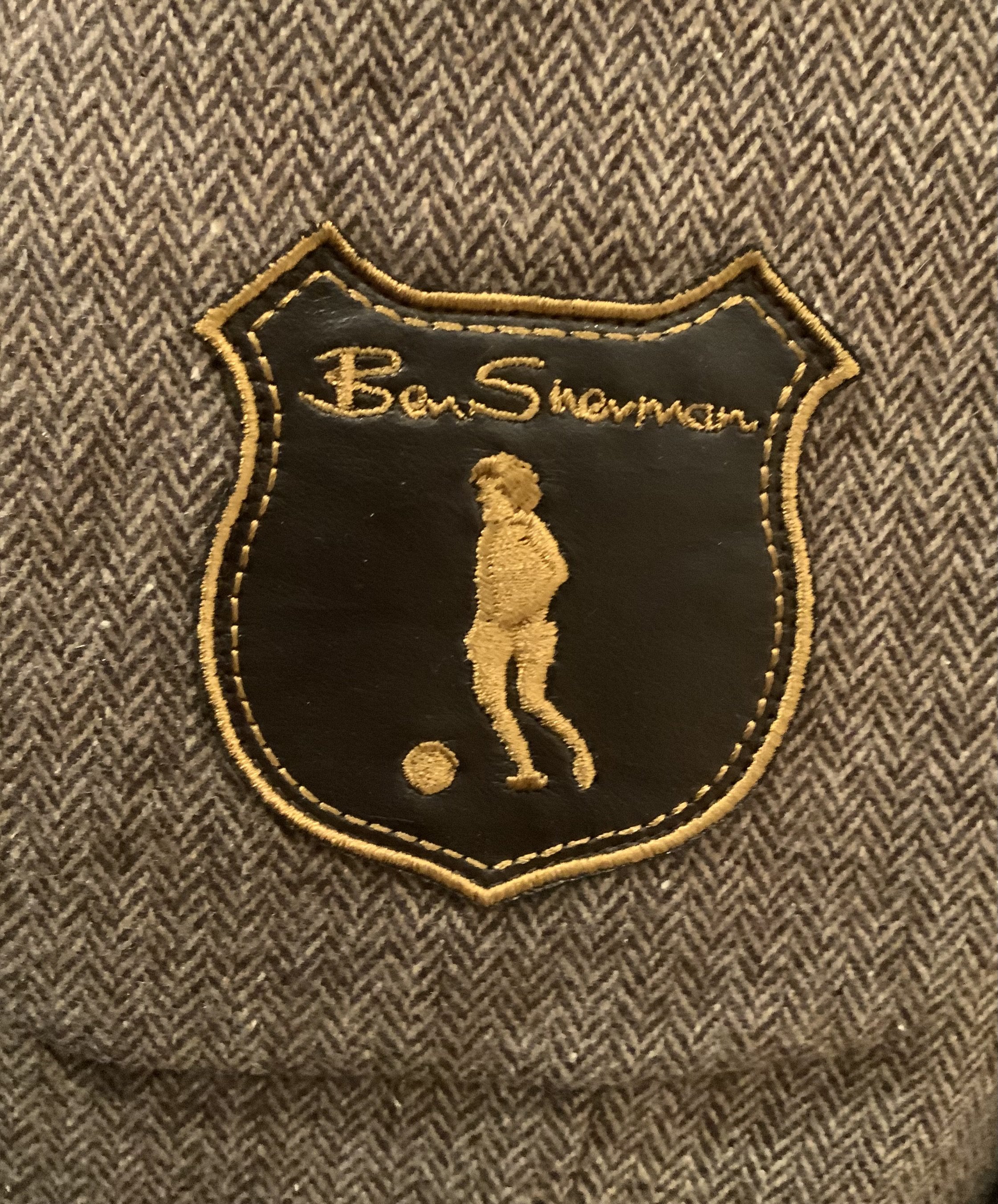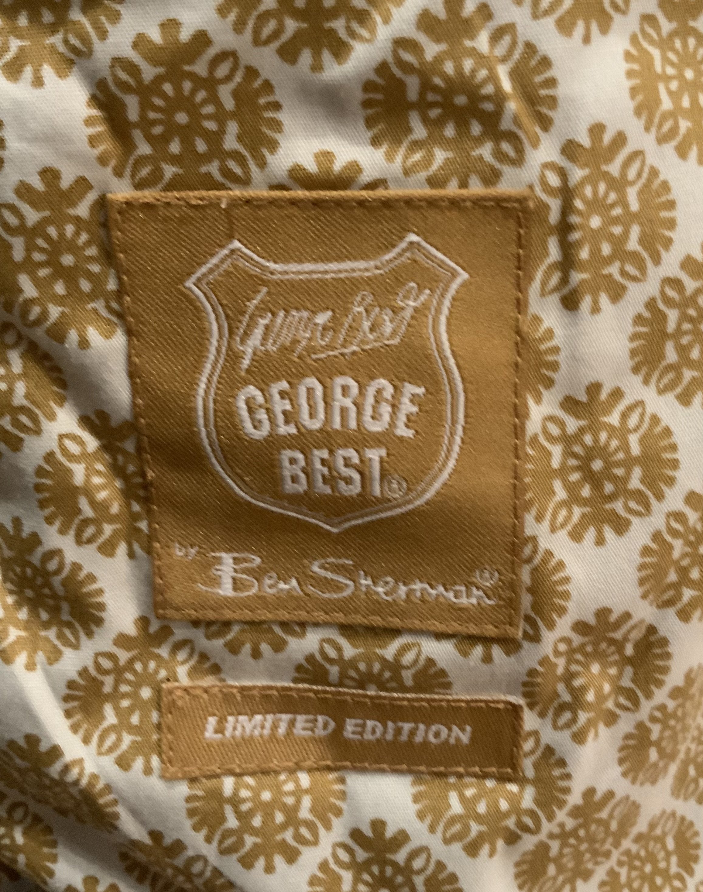 George Best Boutique Blazer: Stunning brand new condition brown herring bone style blazer with leather affect breast having George Best silhouette under the word Ben Sherman. Lined with image of Best and label stating George Best Ben Sherman Limited Edition. Could be worn today.