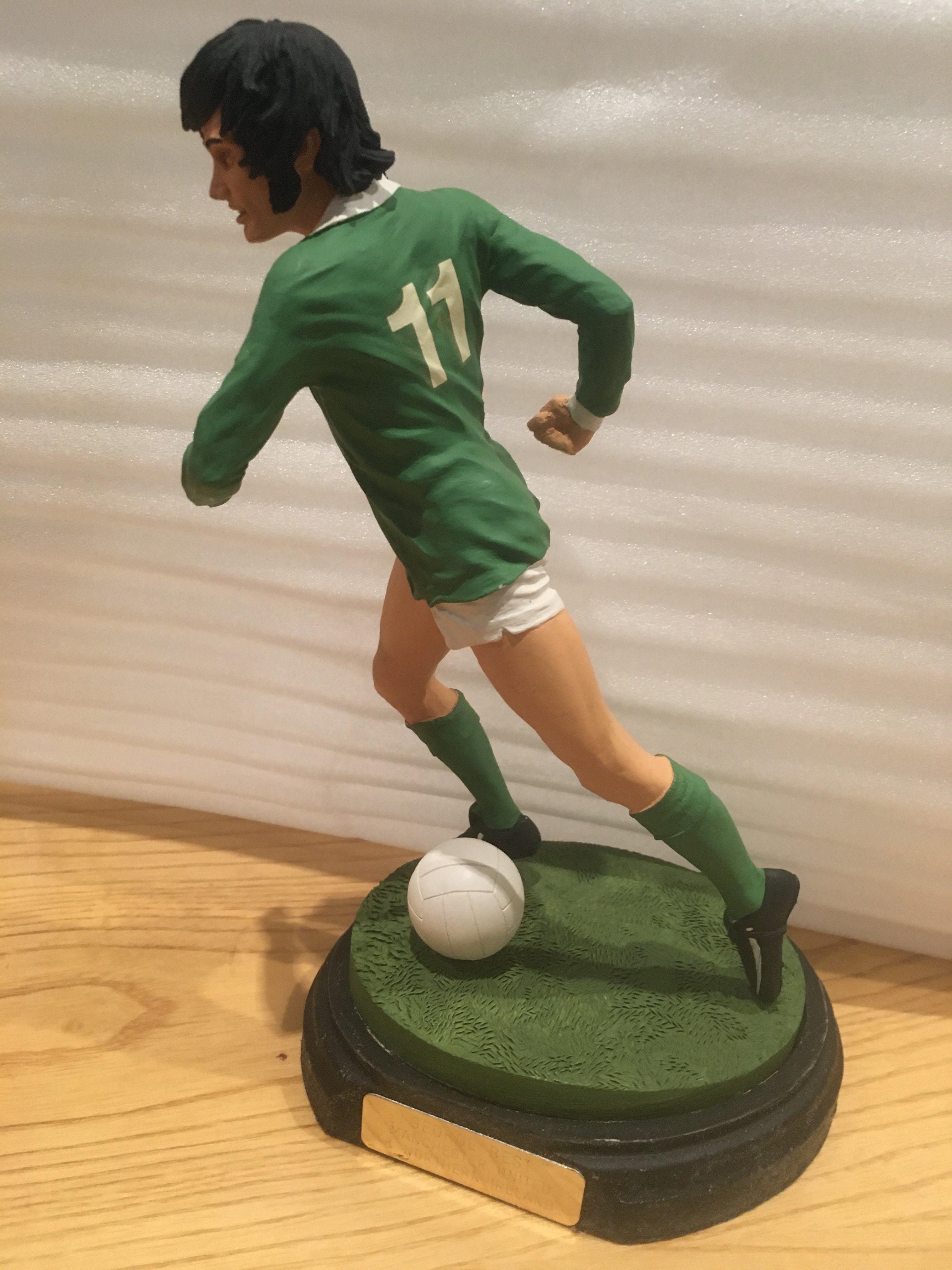 George Best Northern Ireland Football Figure: Excellent lifelike figure featuring Best In Northern Ireland kit wearing number 11. Sitting on base with plaque measuring 9 inches high including base.