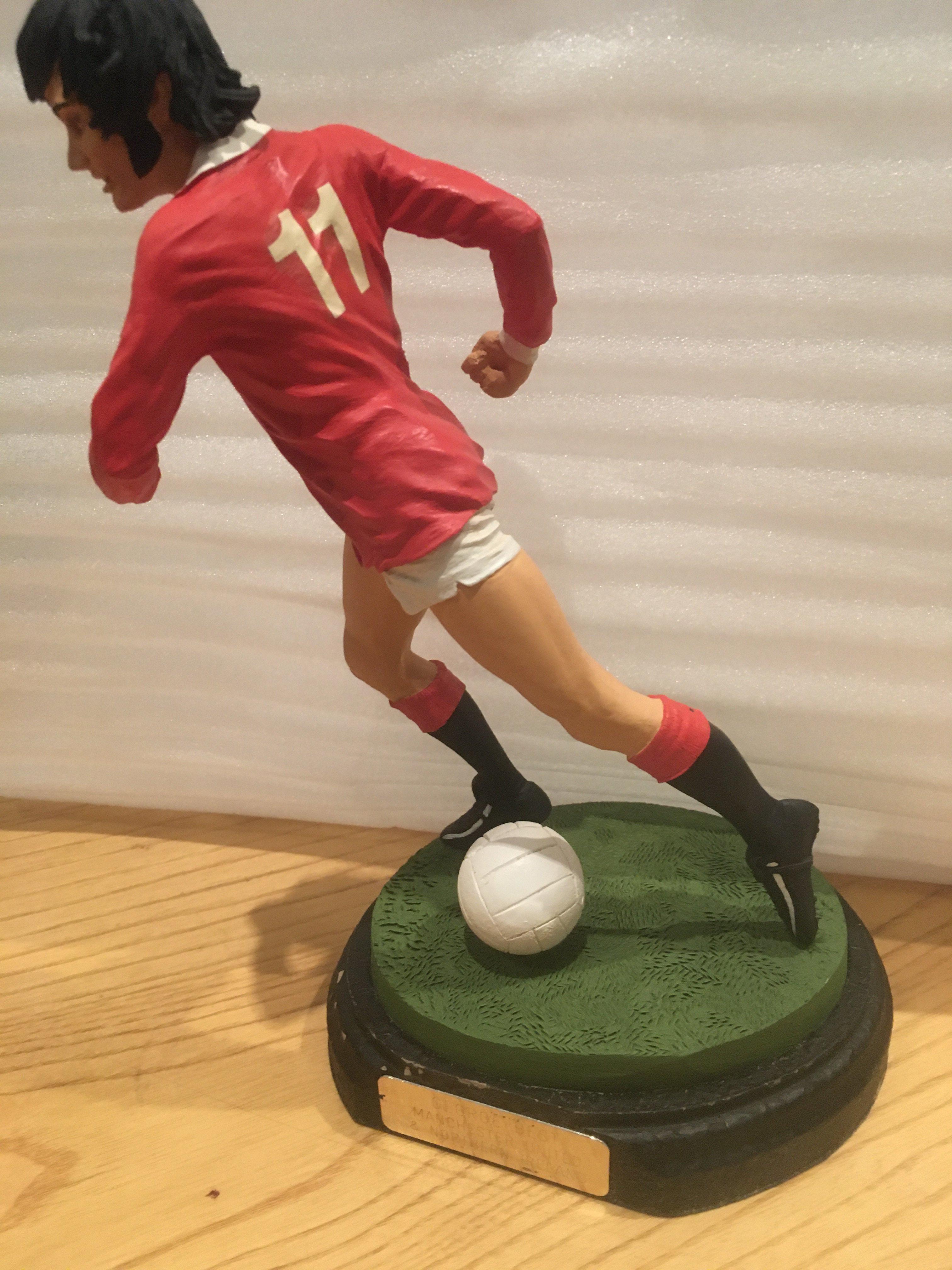 George Best Manchester United Football Figure: Excellent lifelike figure featuring Best In Manchester United kit wearing number 11. Sitting on base with plaque measuring 9 inches high including base.