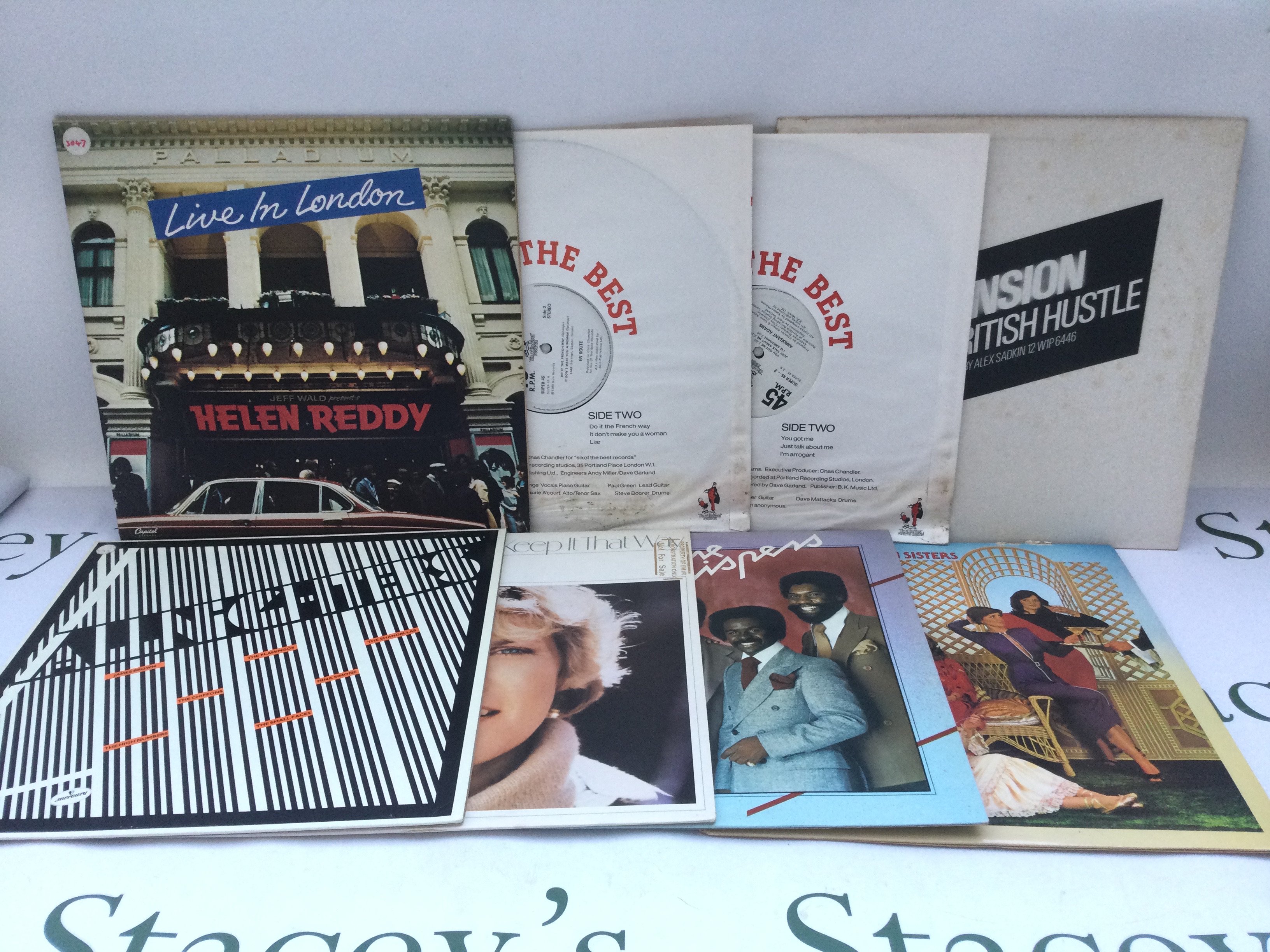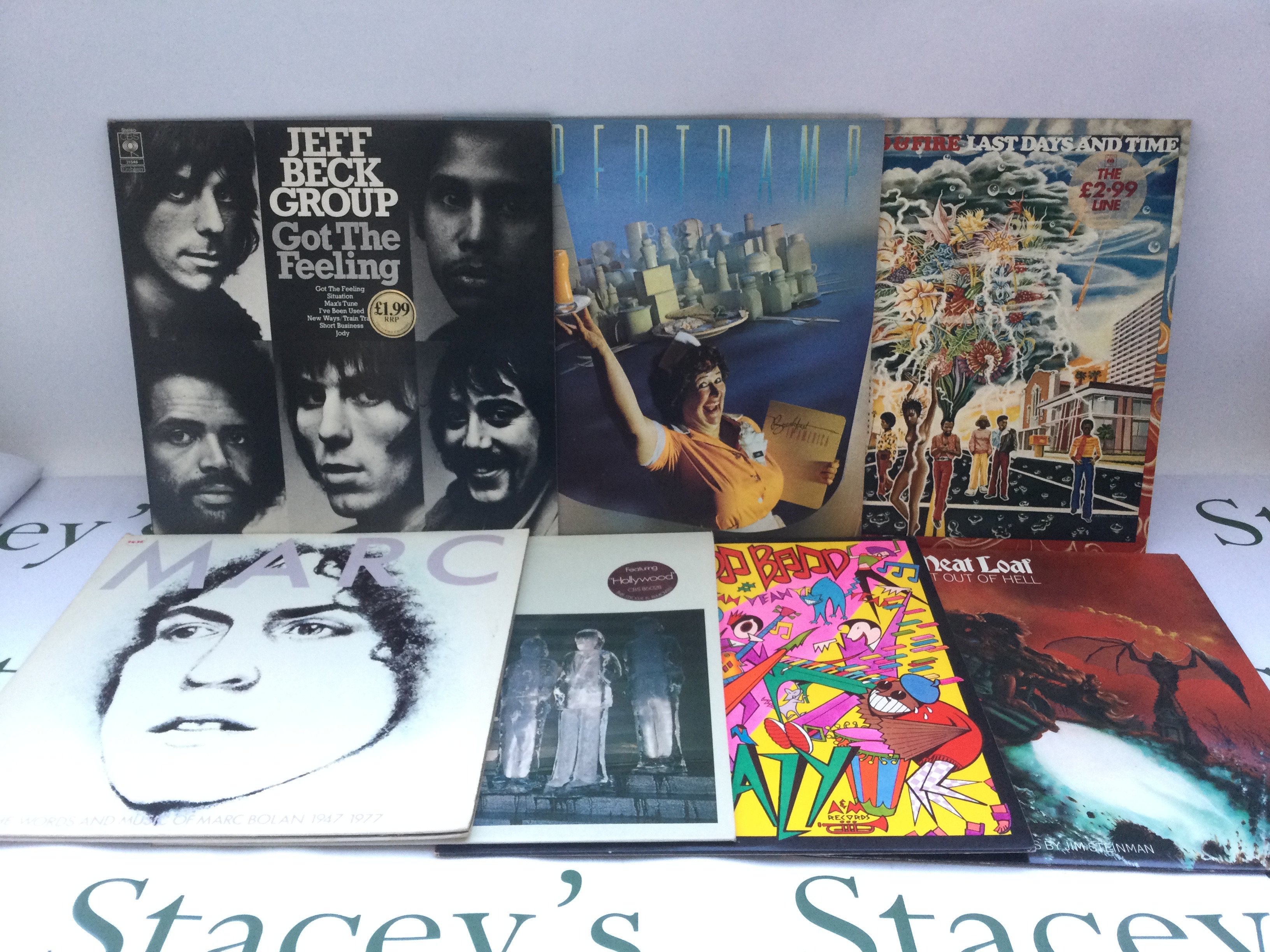 Two bags containing 23 promo copy LPs and 12" singles by various artists including Marc Bolan, Meat Loaf, Jeff Beck Group, Abba and others.
