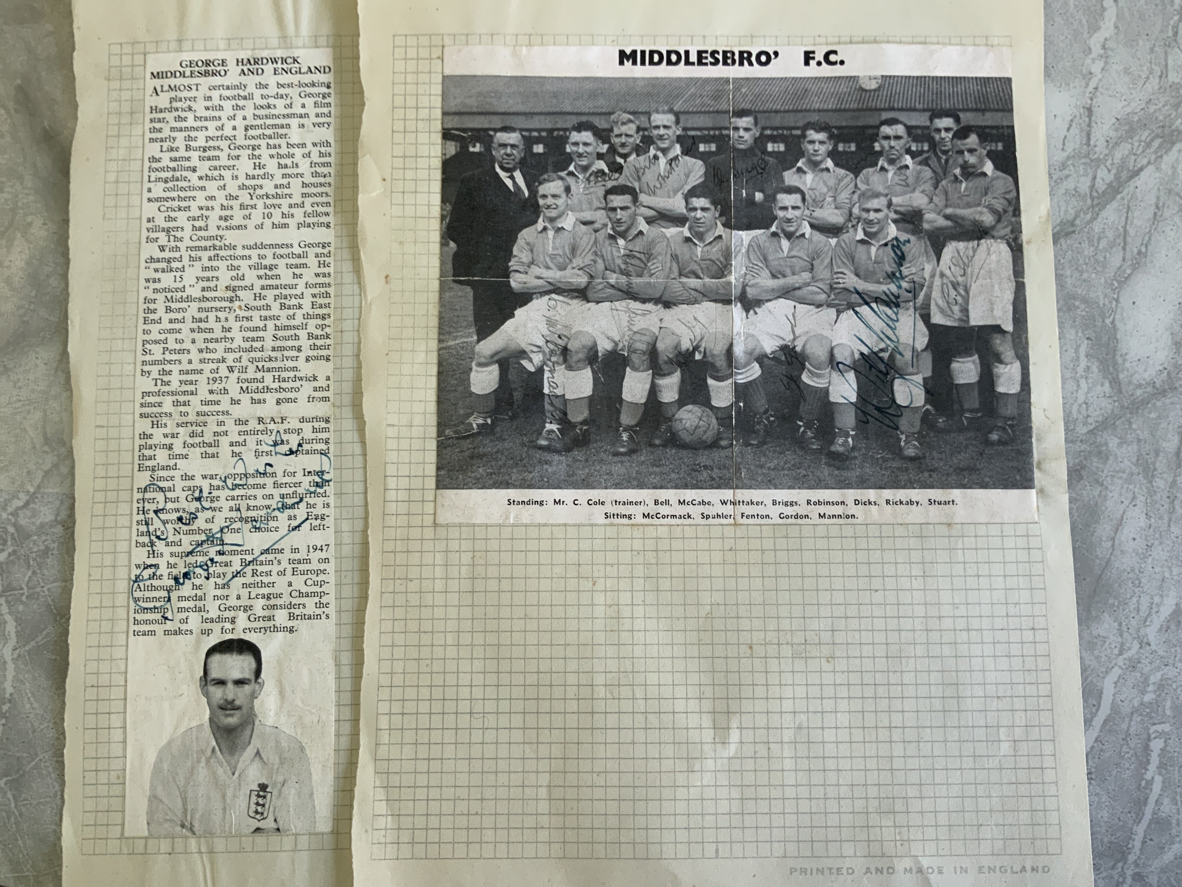 46/47 Middlesbrough Football Autographs: Page removed from autograph book and stuck down which is signed by 15. C/W partly signed team group and a separate George Hardwick signature.