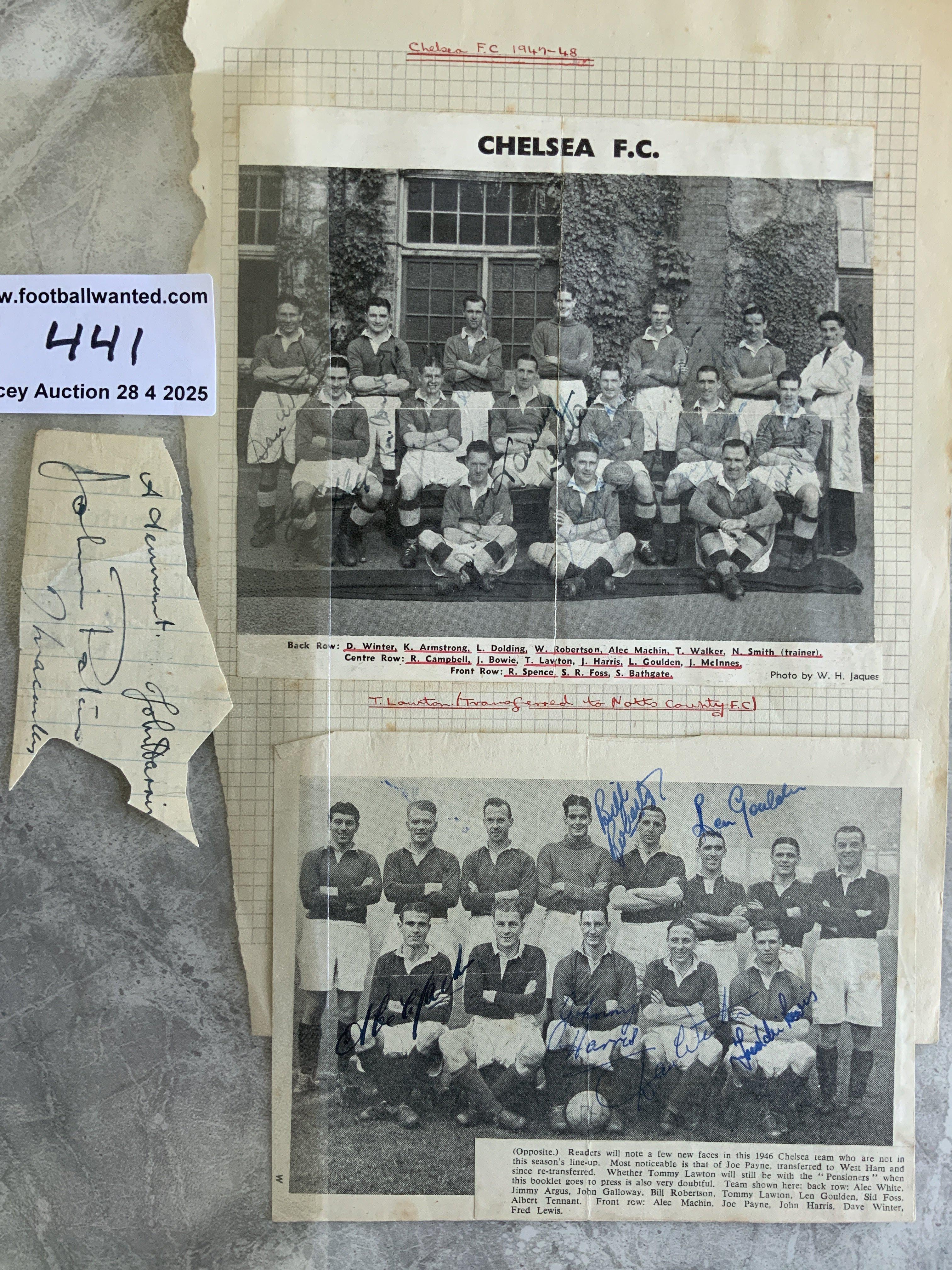 47/48 Chelsea Football Autographs: Lined page signed by 12 with 9 of them direct and 3 stuck on. C/W two partly signed team groups.