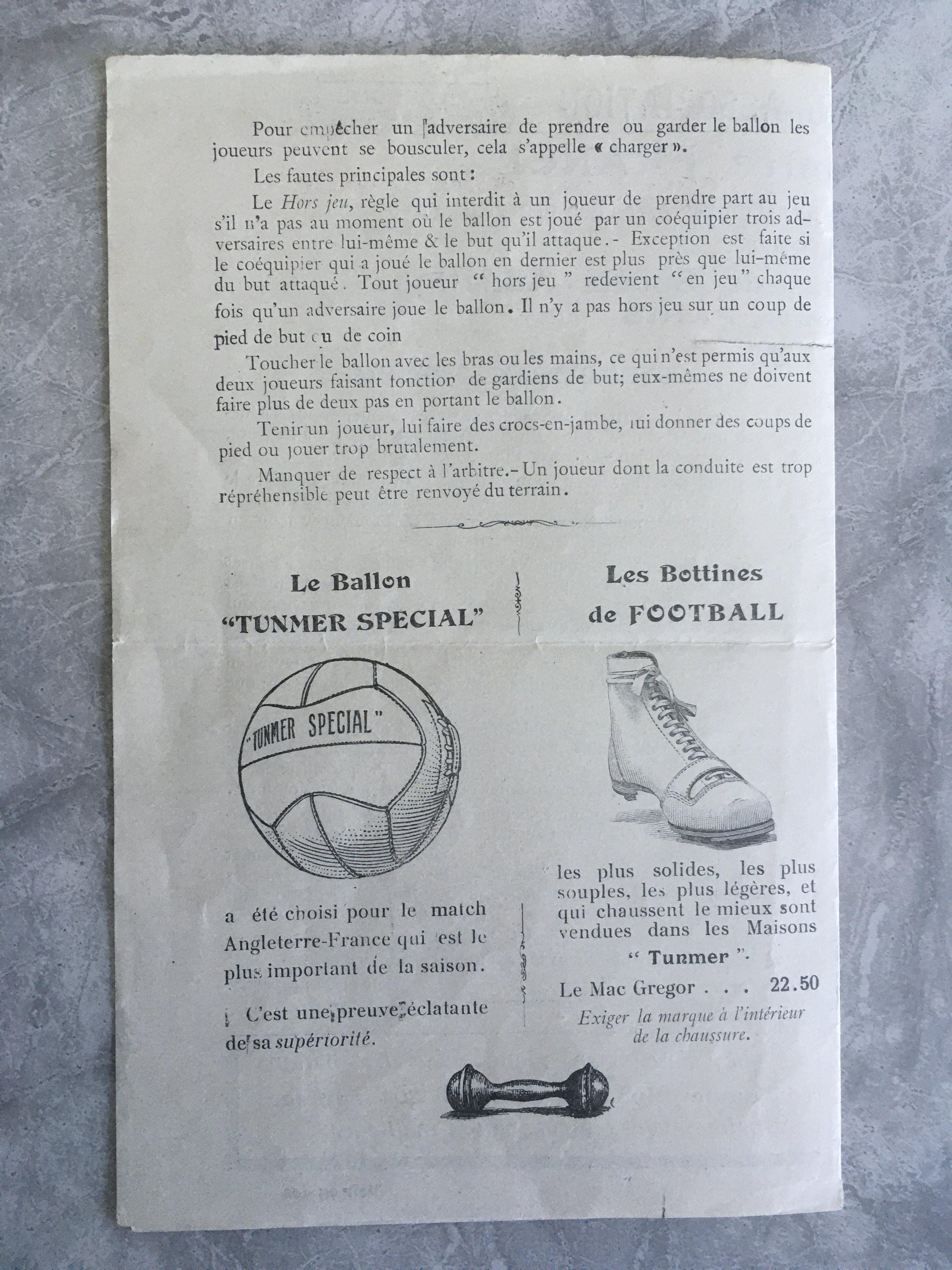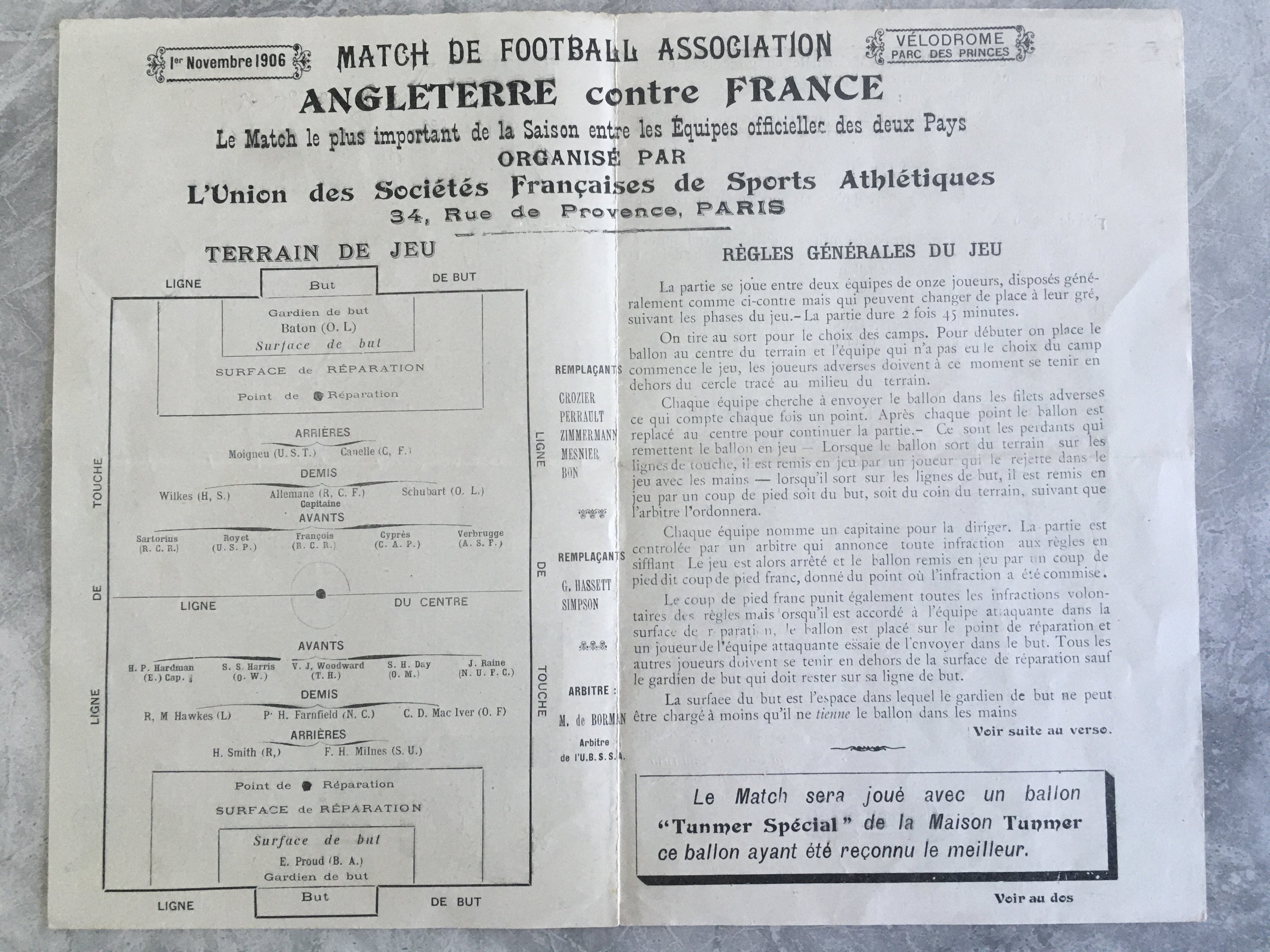1906 France v England Football Programme: Amateur International in which a strong England team won 15-0. Players include Woodward Tottenham, J Raine Newcastle, FMilnes Sheffield United and Farnfield Norwich. 4 pager dated 1 11 1906 is excellent. Believed to be the first ever Amateur International match for England.