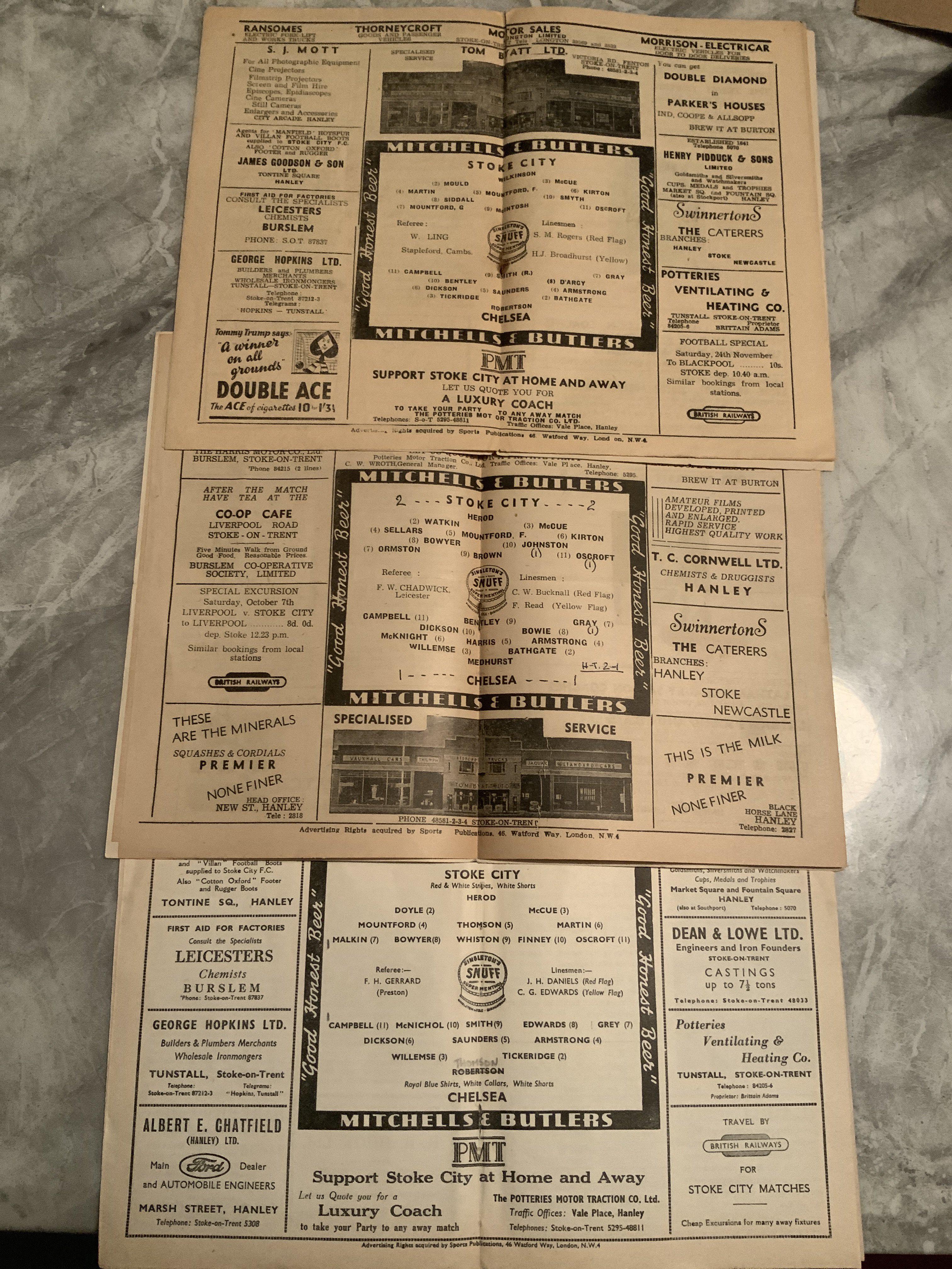 1950s Stoke City v Chelsea Football Programmes: 50/51 51/52 52/53 in very good condition with no team changes. 50/51 has score and scorers noted to team page. (3)