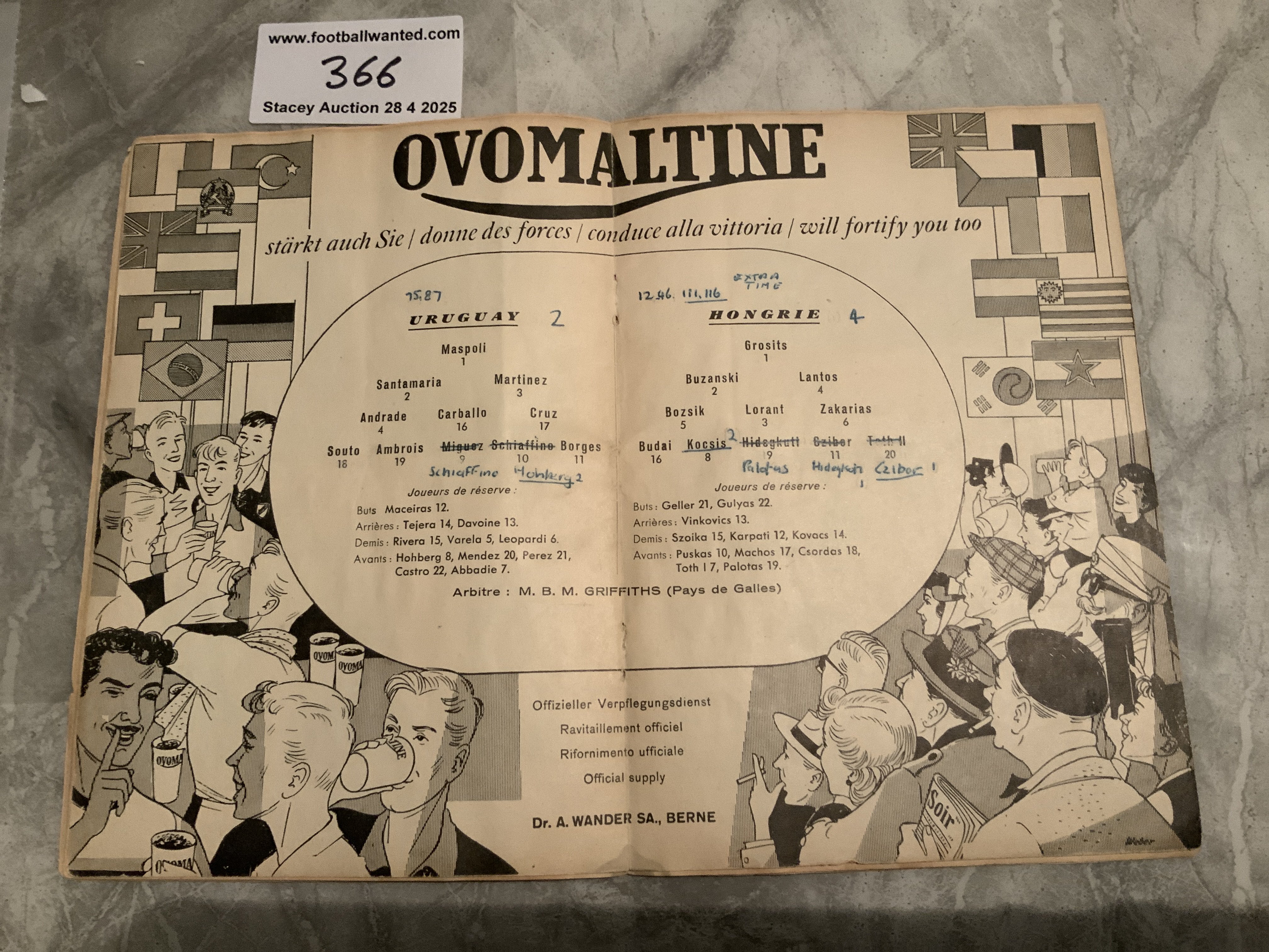 1954 World Cup Semi Final Football Programme: Uruguay v Hungary in fair condition with staples removed team changes and light staining.