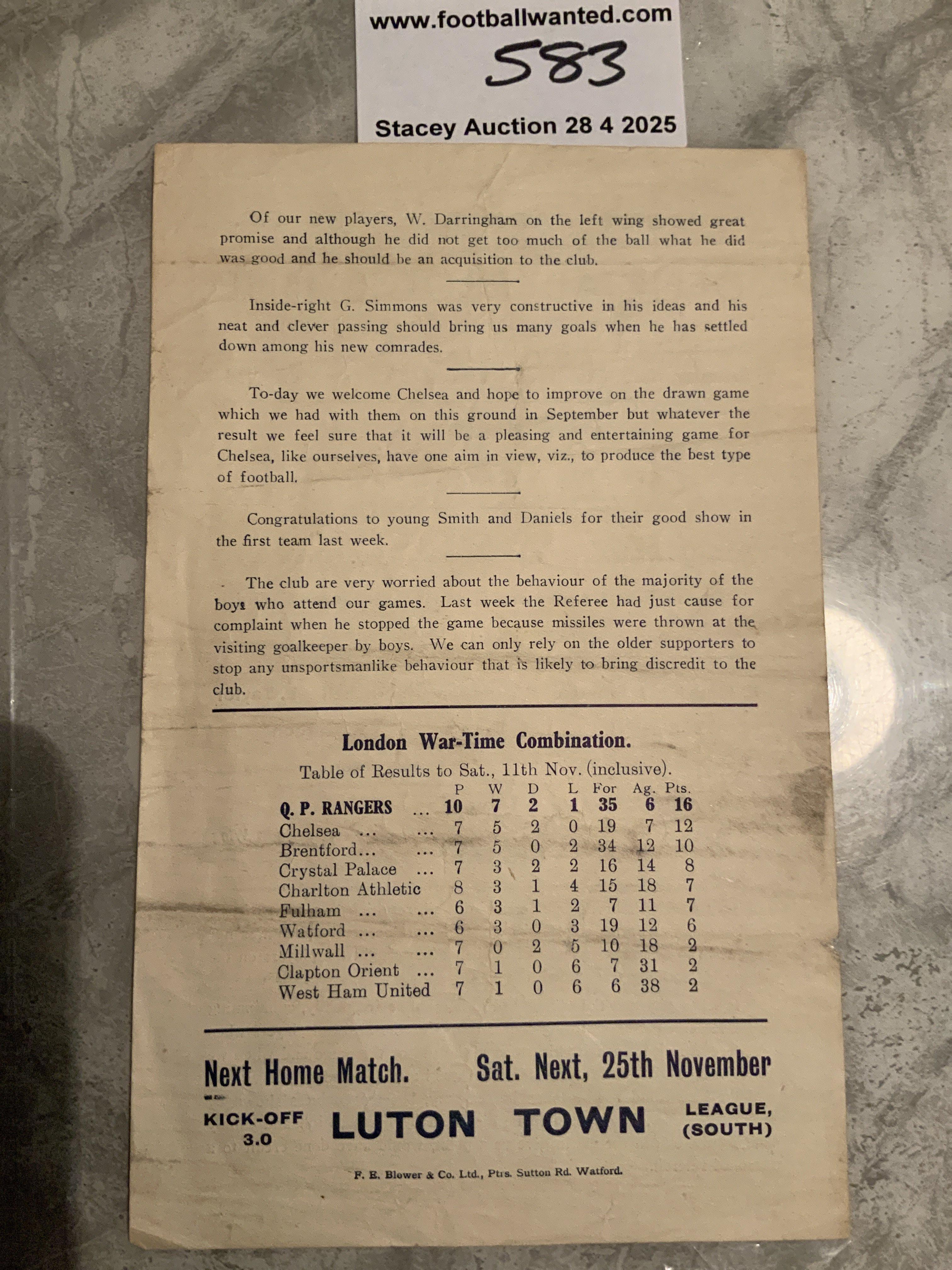 44/45 QPR v Chelsea Reserves Football Programme: London War Time Combination single sheet dated 18 11 1944 in good condition with no team changes. Crease.