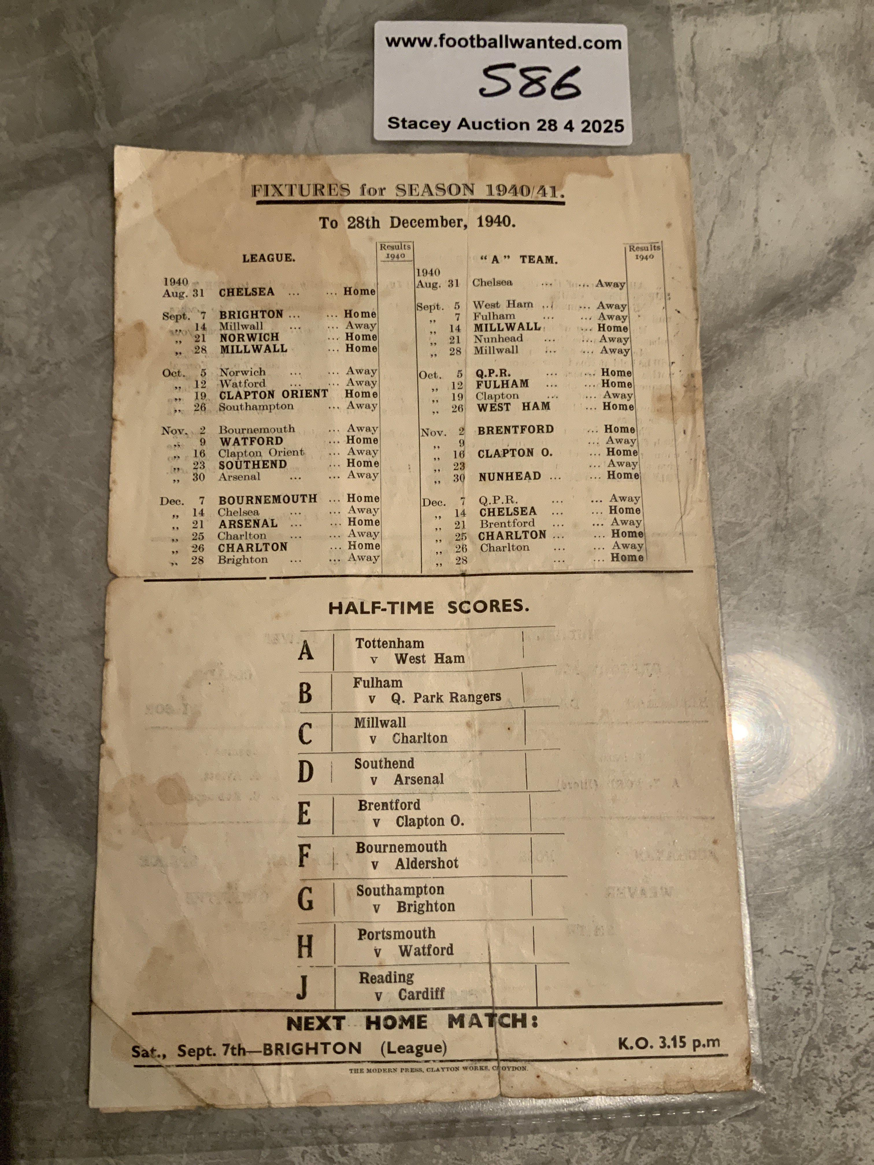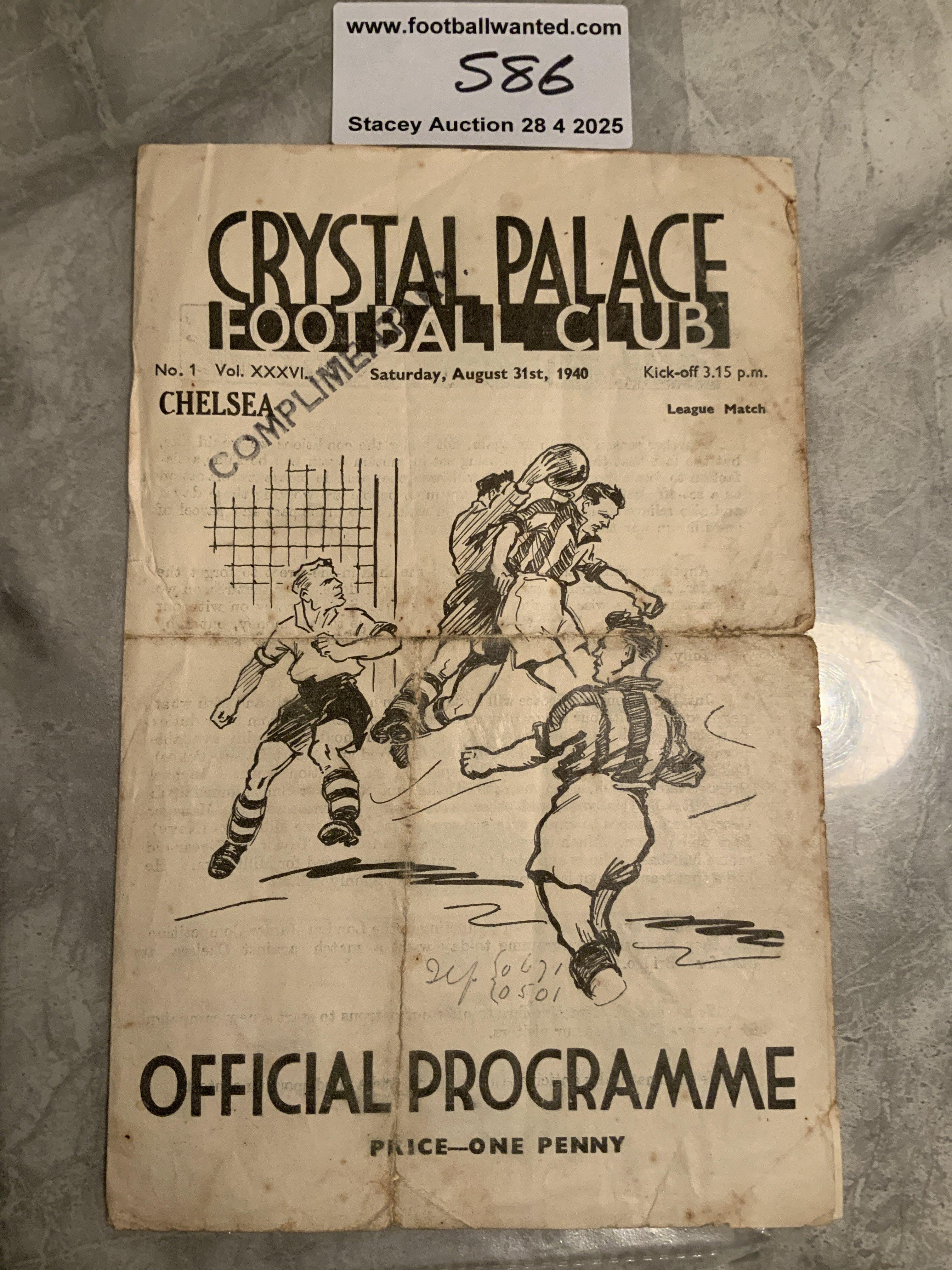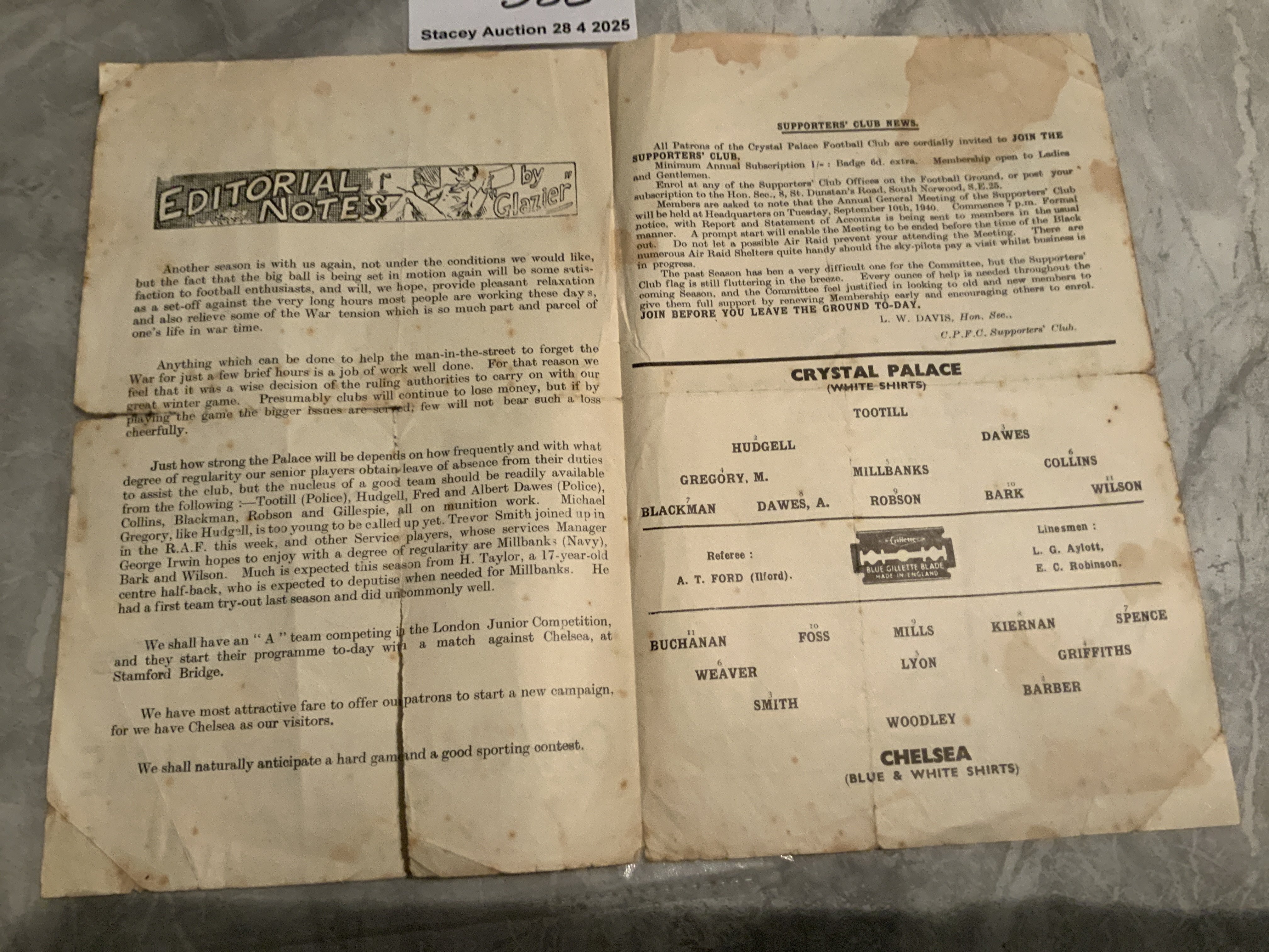 40/41 Crystal Palace v Chelsea Football Programme: Poor condition with no team changes. Whilst complete it has folding tears and numbers to cover. Rare issue for league match dated 31 8 1940.