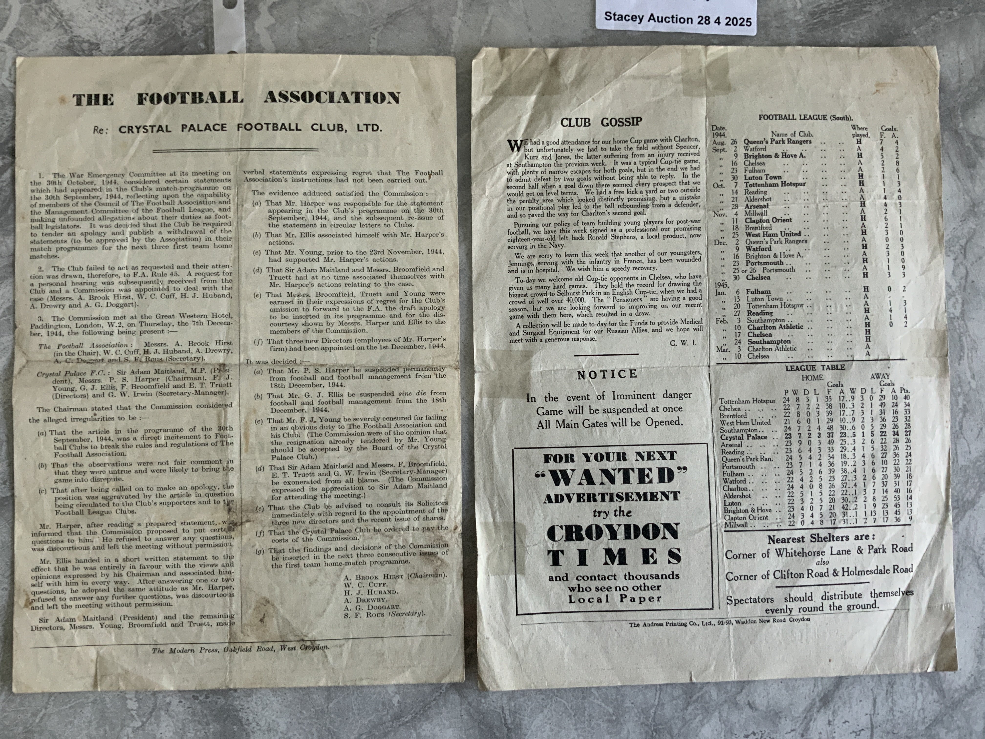 44/45 Crystal Palace v Chelsea Football Programmes: League and cup single sheets in fair condition with no team changes. Few marks to rear and folding. (2)