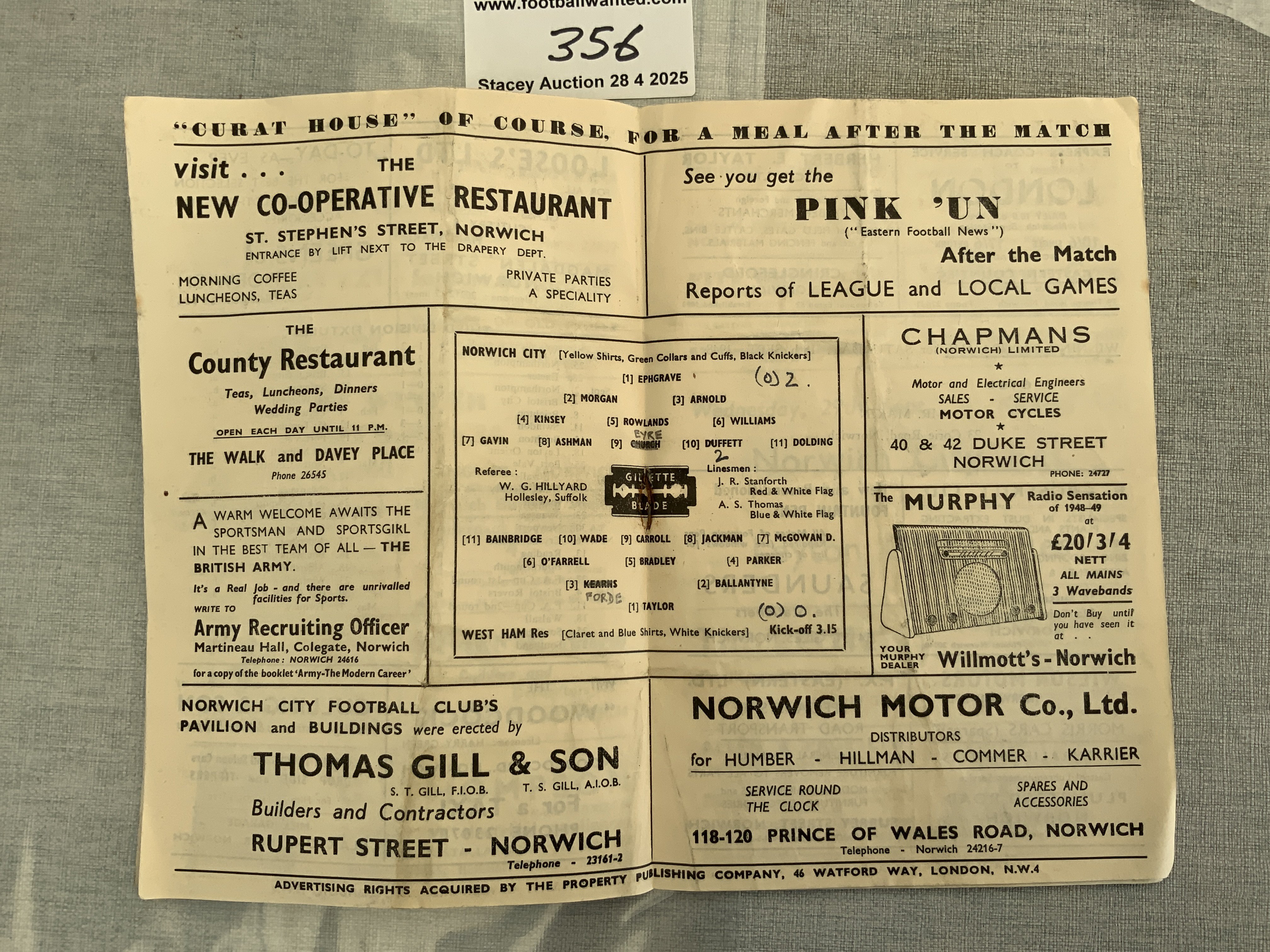 48/49 Norwich City v West Ham Reserves Football Programme: Very good condition with score to team page. Football Combination.