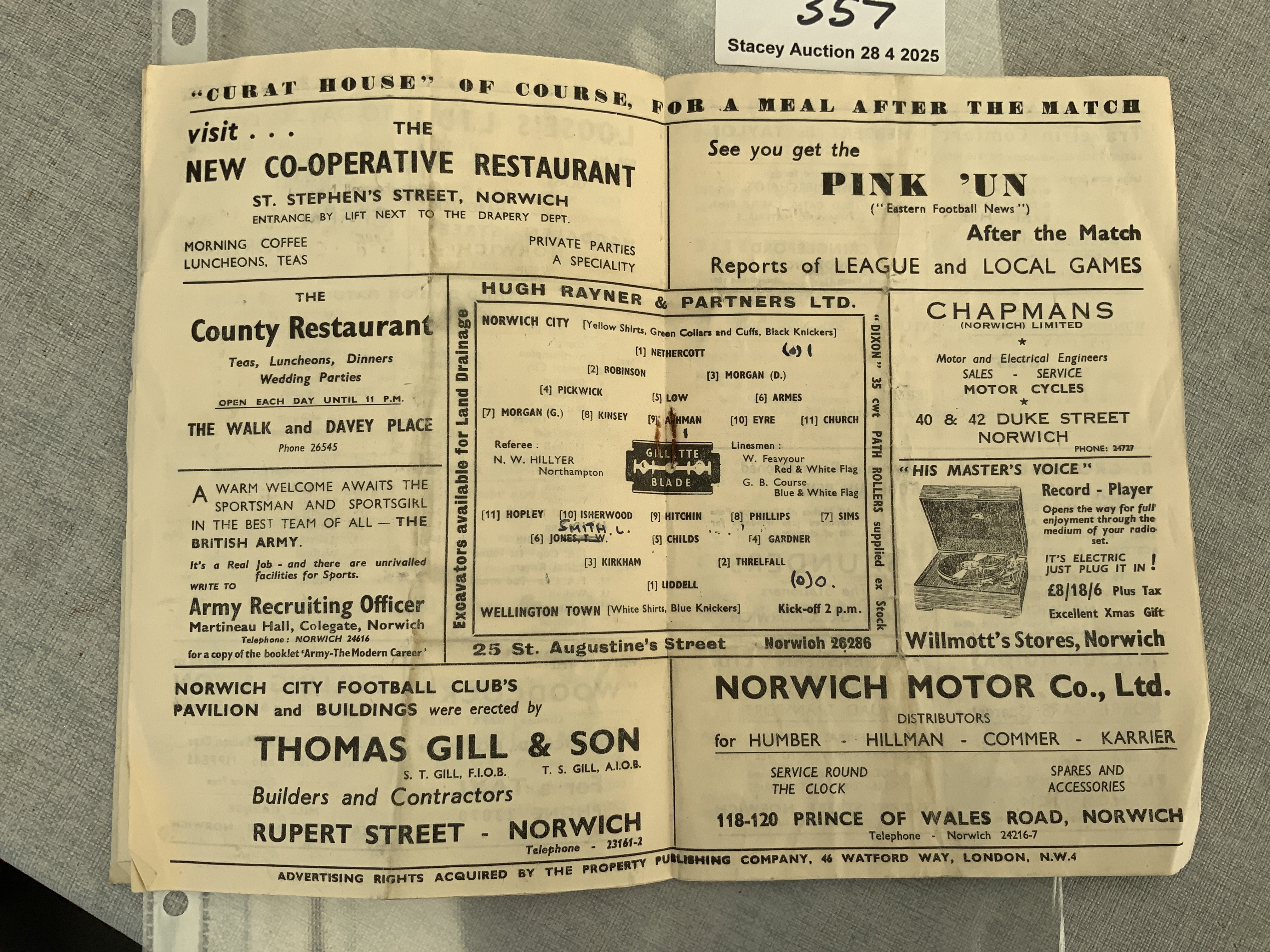 47/48 Norwich City v Wellington Town FA Cup Football Programme: Fair/good condition with score to team page. Tear to cover.