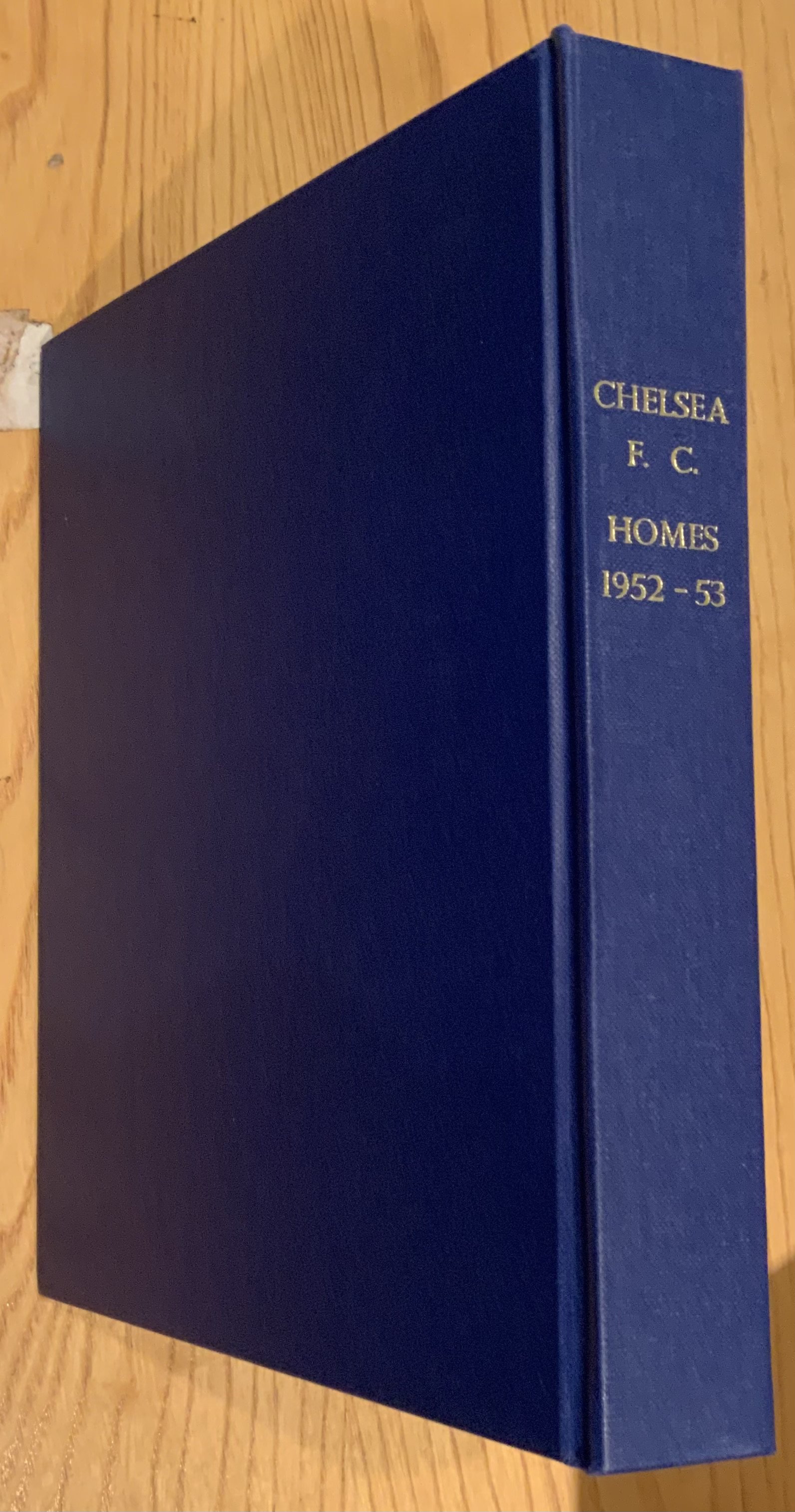 52/53 Chelsea Home Football Programmes: All 21 league home football programmes plus 3 cup in very good condition in a blue binder with gold lettering stating Chelsea FC Homes 1952-53. Includes harder to obtain Stoke and Liverpool. (24)