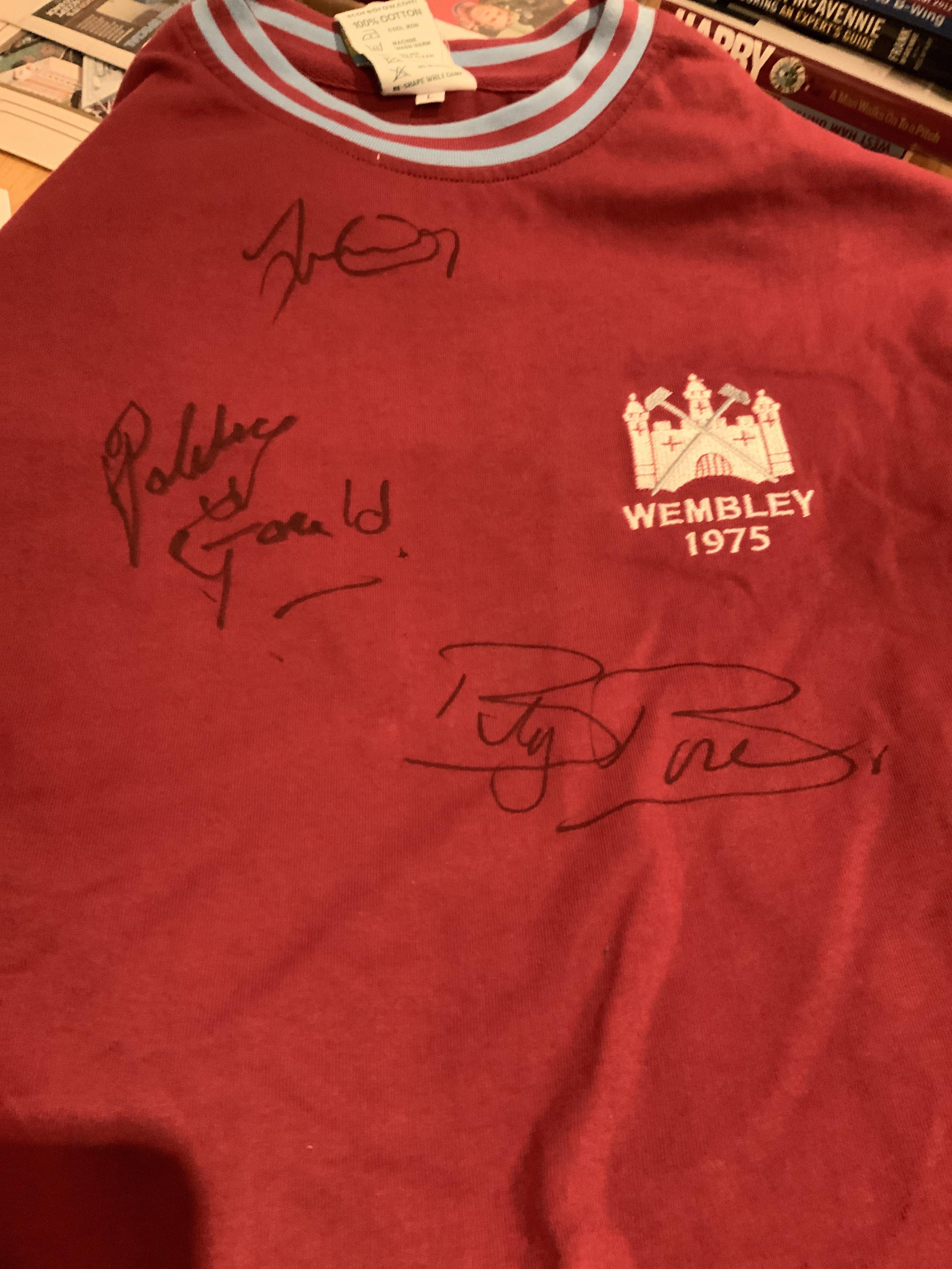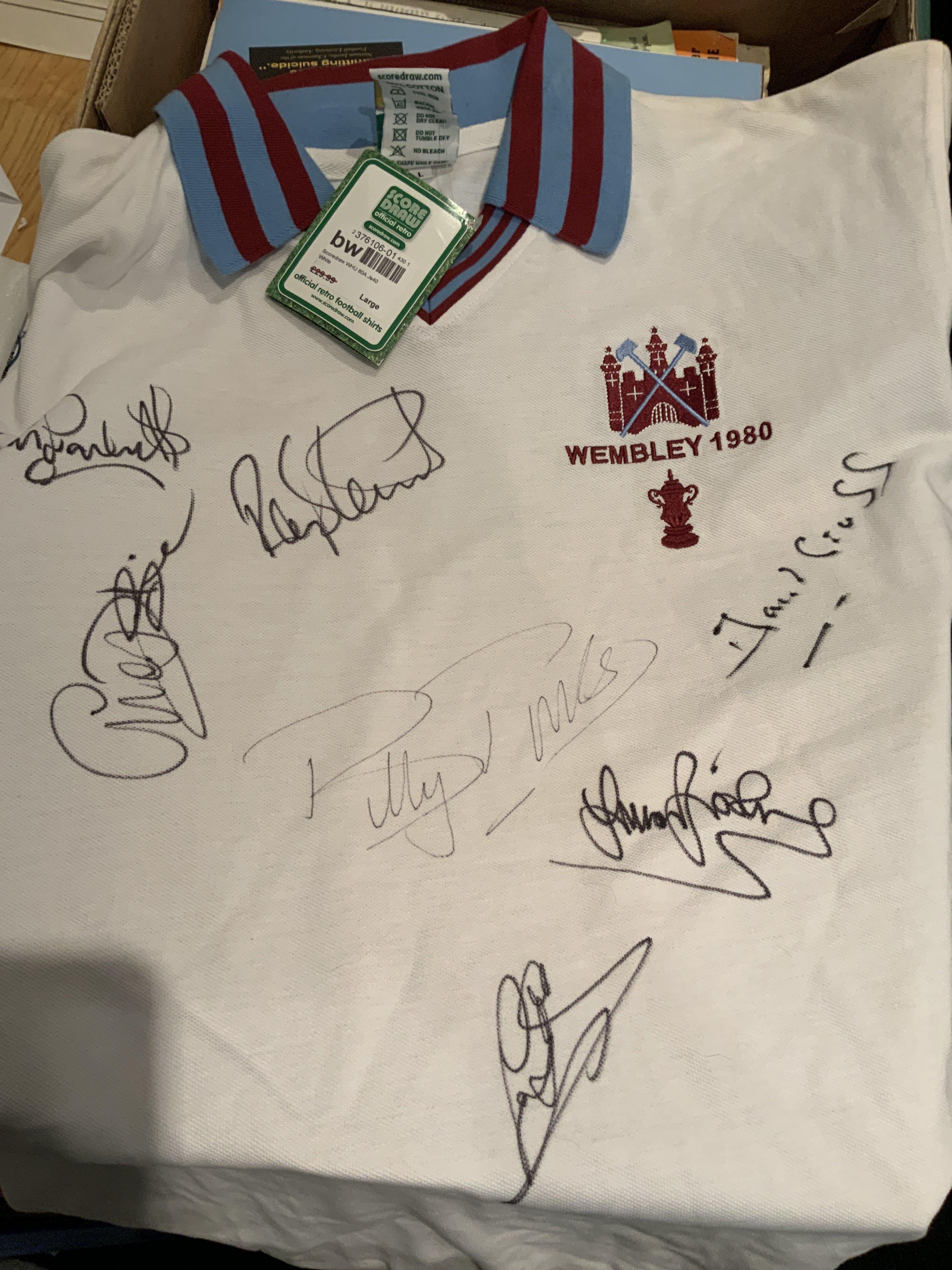 West Ham Football Memorabilia Box: Books, early Hammers News, programmes, programme inserts and a few 1966 World Cup items. C/W 1980 FA Cup replica shirt signed by 7 and a 1975 FA Cup final shirt signed by 3.
