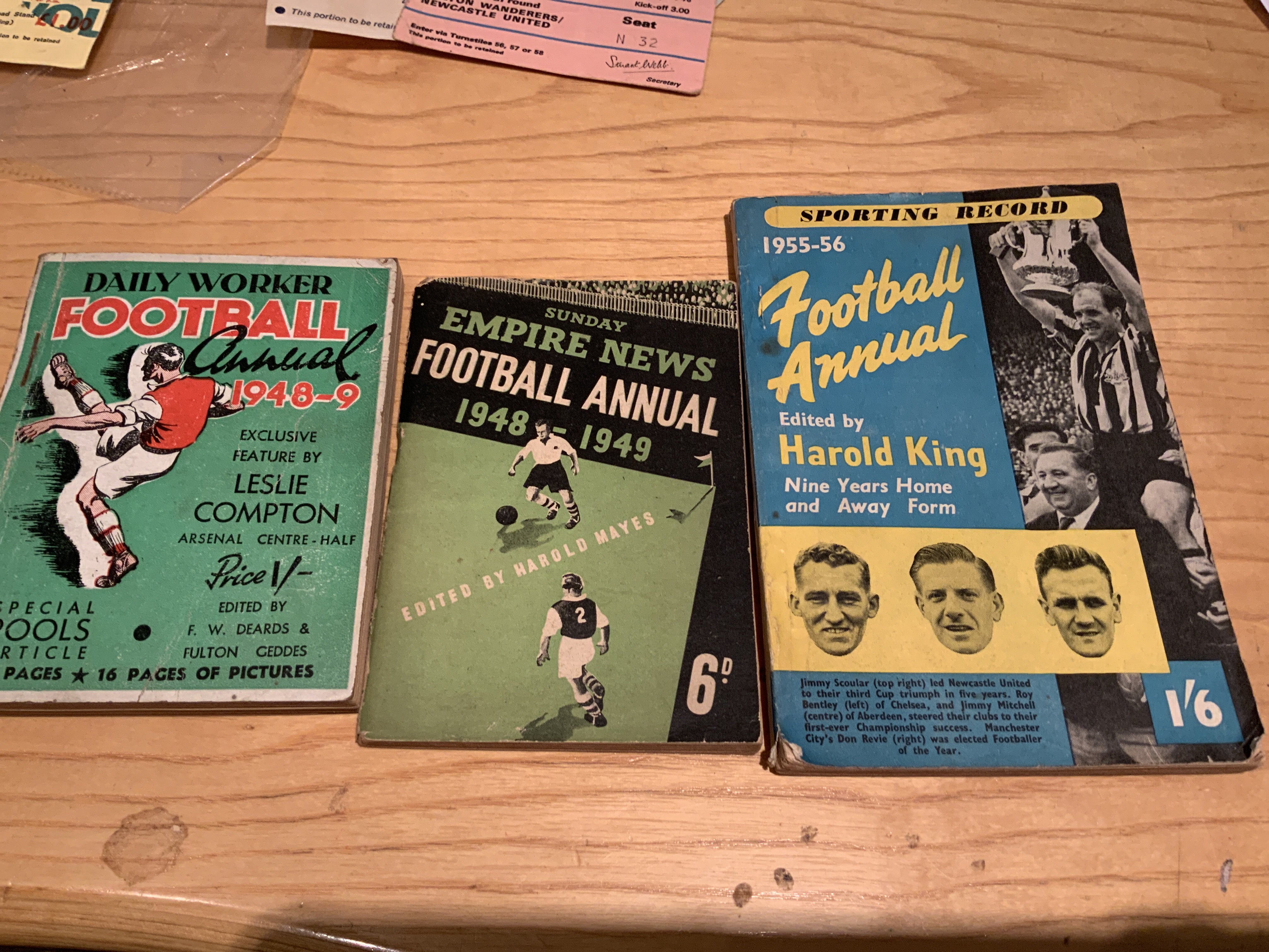 Football Memorabilia Boxes: Includes Books, Newspapers, Tickets, signed Blackpool ball, Rugby, Paul Fuschillo medals, 40s annuals and more. Instructions to sell. (2 boxes)