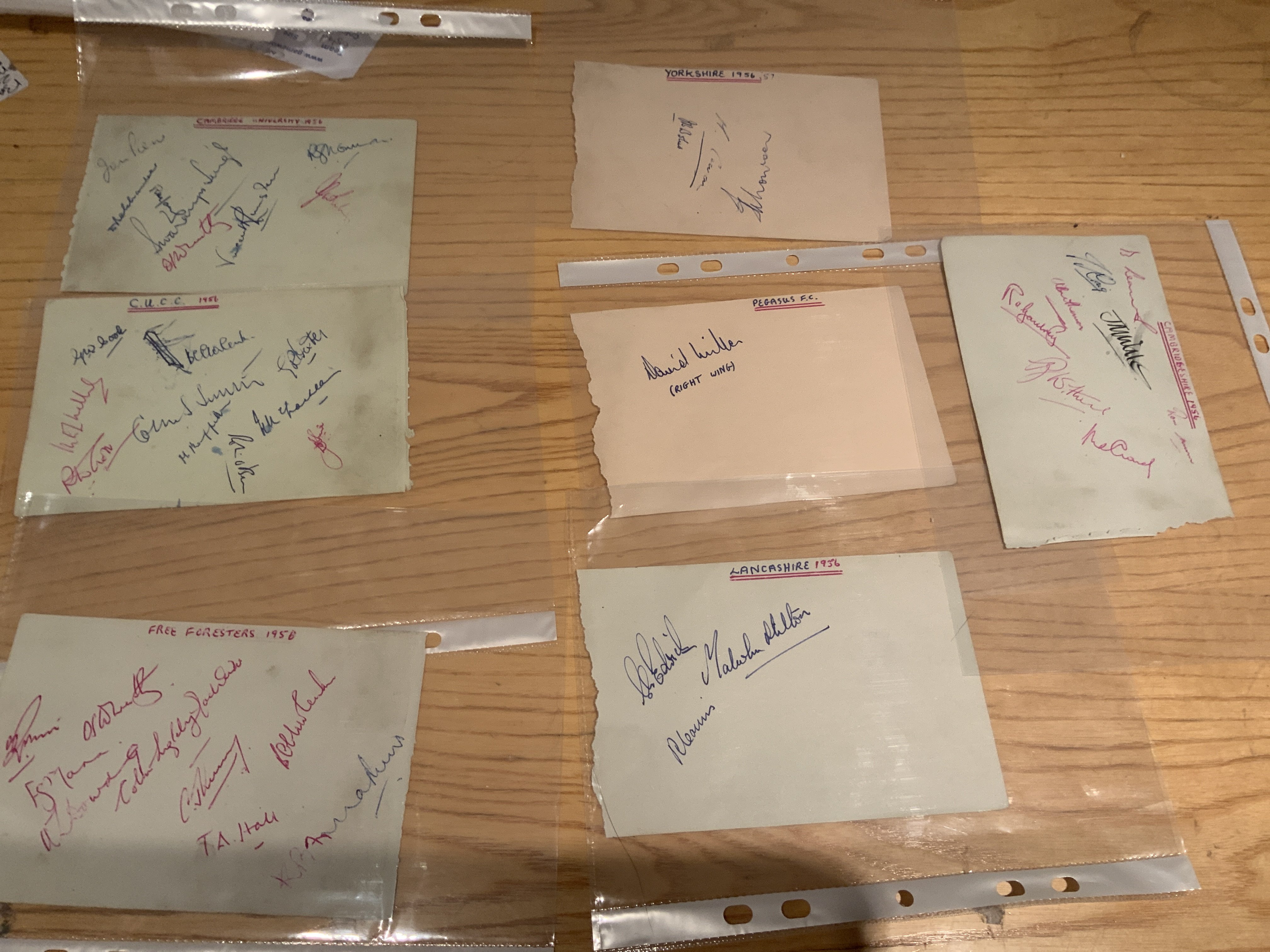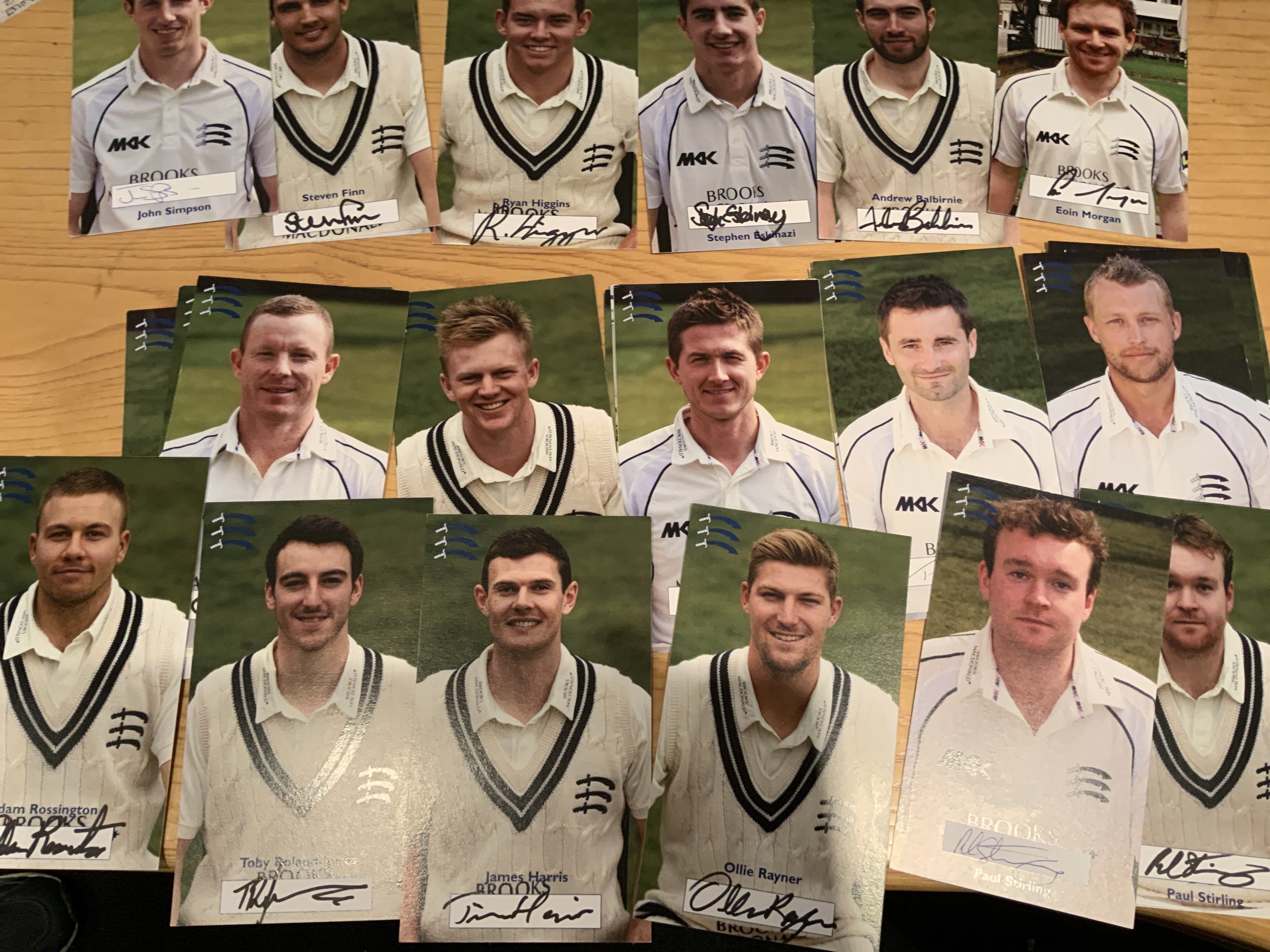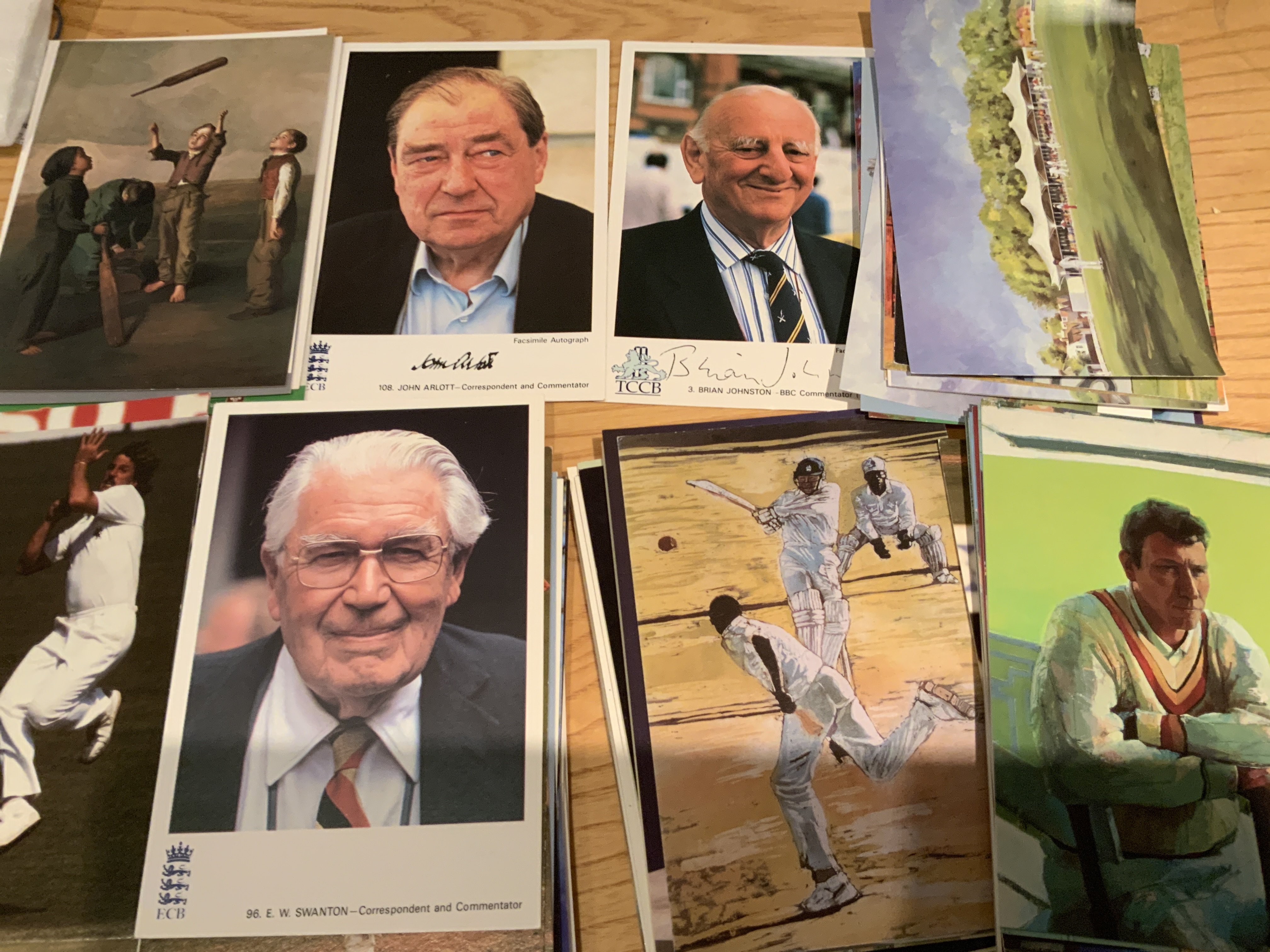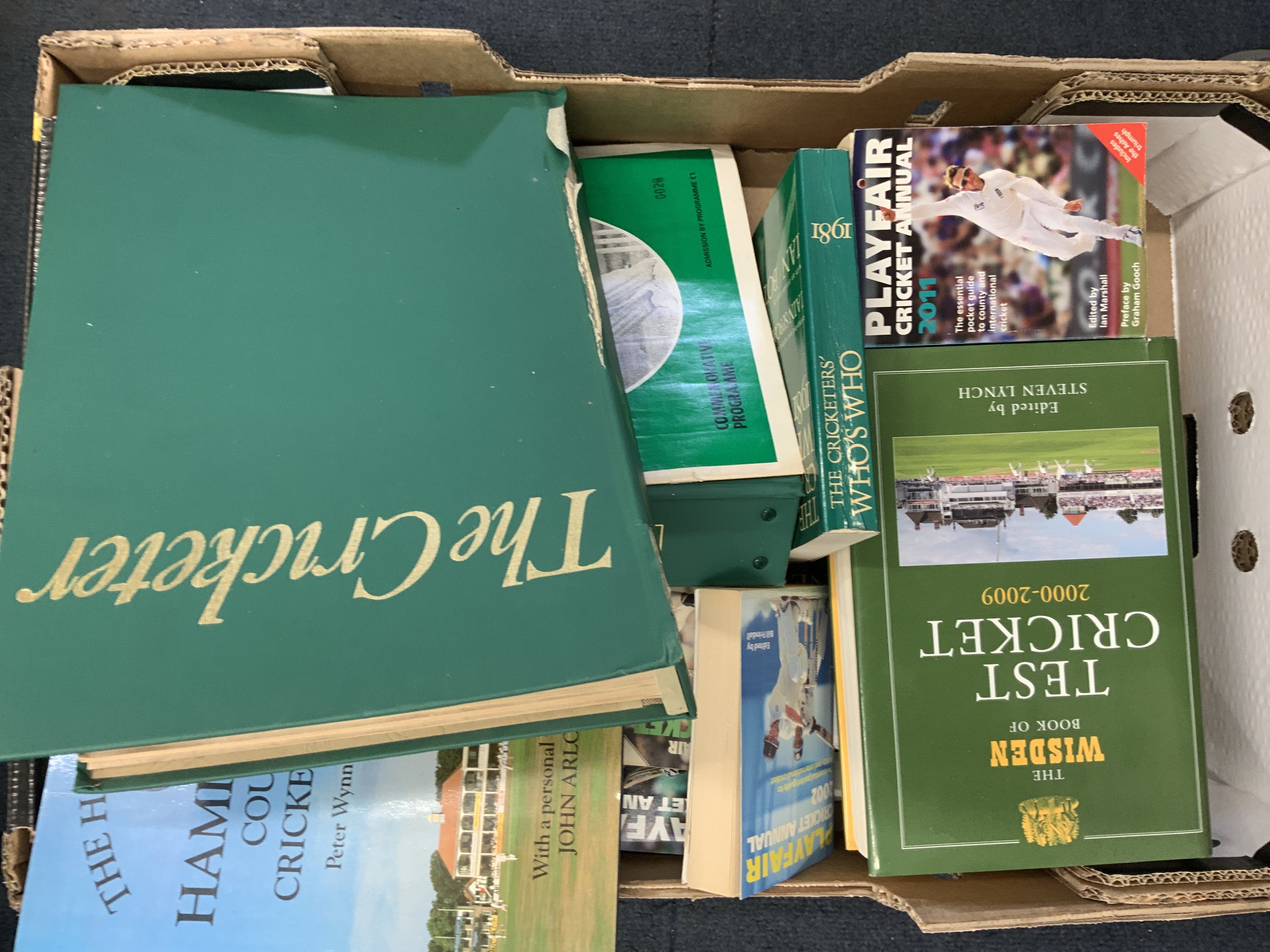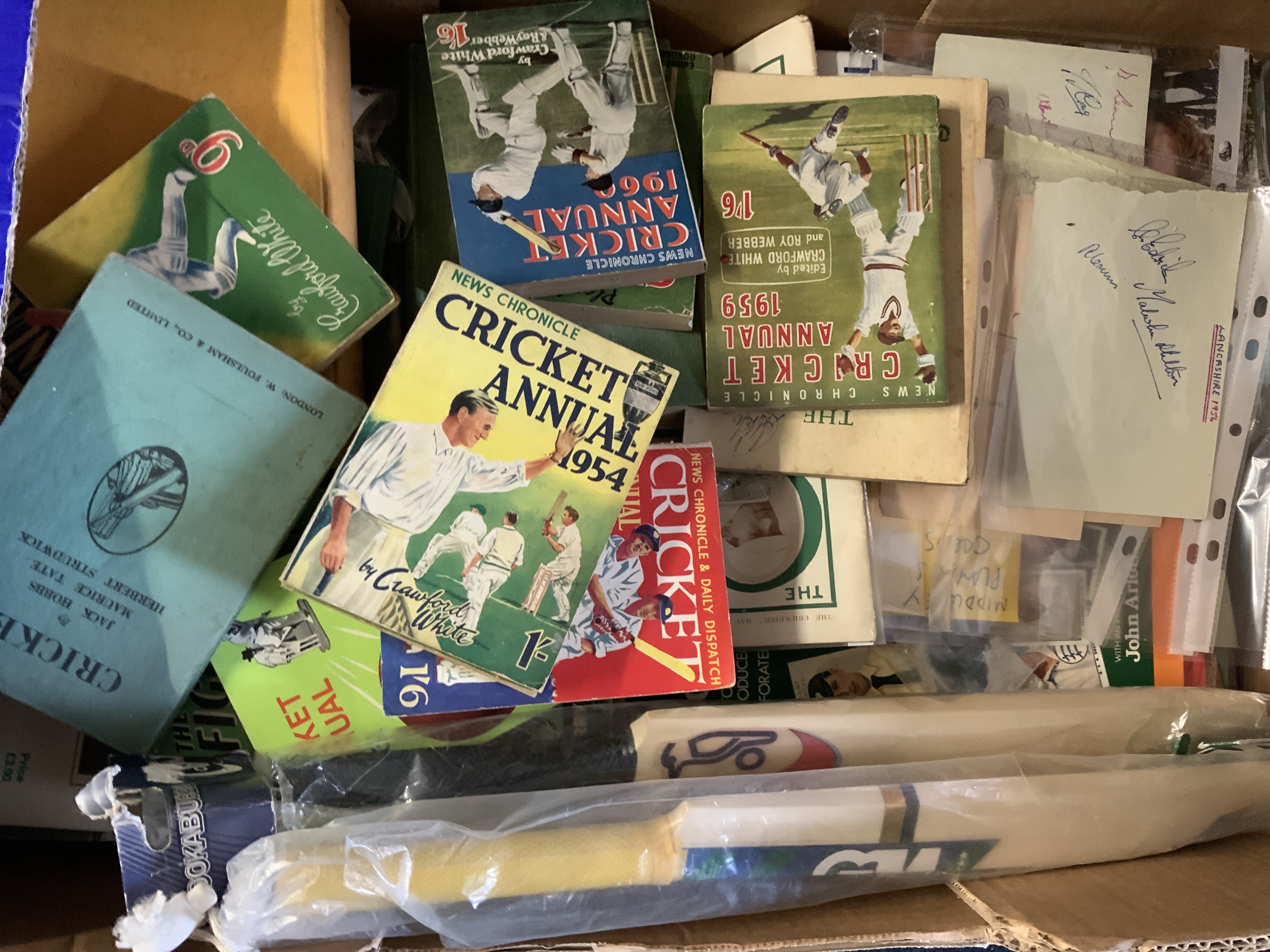 Cricket Memorabilia Box: 2 signed bats including England and India on one bat plus 1990 Pakistan which is fading. Cricket books, Annuals, Postcards, 1956 Autographs, Middlesex signed player postcards and more. Instructions to sell. (2 boxes)