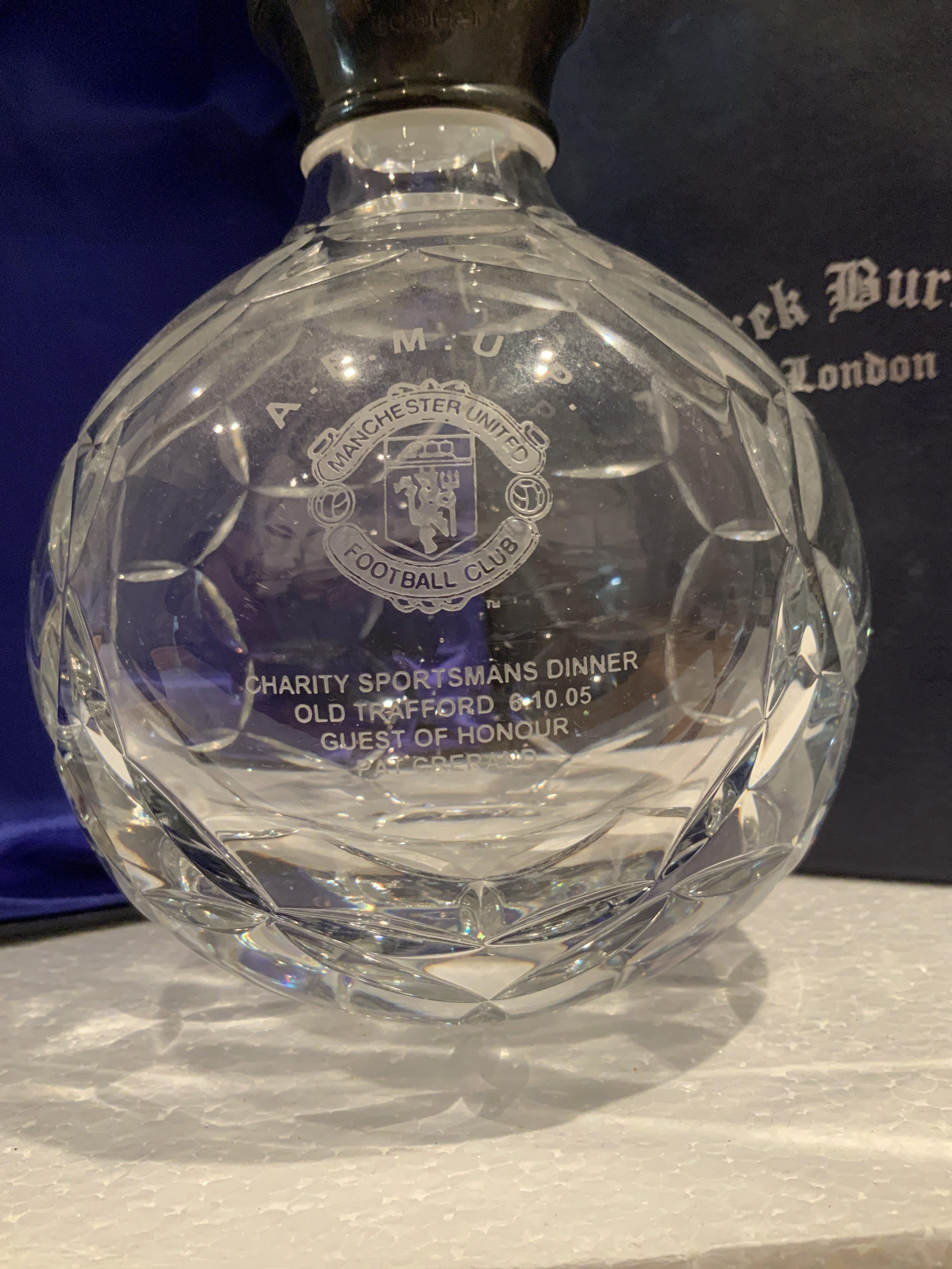 Pat Crerand Manchester United Football Decanter: Presented to Crerand who was guest of honour at a charity dinner at Old Trafford on 6 10 2005. Engraved with the above information from the Association Of Former Manchester United Players. Excellent condition in original box standing 9 inches high.
