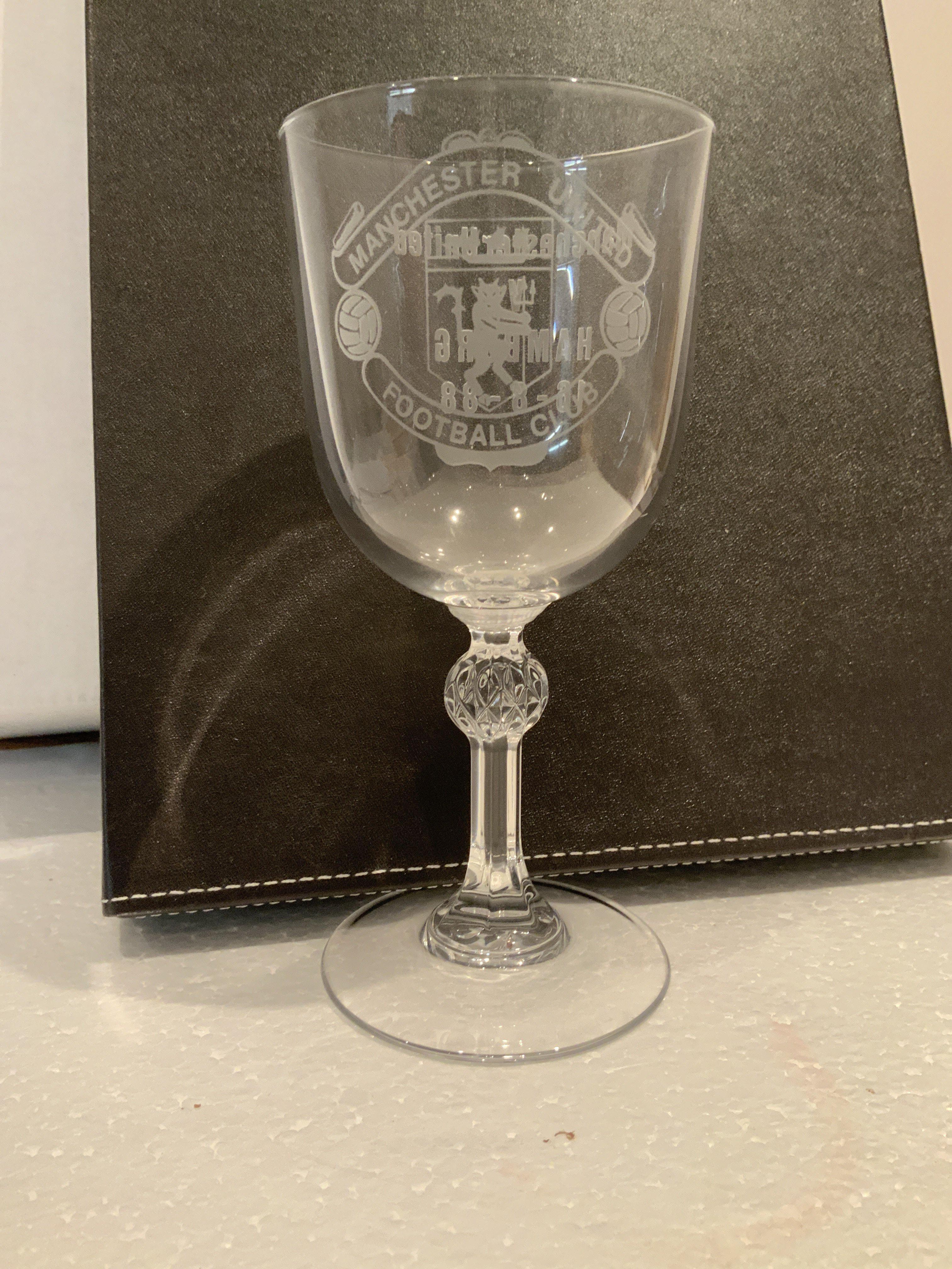 1988 Hamburg v Manchester United Players Gift: Heavy stemmed glass engraved Manchester United v Hamburg 16 8 1988 with the reverse having the Manchester United club badge embossed.