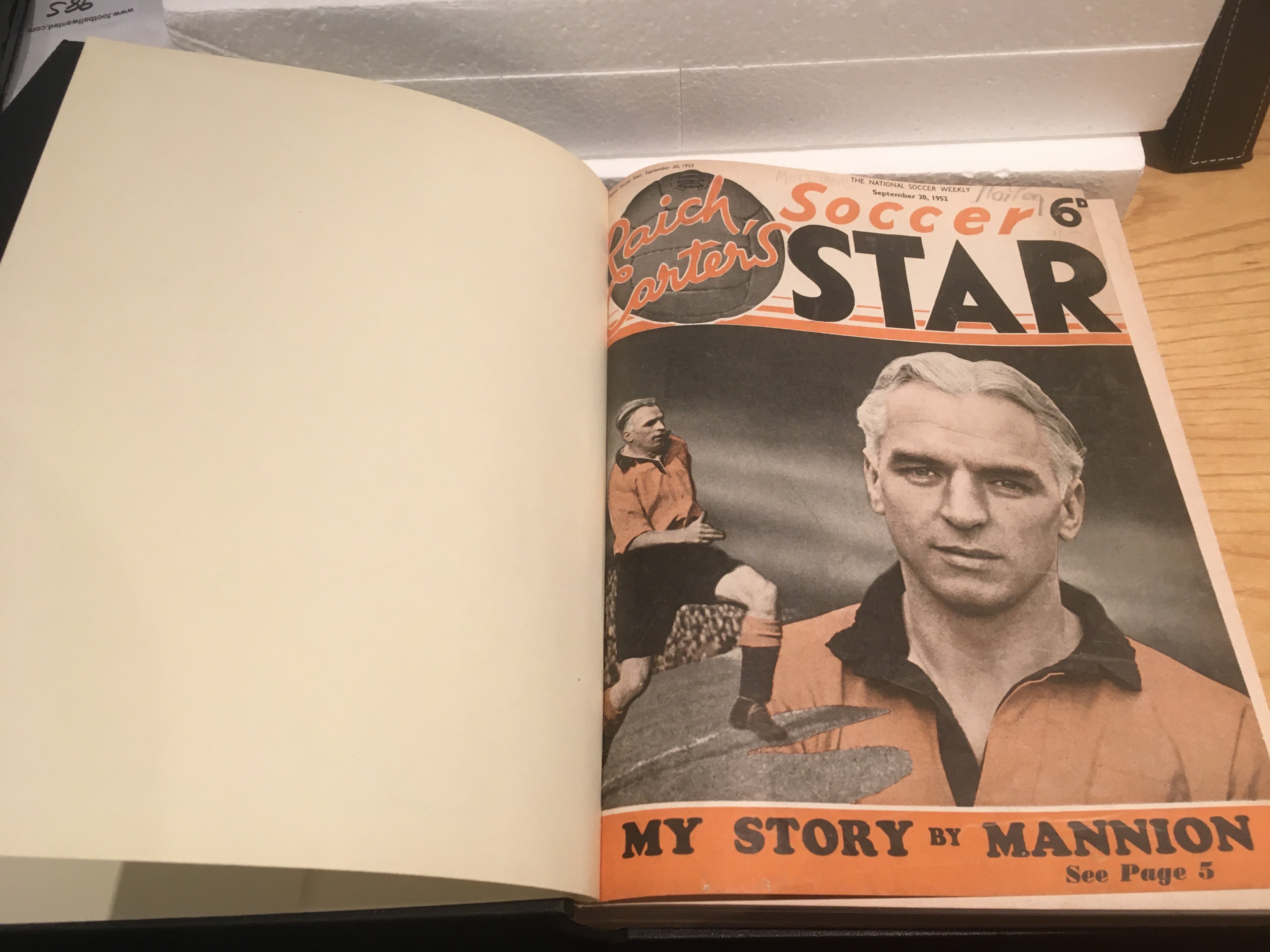 Soccer Star Magazine Complete Bound Volume Collection: From the first copy of 20 9 1952 to the last one on 19 6 1970. Started off life as Raich Carters Soccer Star and his name was later dropped. Stunning black binders with volume and numbers in gold to spine. Rare chance. 30 volumes. (4 boxes)