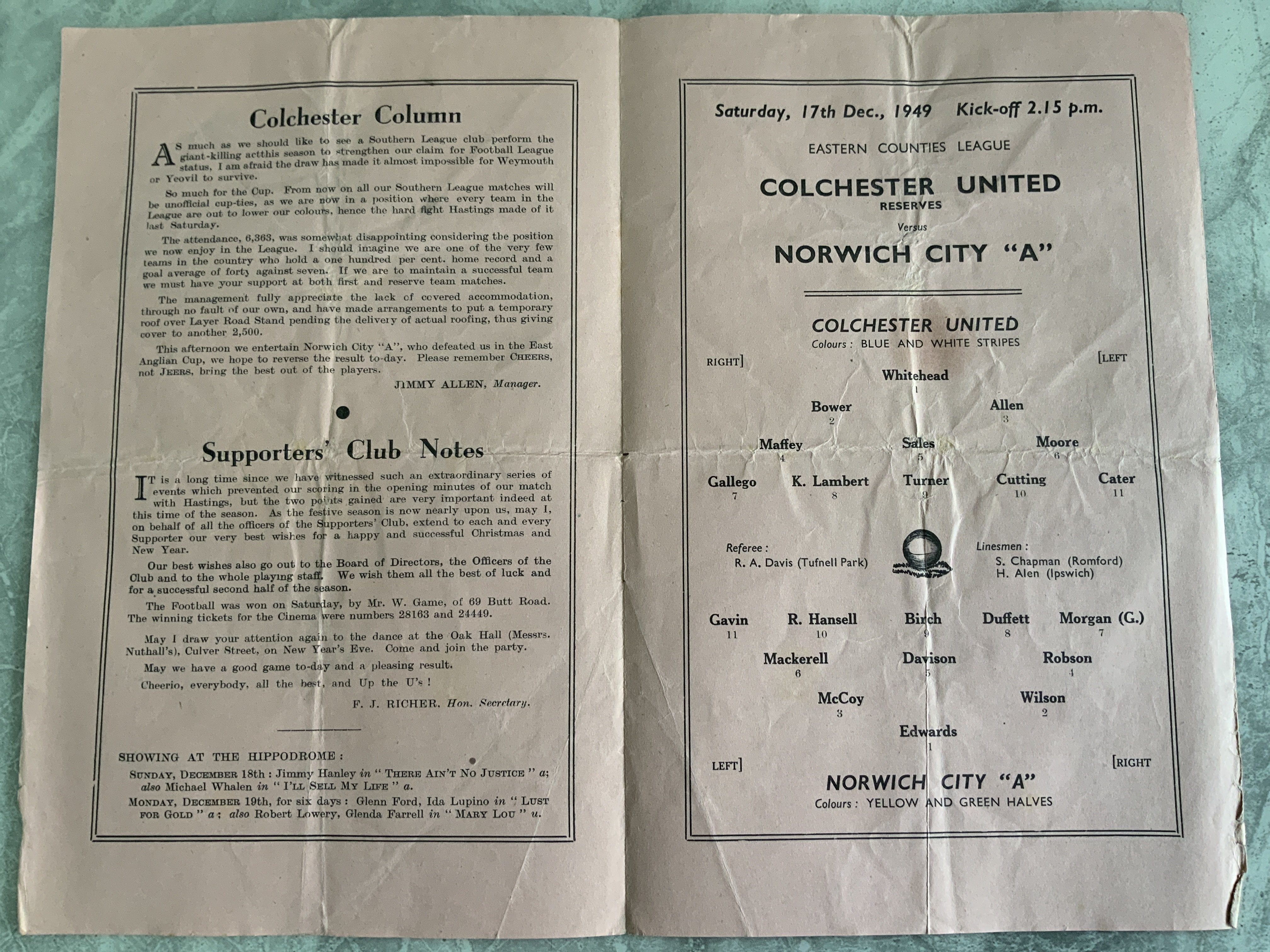 49/50 Colchester United v Norwich A Football Programme: Good condition with no team changes from the Eastern Counties League dated 17 12 1949. Folding.