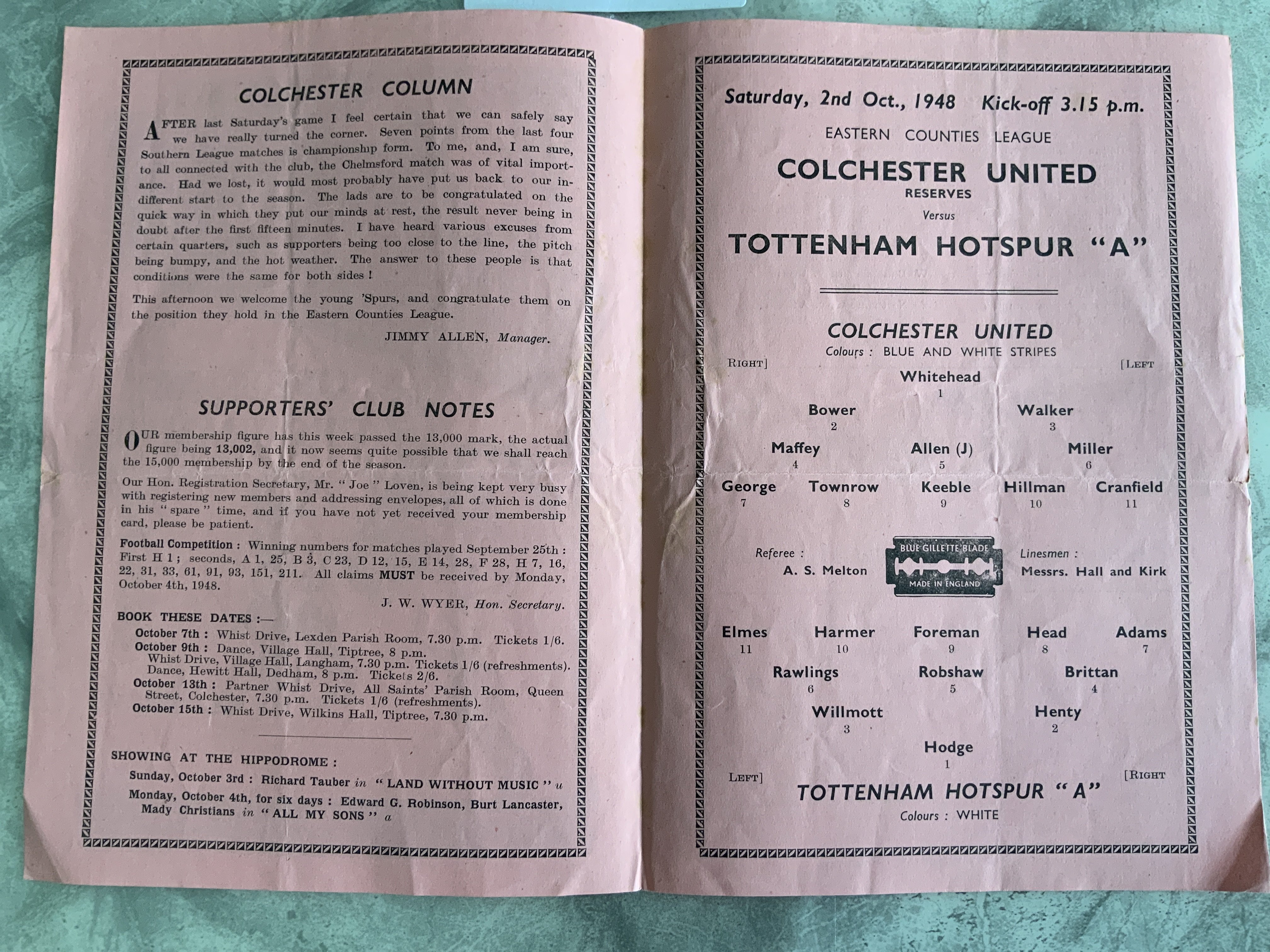 48/49 Colchester United v Tottenham A Football Programme: Good condition with no team changes from the Eastern Counties League dated 2 10 1948. Very light folding.