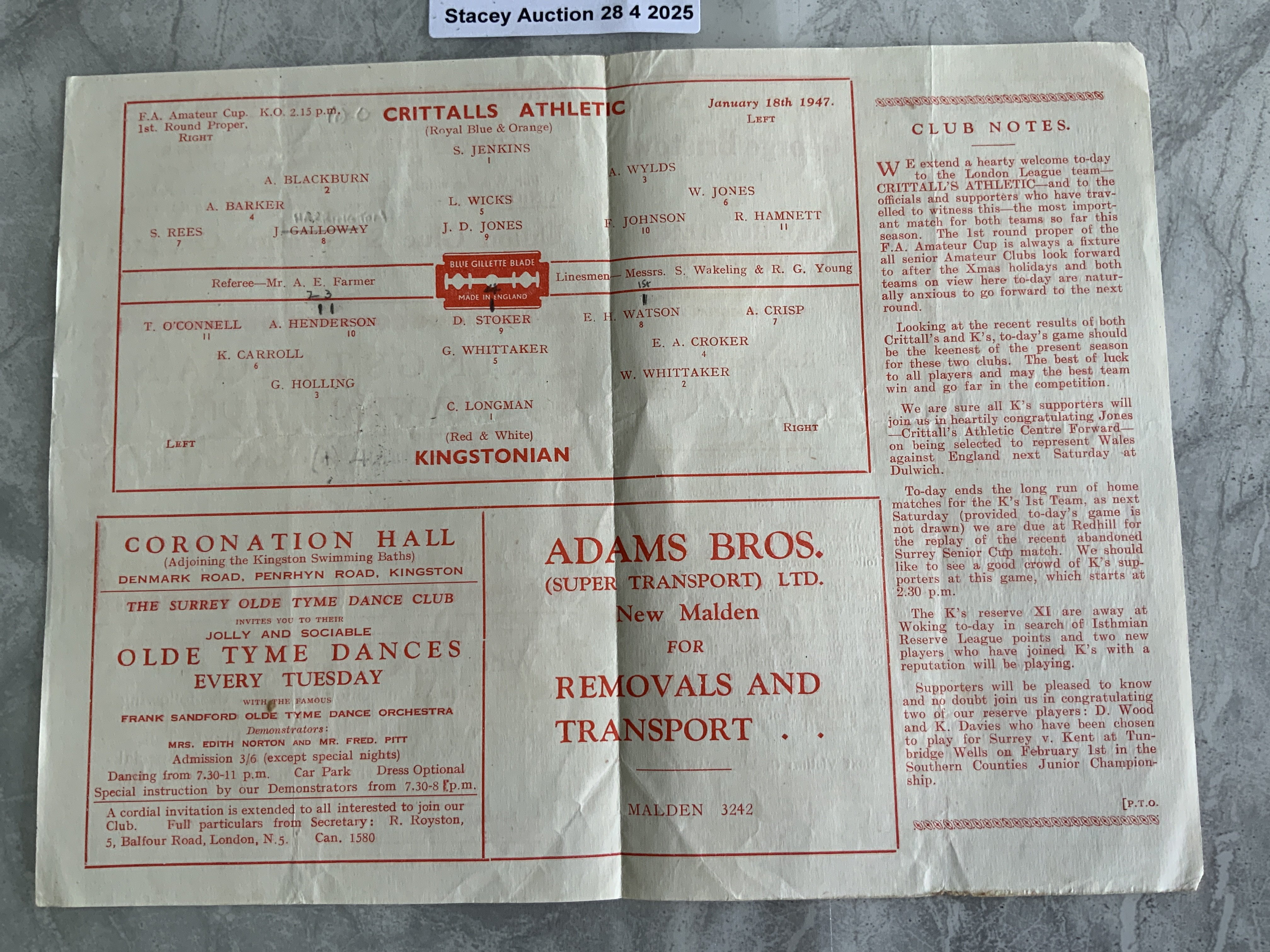 46/47 Kingstonian v Crittalls Athletic Programme: Good condition Amateur Cup programme no team changes but scorers noted. Dated 18 1 1947.