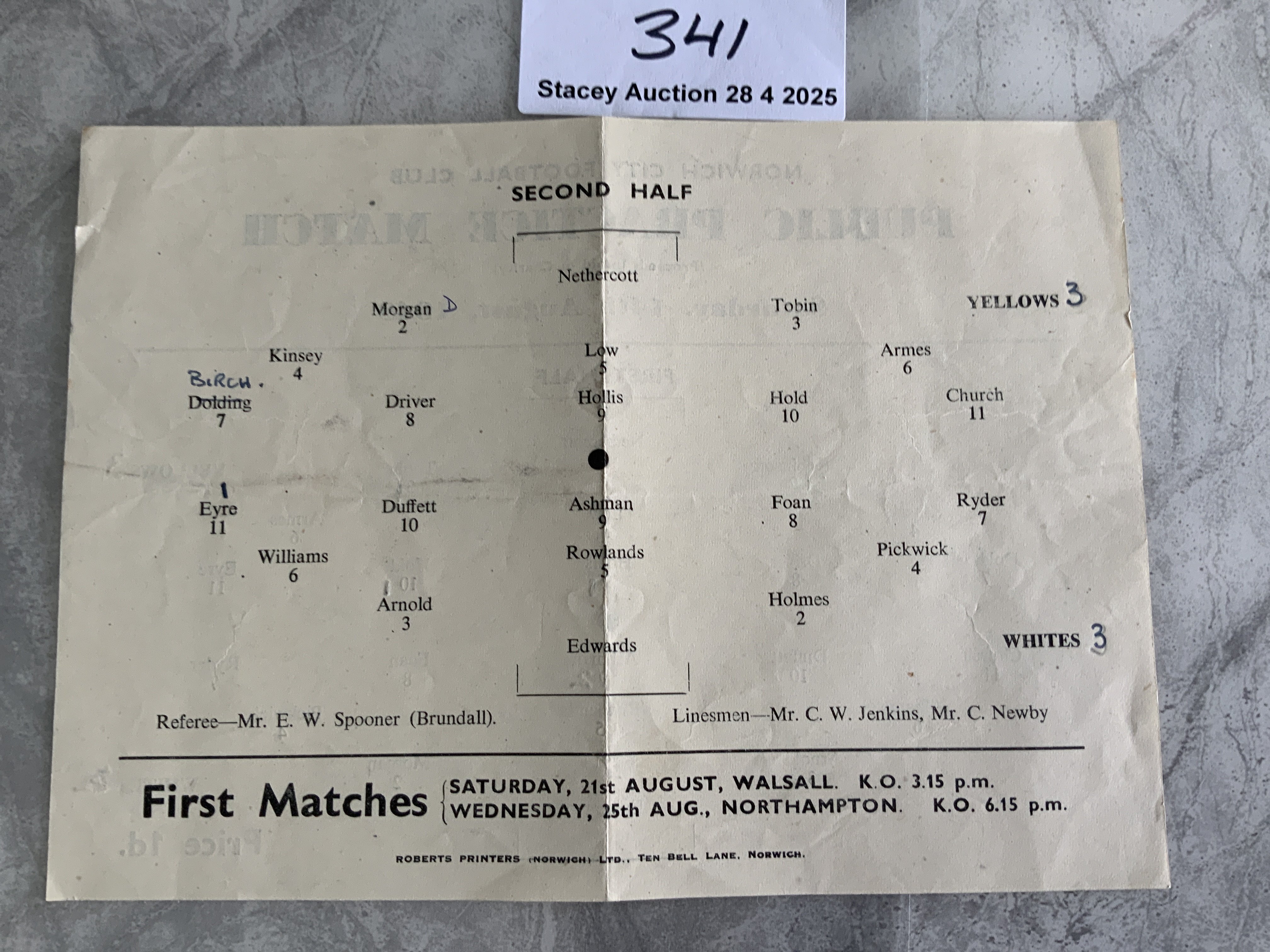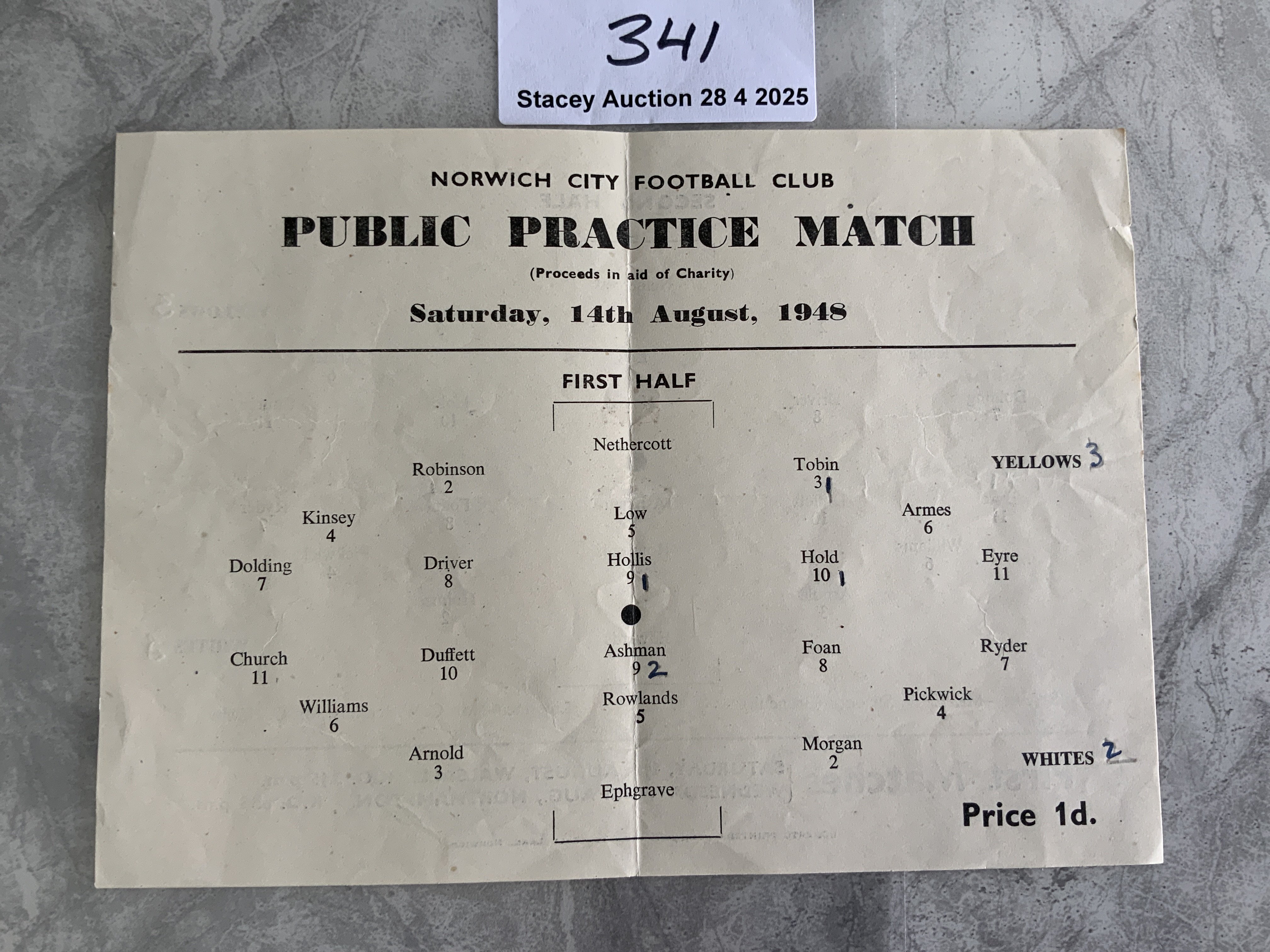 1948 Norwich City Practice Match Football Programme: Good condition single sheet with no team changes but score and scorers noted. Dated 14 8 1948.