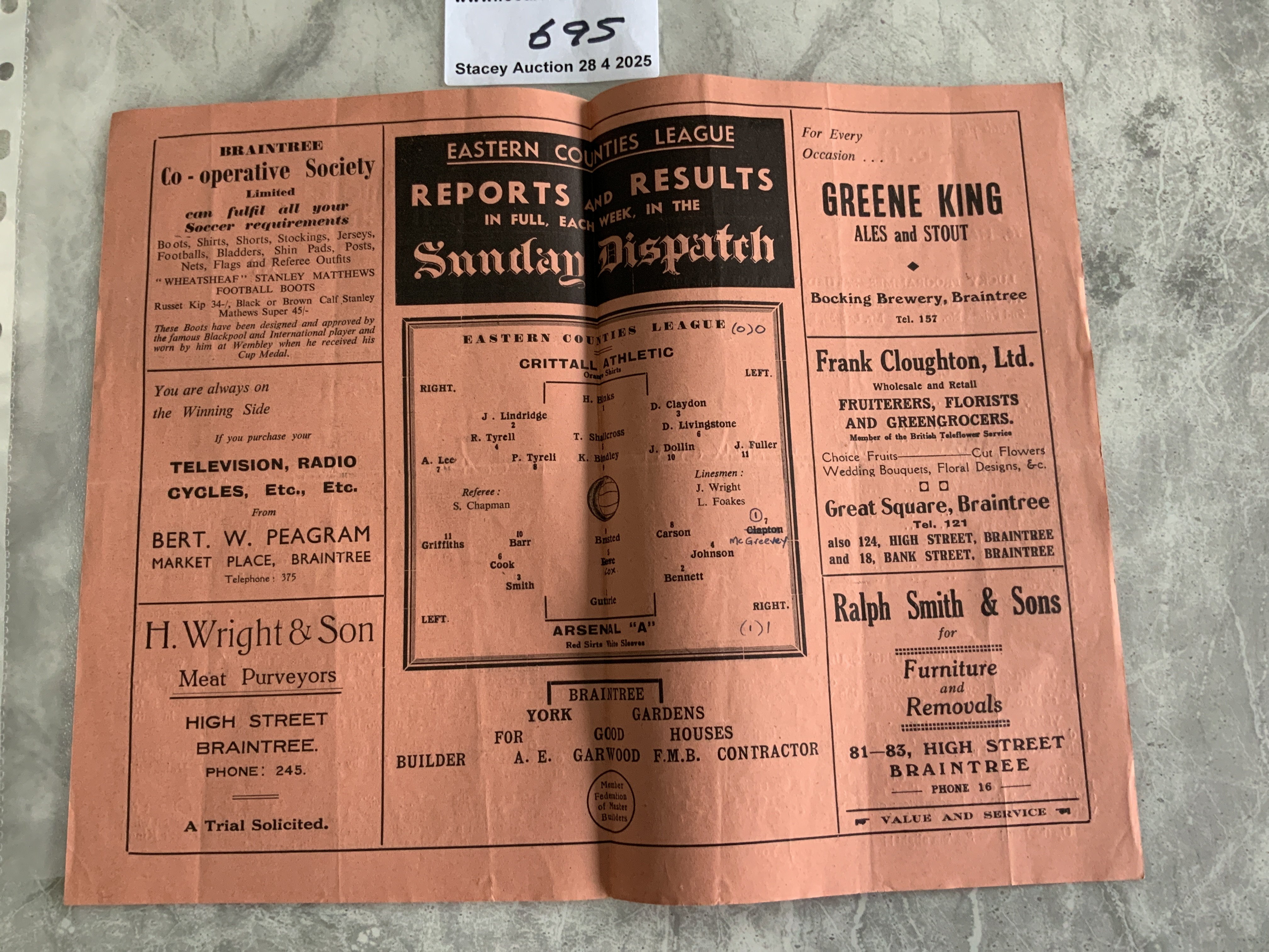 53/54 Crittall Athletic v Arsenal A Football Programme: Very good condition Eastern Counties League programme with one team change and score to team page. Dated 27 3 1954.