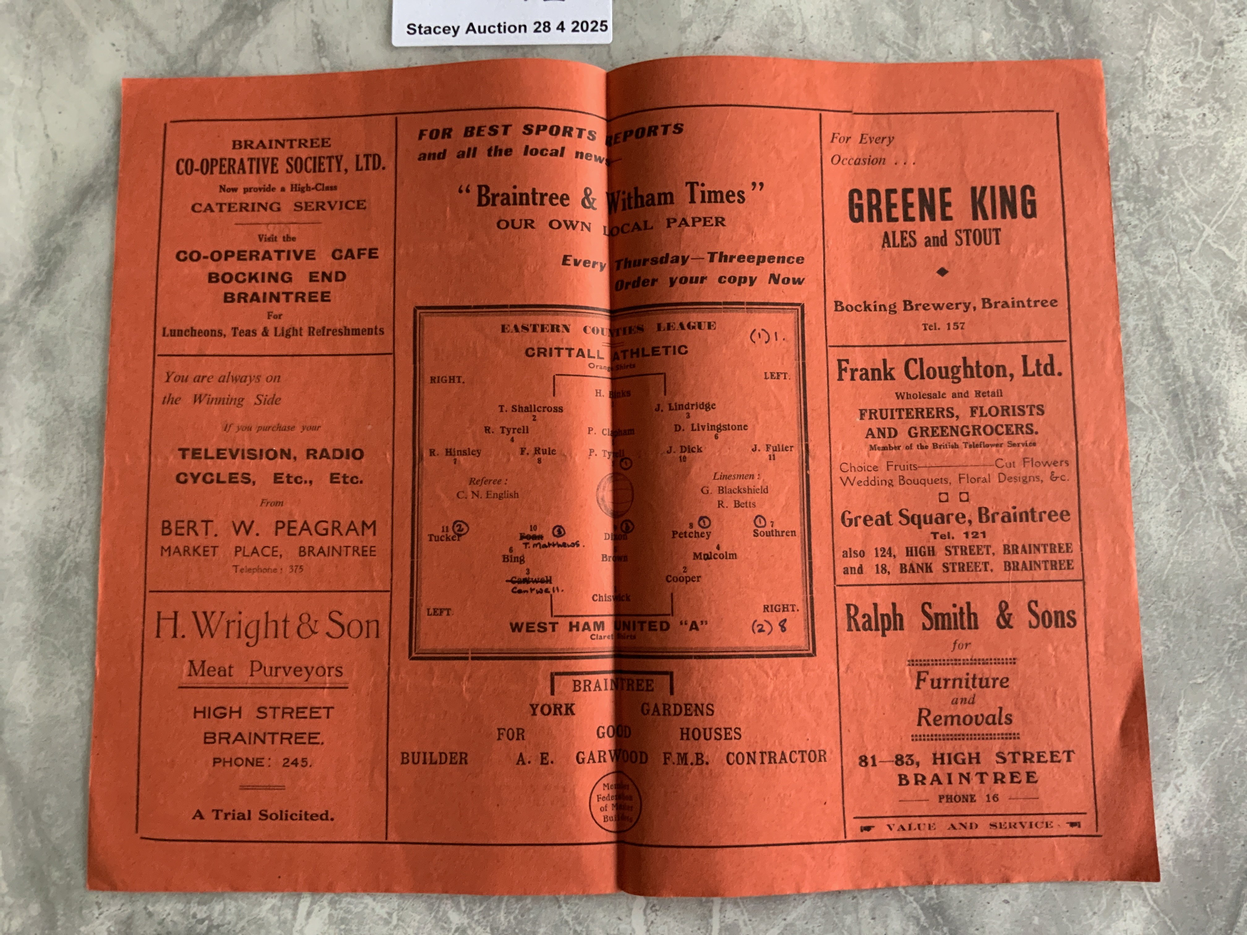 52/53 Crittall Athletic v West Ham A Football Programme: Very good condition Eastern Counties League programme with team changes and score to team page. Dated 14 2 1953.