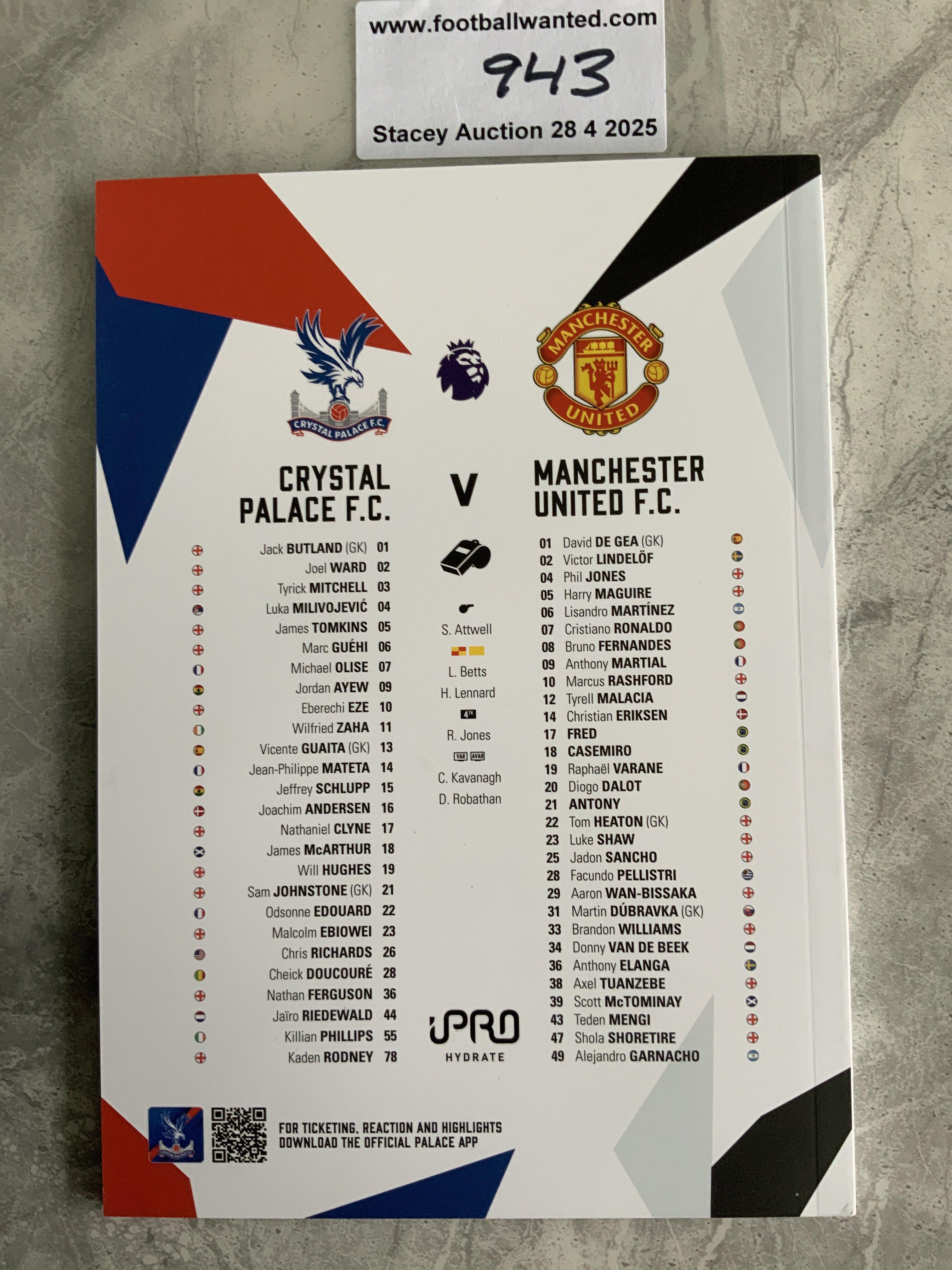 2022 - 2023 Crystal Palace v Manchester United Postponed Football Programme: Mint condition rare programme dated 11 9 2022 for a match that was postponed due to the Queens passing. Not many exist and we are reliably informed that one has sold previously for 1.8k.