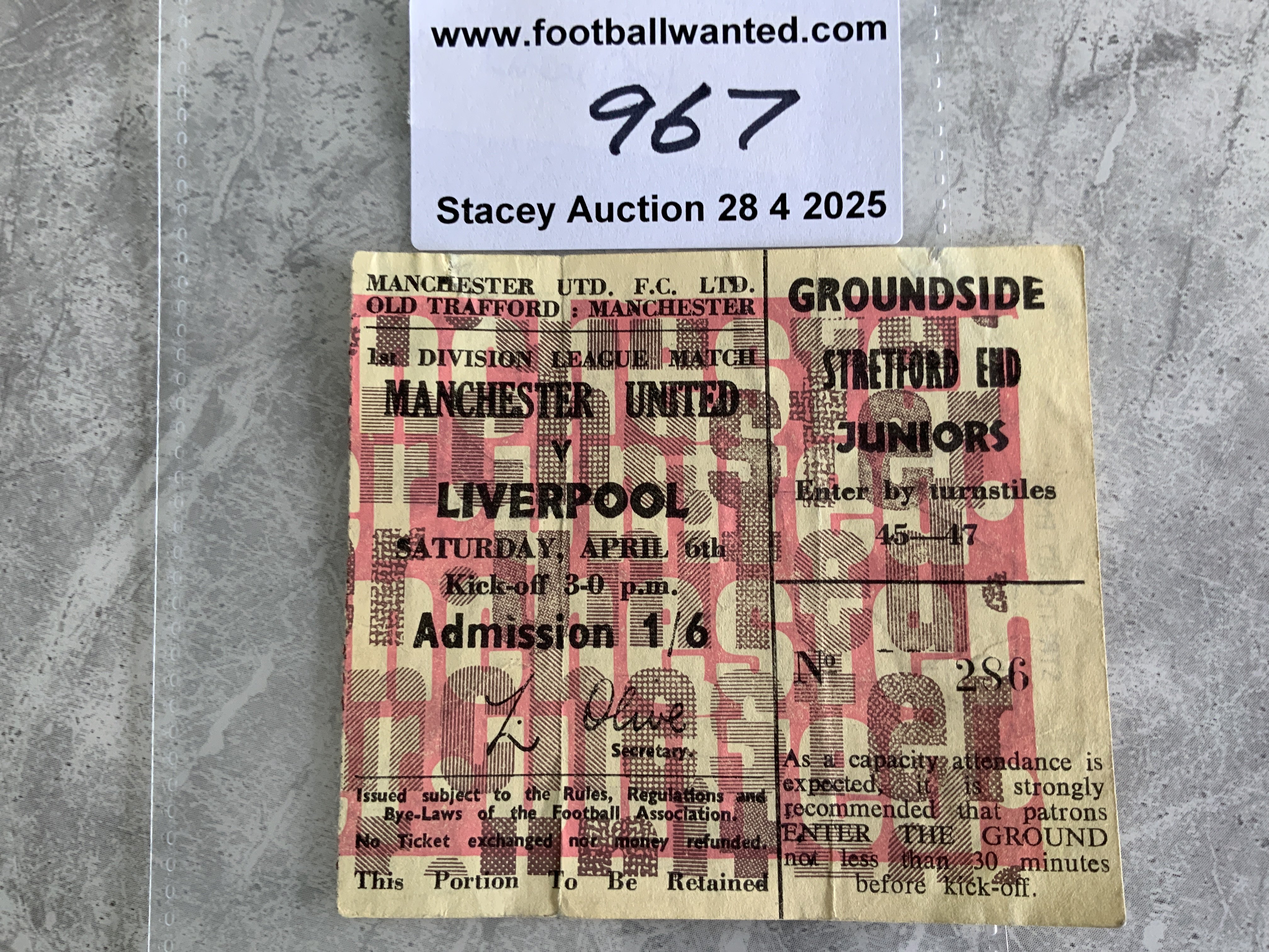 67/68 Manchester United v Liverpool Football Ticket: League match dated 6 4 1968 in good condition. Tiny scuffs to rear indicate possibly previously stuck down.