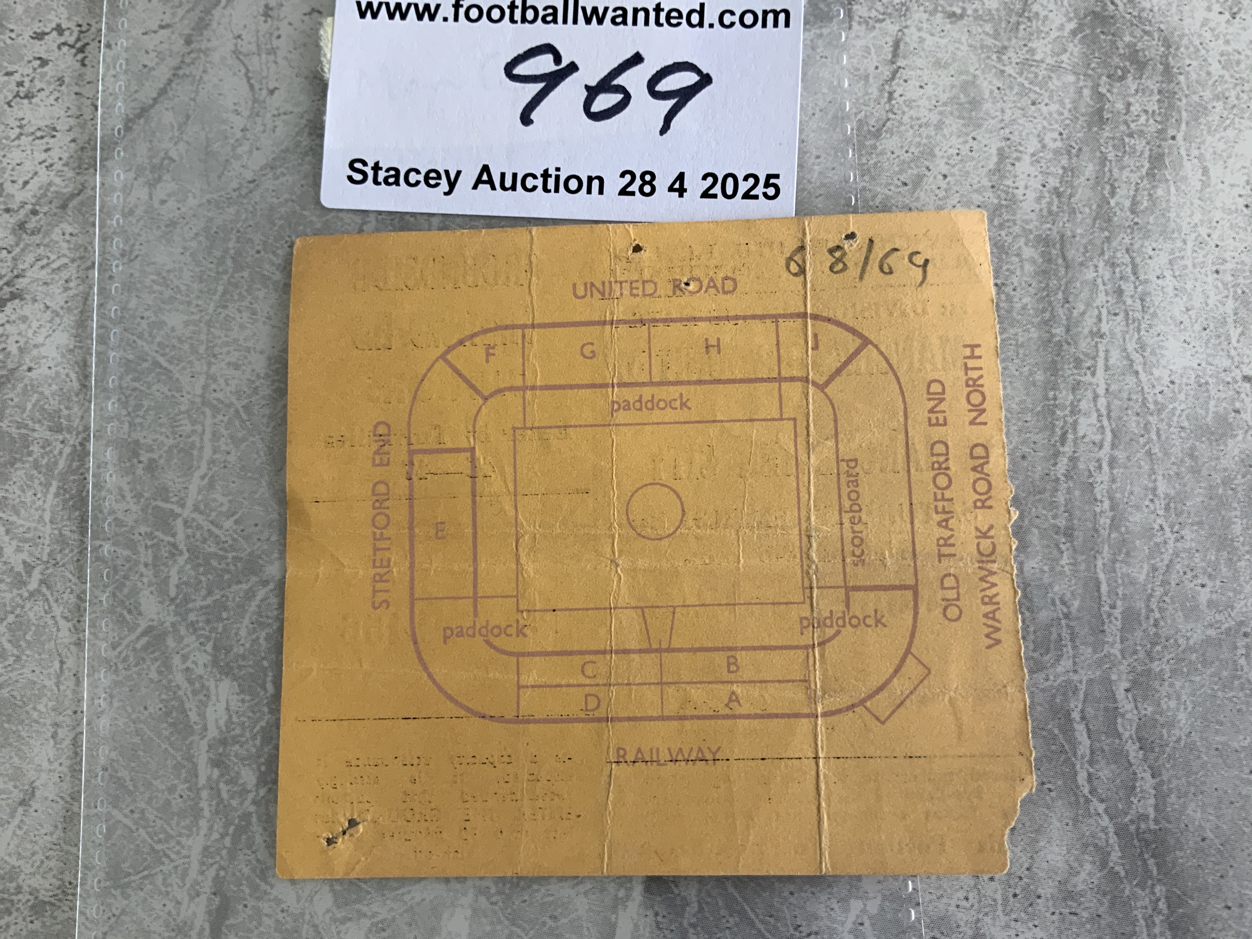 68/69 Manchester United v Manchester City Football Ticket: League match dated 8 3 1969 in fair condition. Tiny piece out of corner and pin holes.