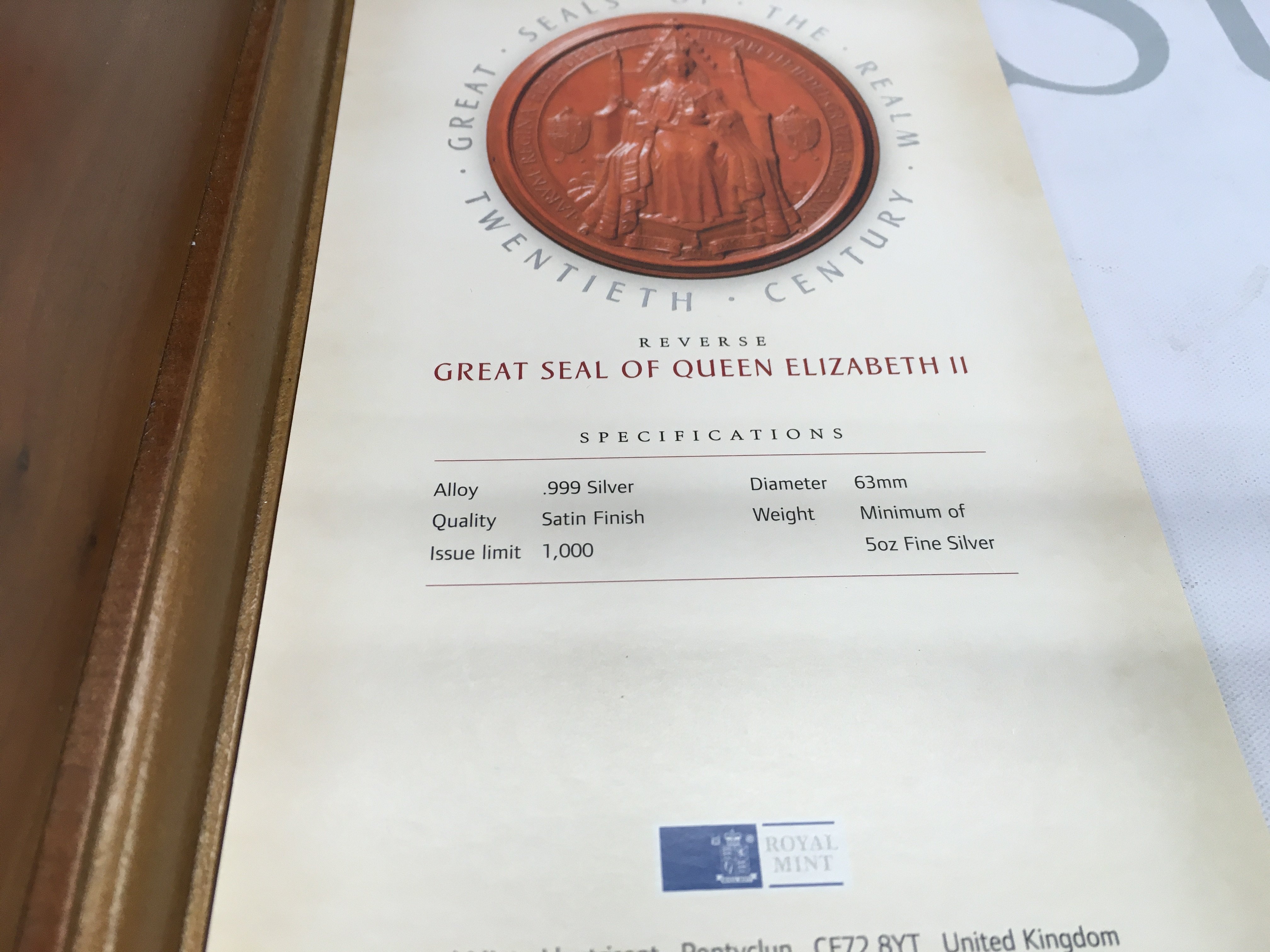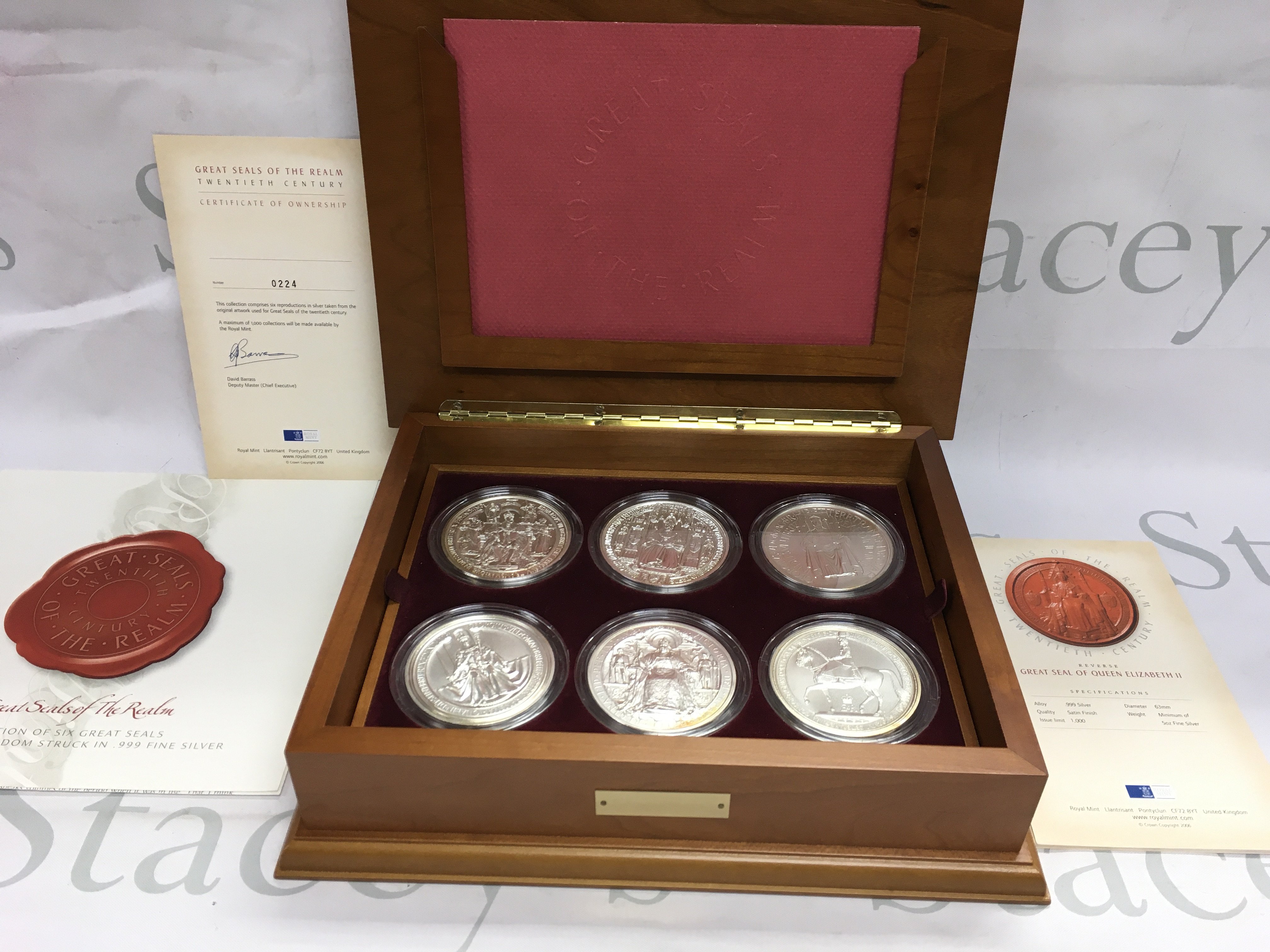 A collection of six 5oz fine silver satin finish coins featuring great seals of the realms. Postage B