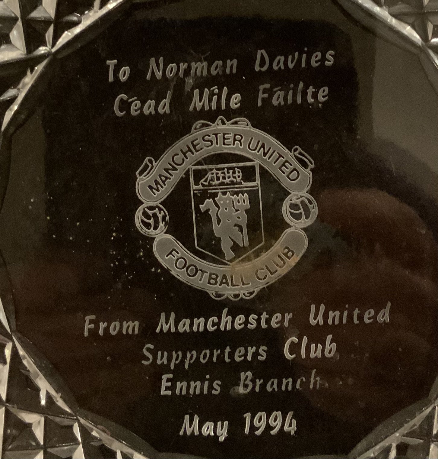 1994 Manchester United Crystal Plate: Presented to Norman Davies kit man from the Ennis branch of the Manchester United supporters club May 1994.