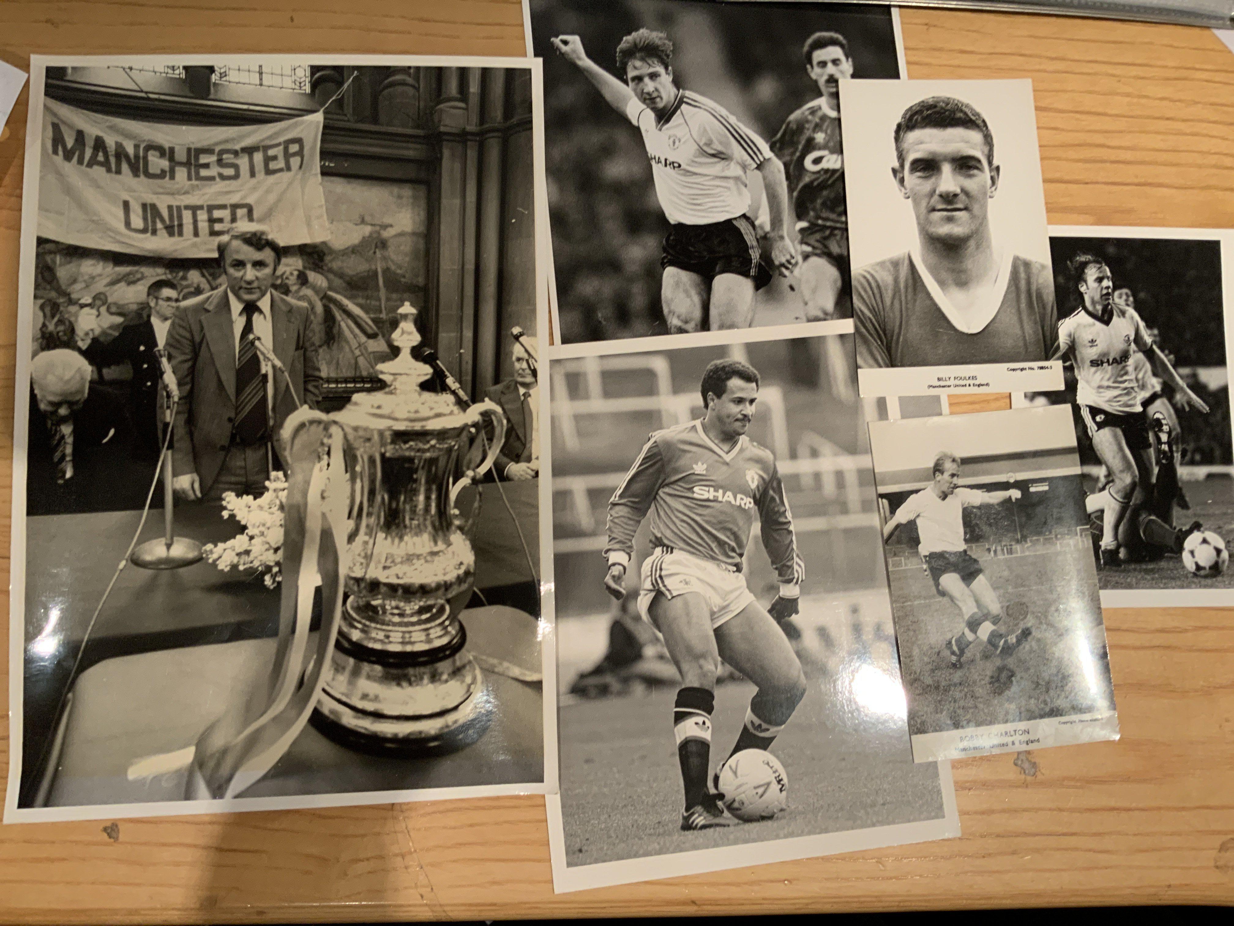 Manchester United Football Photos: 3 postcards with signatures to rear of Foulkes Strachan and Buchan, Tommy Docherty with FA Cup press photo and a few more. Instructions to sell.