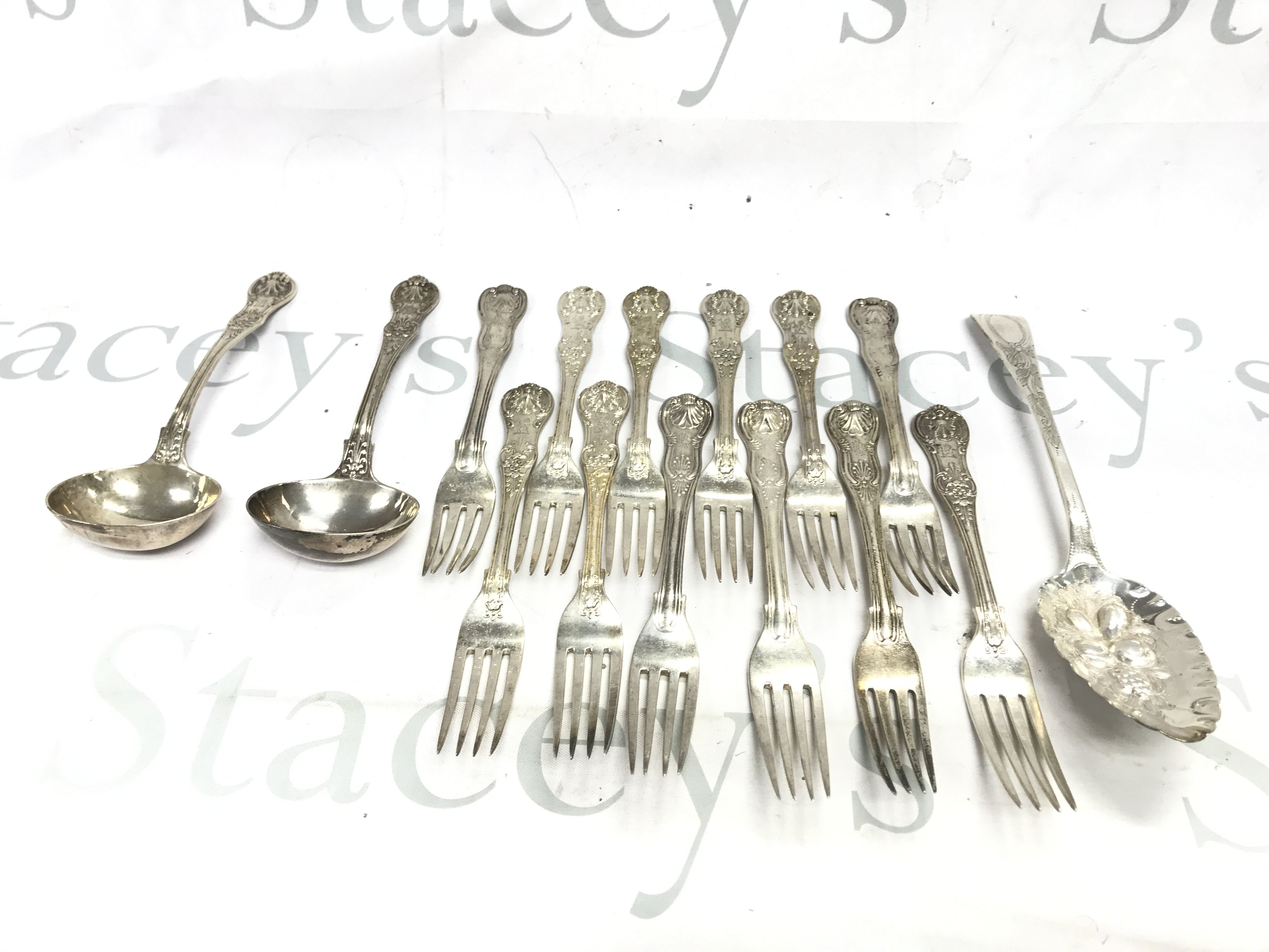 A collection of hallmarked silver cutlery including a vintage berry spoon. 1055g total. Postage B