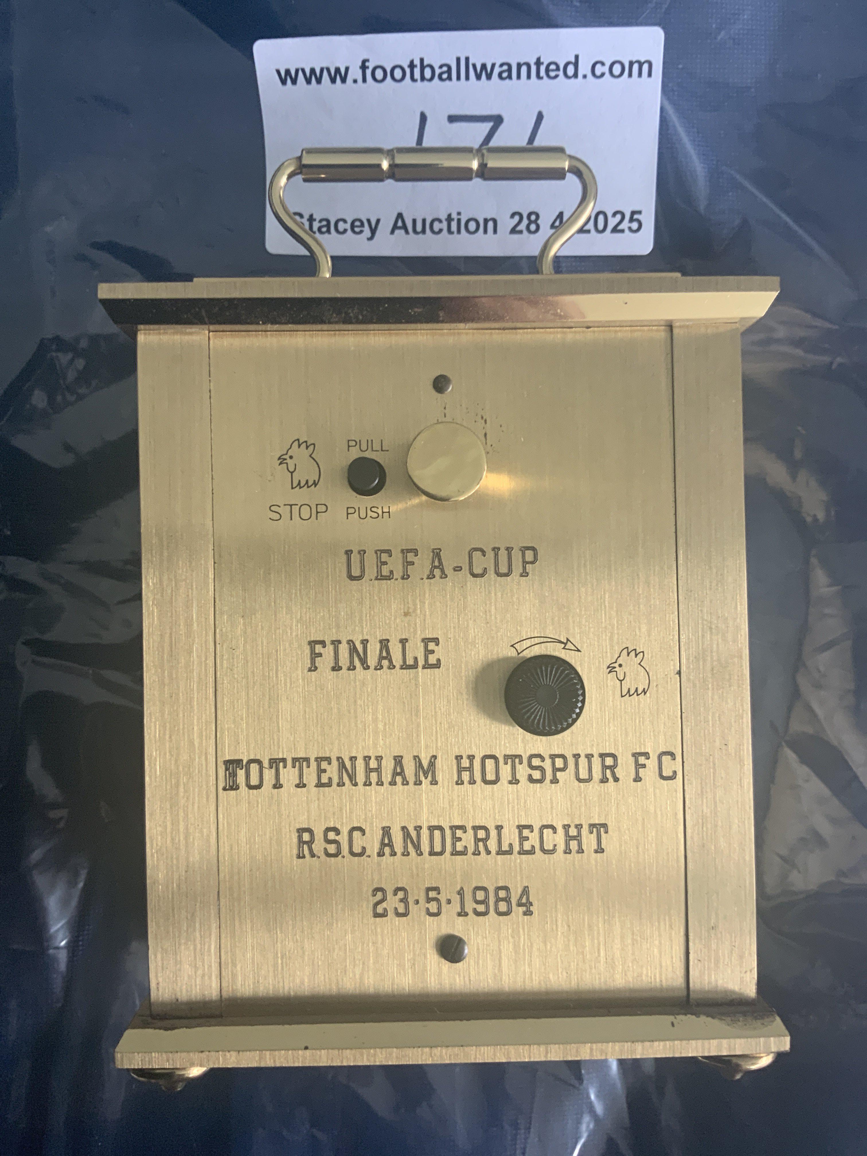 Tottenham 1984 UEFA Cup Final Football Gift: Incredibly rare carriage clock was not even given to players. Swiss made heavy clock is engraved to rear UEFA Cup Finale Tottenham FC RSC Anderlecht 23 5 1984. This was the second leg in which another draw forced penalties which Spurs won. Anderlechts gift to Tottenham given to club secretary Peter Barnes.