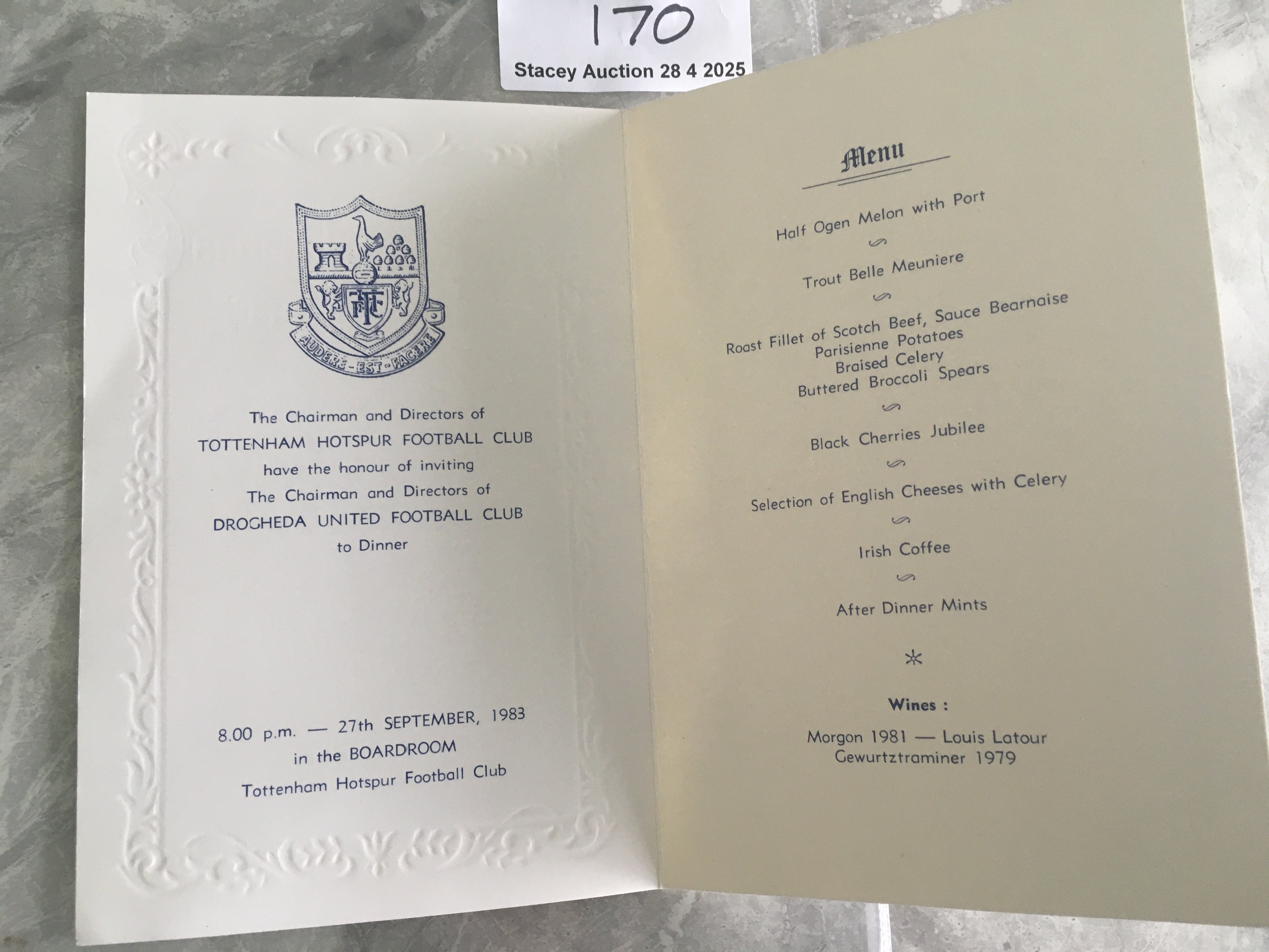 1983 Tottenham v Drogheda Football Menu: UEFA Cup match from September 1983. Inside is an invite from the directors of Spurs to the boardroom the day before the match. Rare item previously owned by Spurs club secretary Peter Barnes.