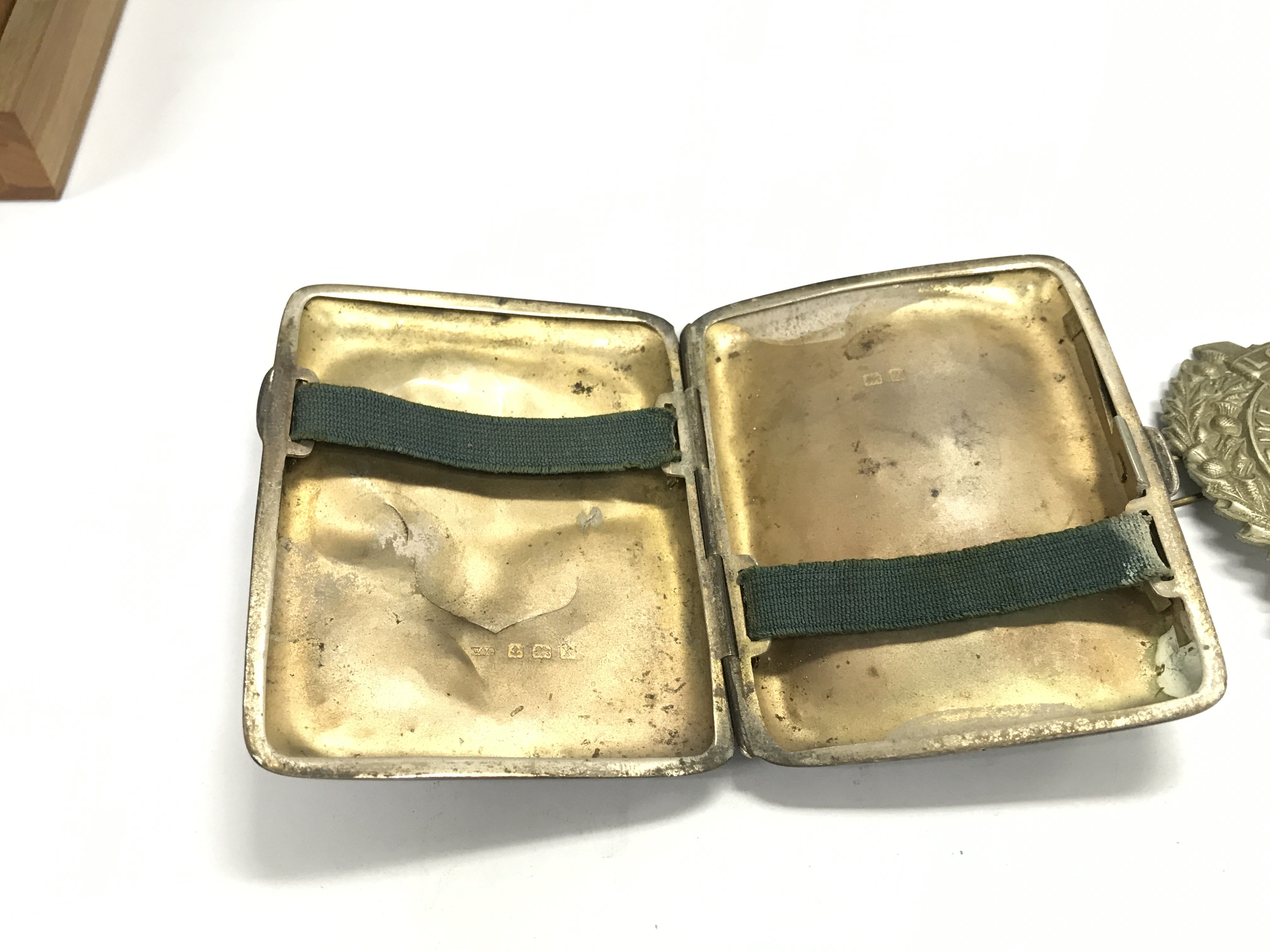 A silver cigarette case and London Scottish regiment cap badge. Postage B