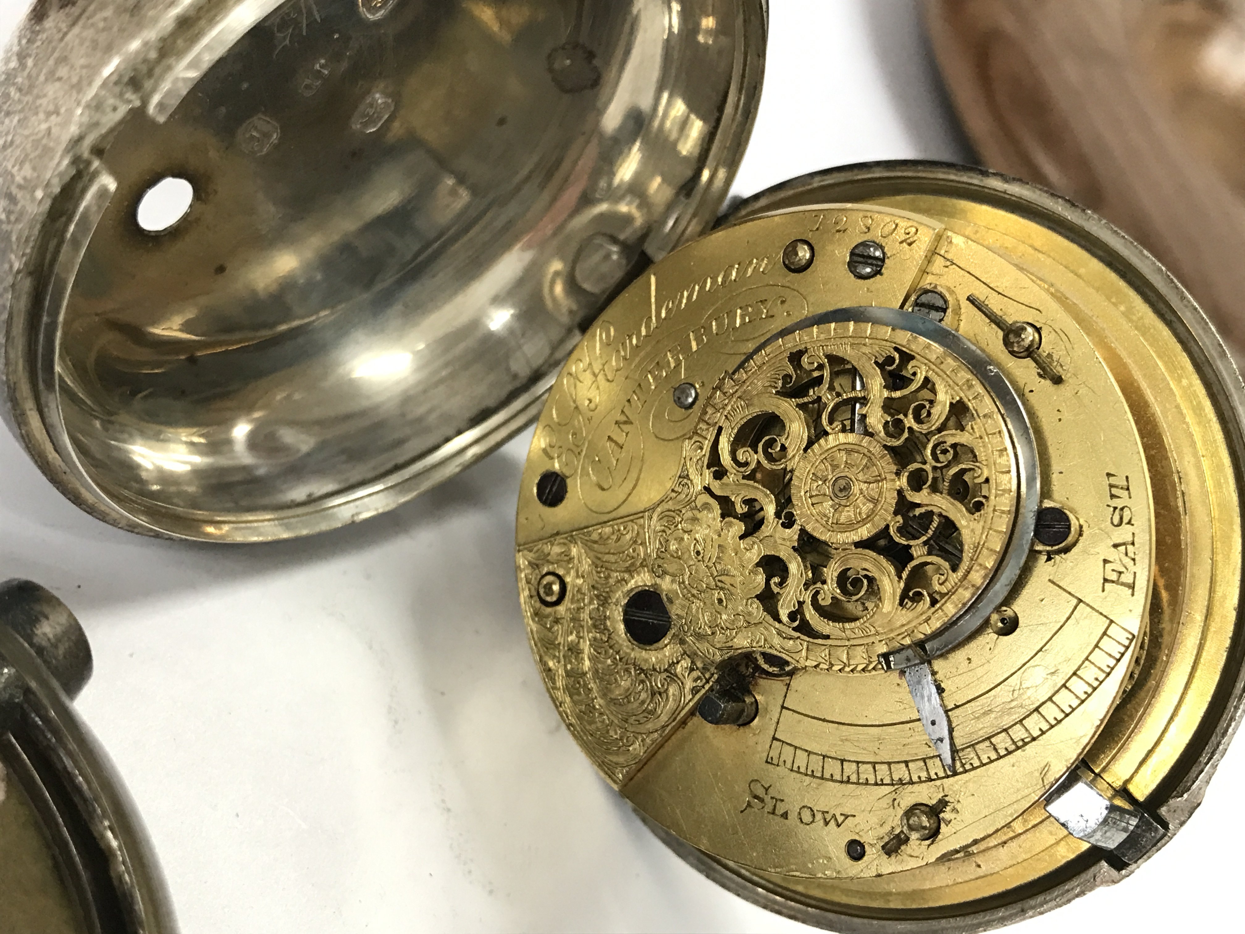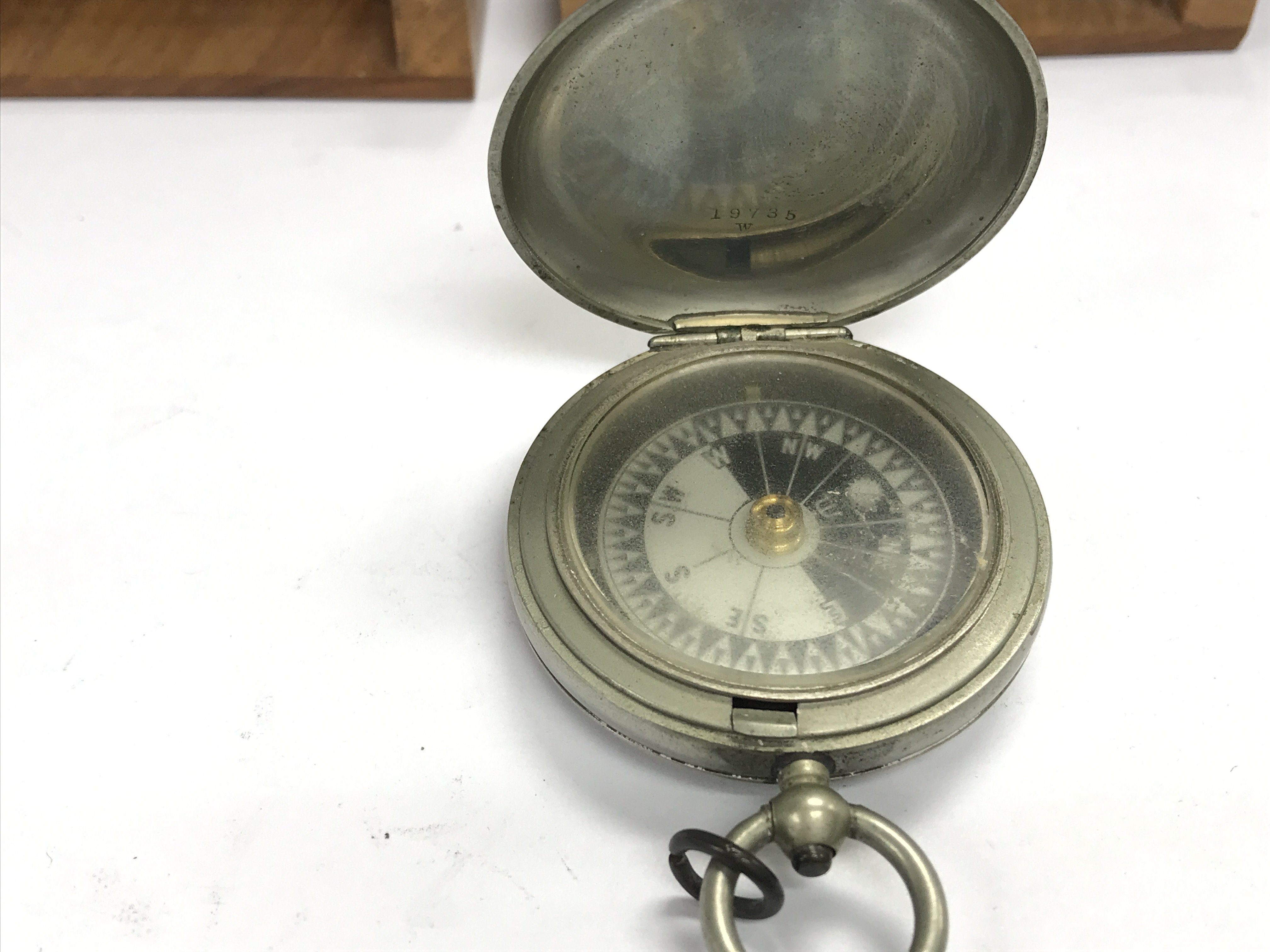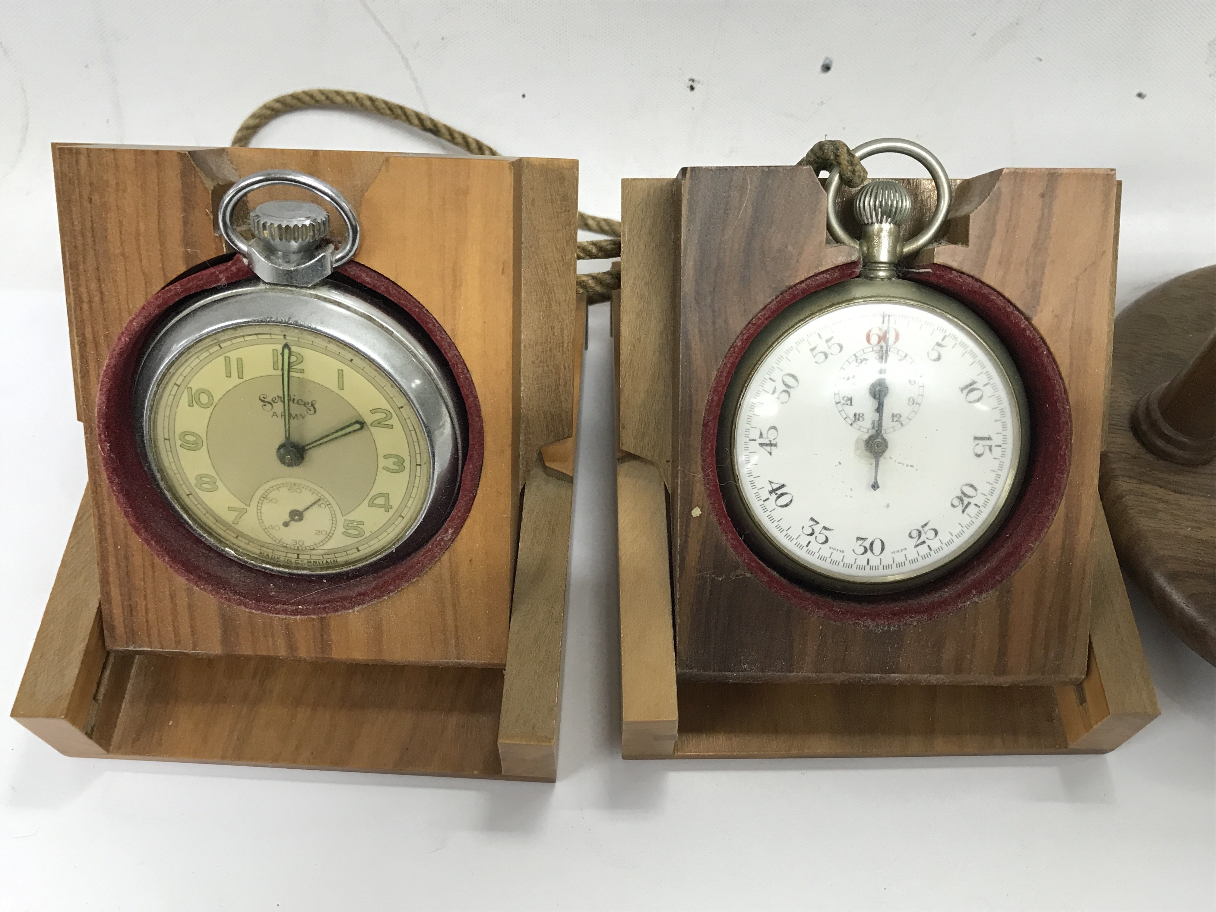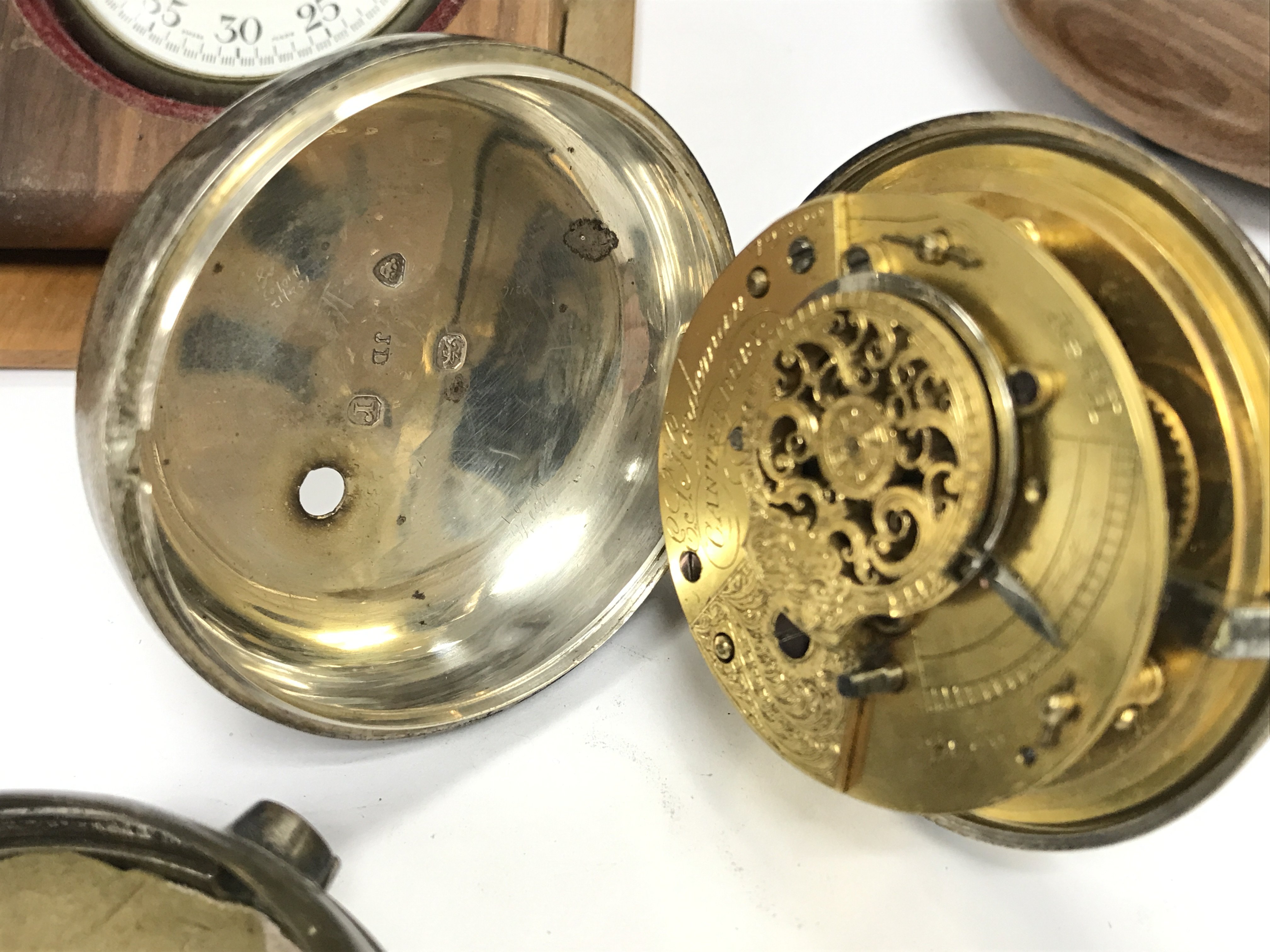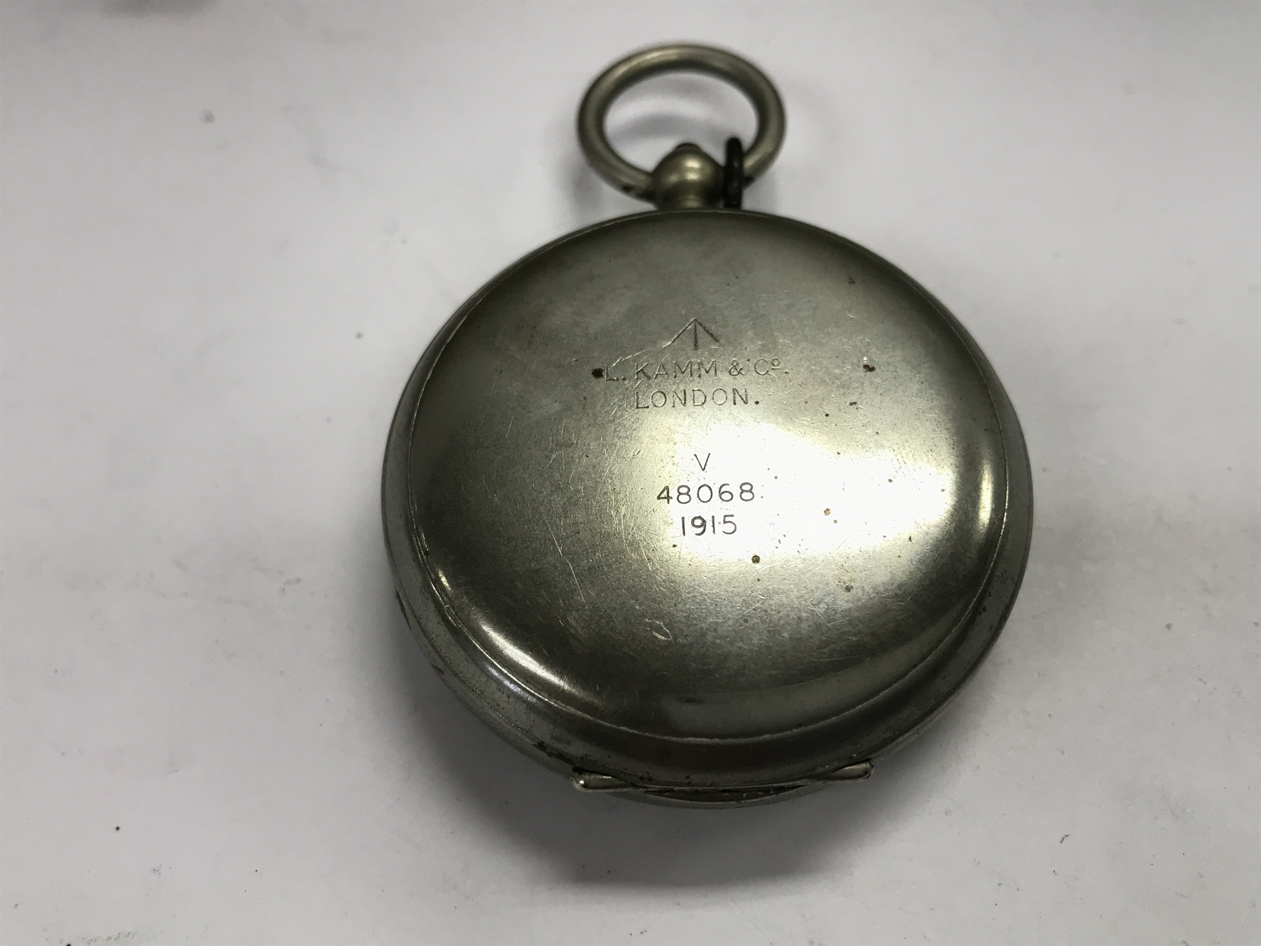 A collection of pocket watches including a silver example. Also contains a L Kama 1915 military issue compass. Postage B
